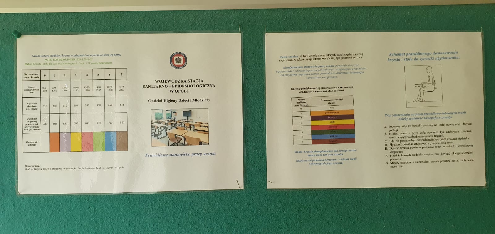 W ramach akcji zostały również wywieszone w pokojach nauczycielskich naszych szkół zalecenia Wojewódzkiej Stacji Sanitarno- Epidemiologicznej w Opolu dotyczące zasad doboru stolików i krzeseł w zależności od wzrostu uczniów oraz schemat prawidłowego dostosowania krzeseł i stołów do sylwetki uczniów.