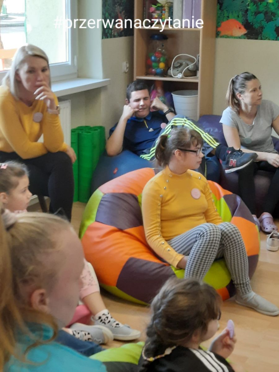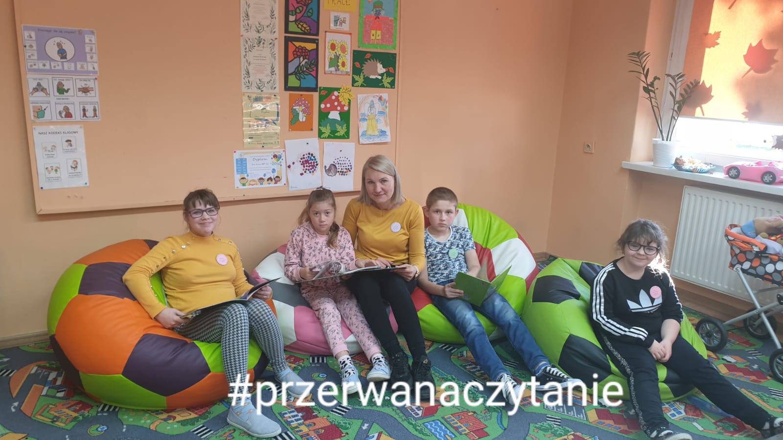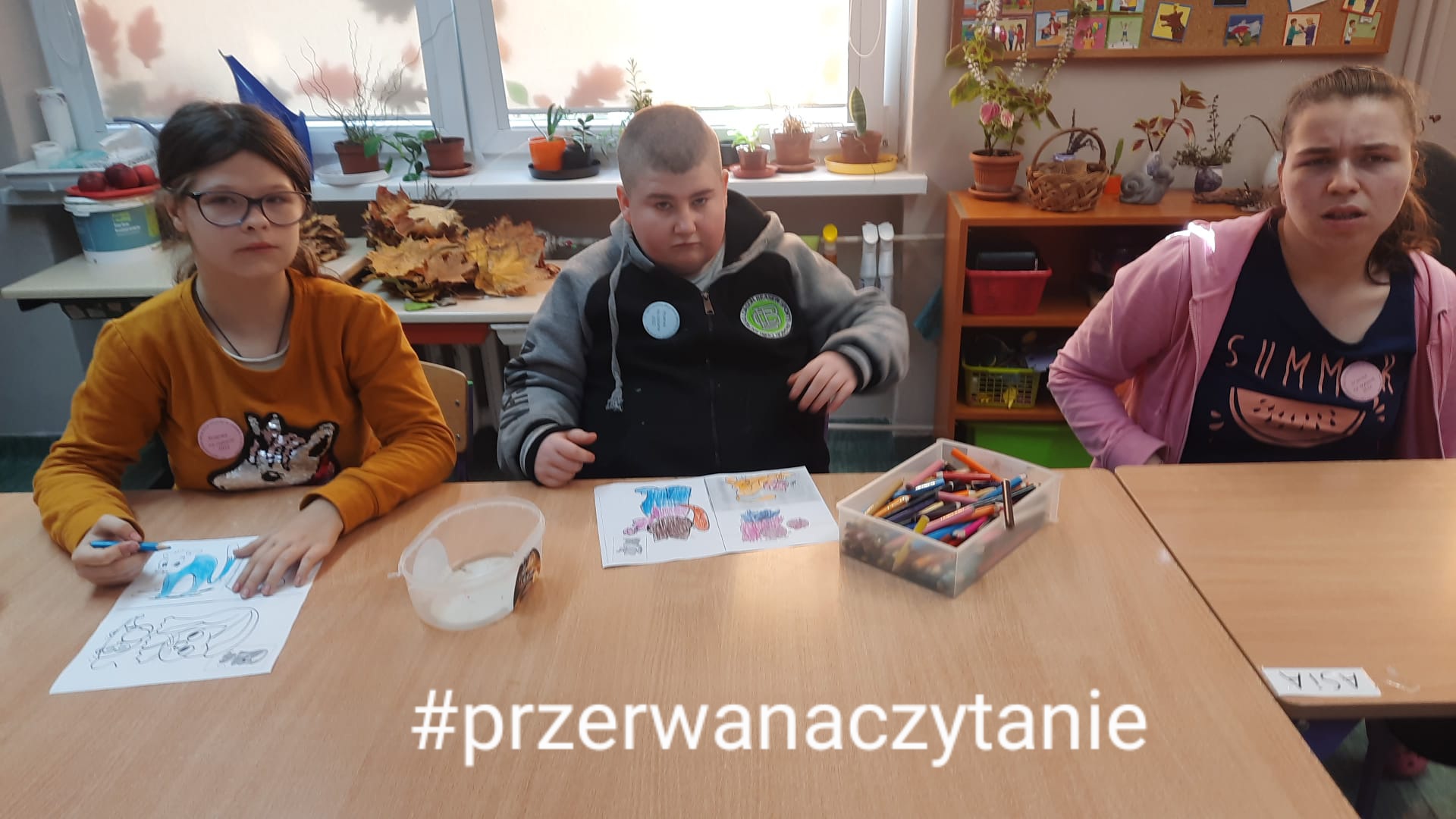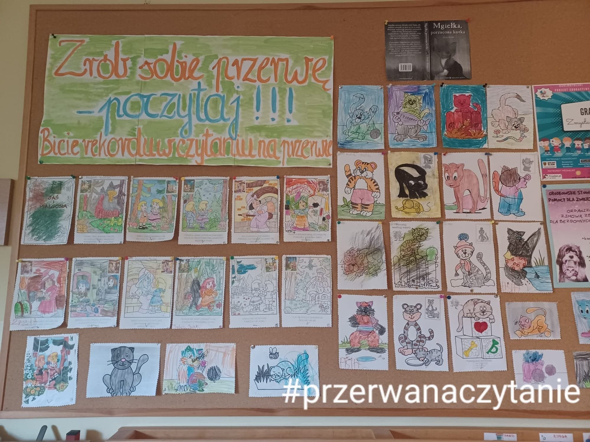 Wszyscy czytaliśmy baśnie, książki o zwierzętach, a także fragmenty lektur i literatury pięknej - „dla każdego coś miłego”. Dodatkowo czytane treści ilustrowały prezentacje i przygotowane obrazki i kolorowanki, z których powstała gazetka ścienna: „Zrób sobie przerwę – POCZYTAJ!!!”.