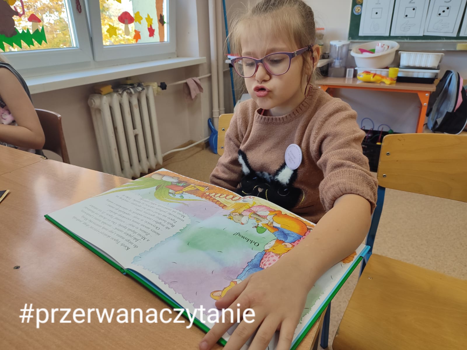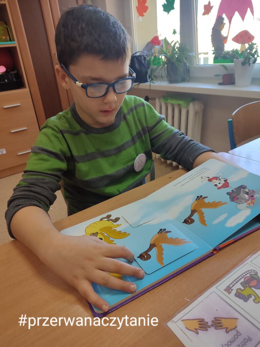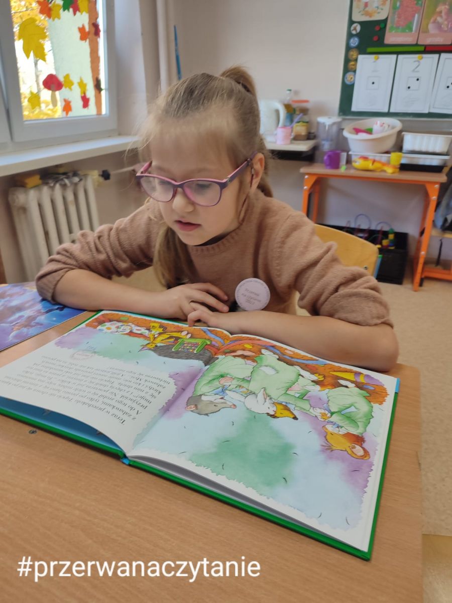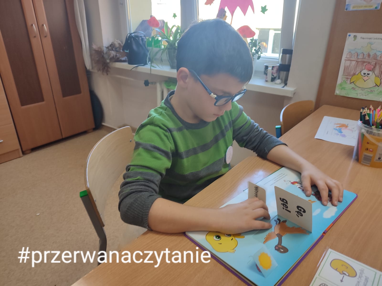 Wszyscy czytaliśmy baśnie, książki o zwierzętach, a także fragmenty lektur i literatury pięknej - „dla każdego coś miłego”. Dodatkowo czytane treści ilustrowały prezentacje i przygotowane obrazki i kolorowanki, z których powstała gazetka ścienna: „Zrób sobie przerwę – POCZYTAJ!!!”.