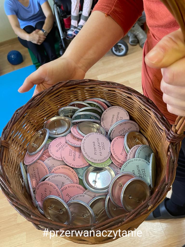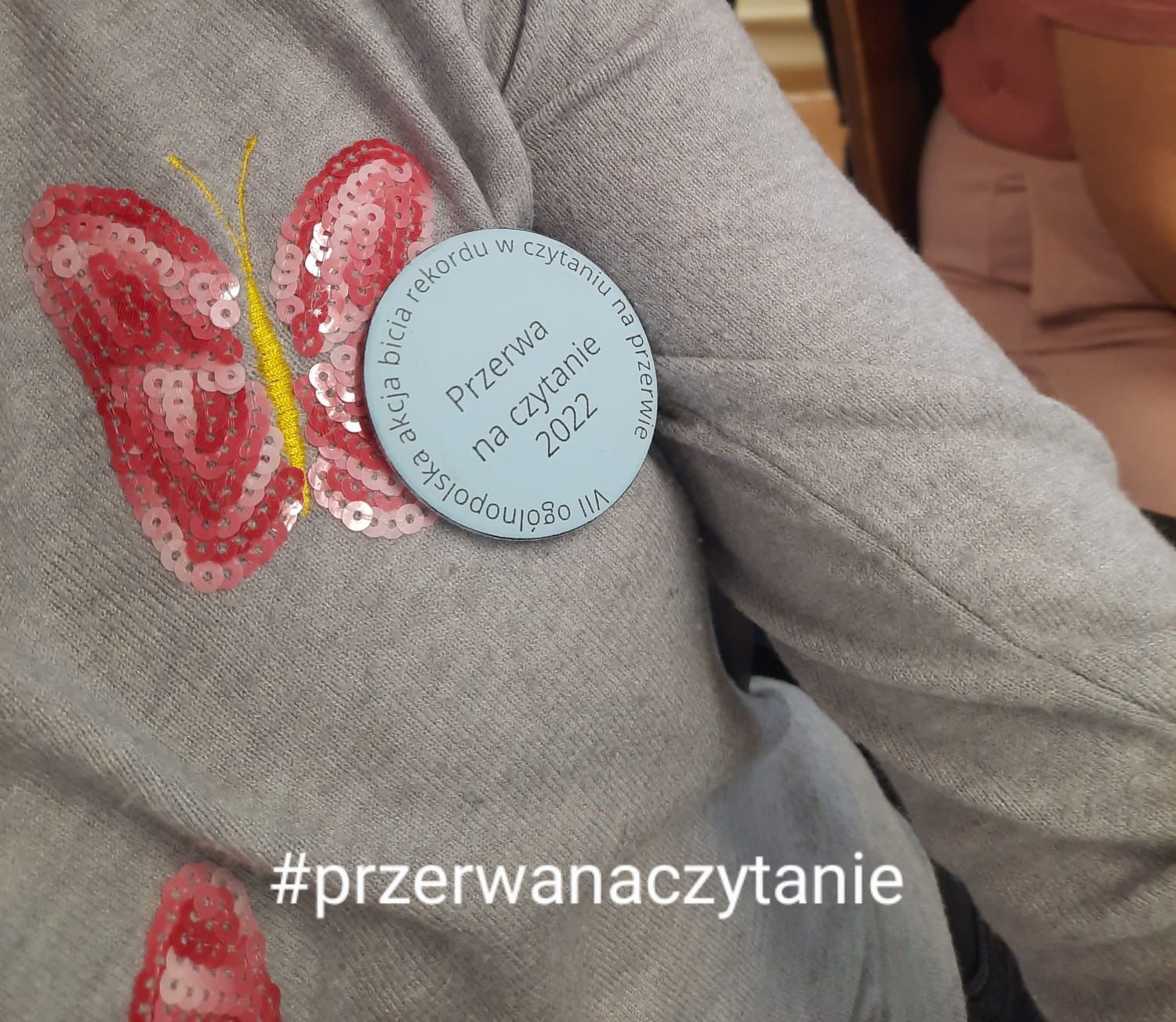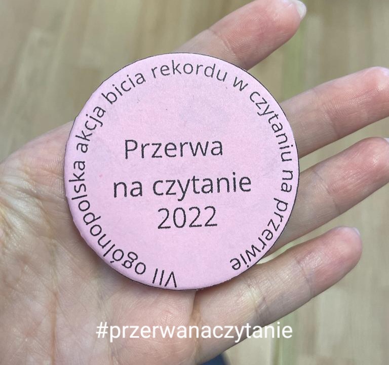 Na koniec każdy uczestnik, a było Ich siedemdziesięciu pięciu, otrzymał pamiątkową odznakę „Przerwa na czytanie – bicie rekordu w czytaniu na przerwie 2022”. Dziękujemy WSZYSTKIM za zaangażowanie i udział w akcji. RAZEM POBILIŚMY REKORD!!!