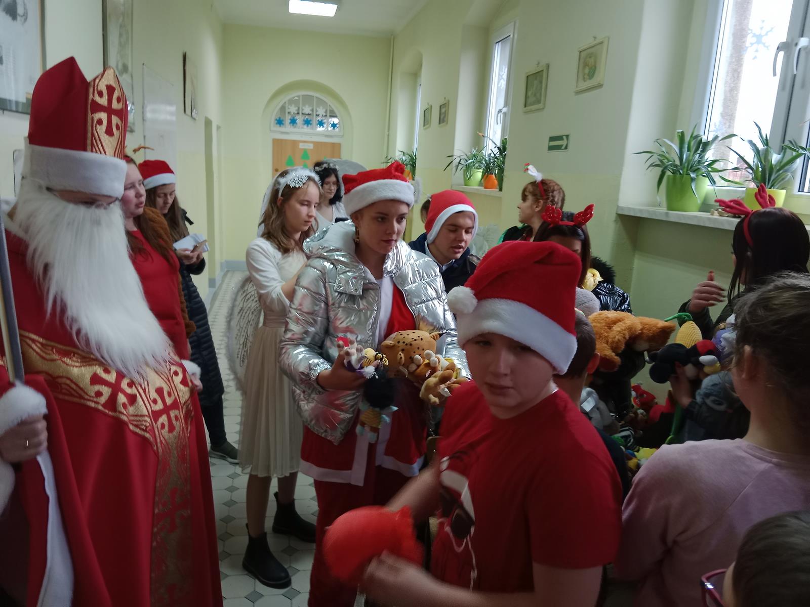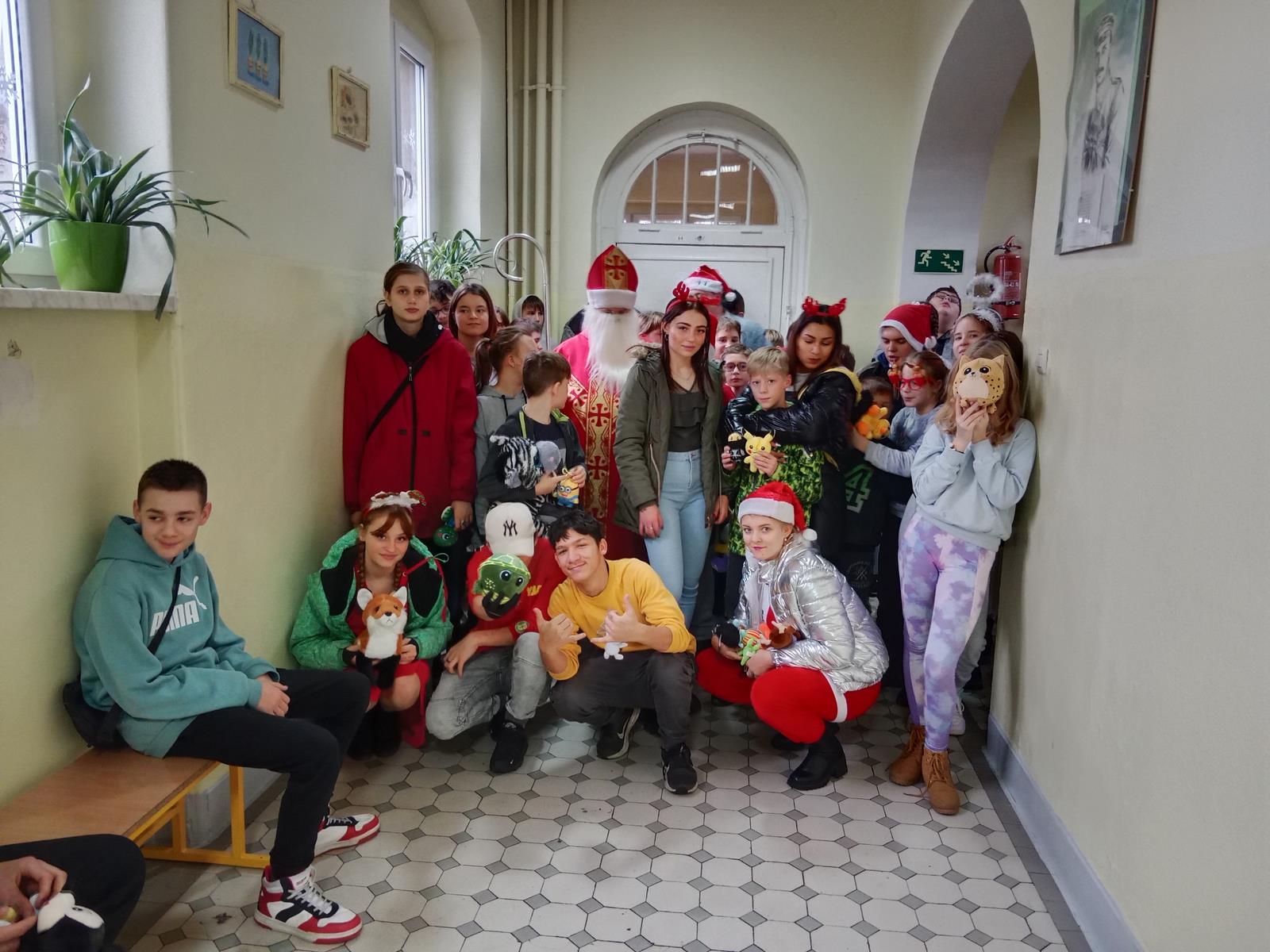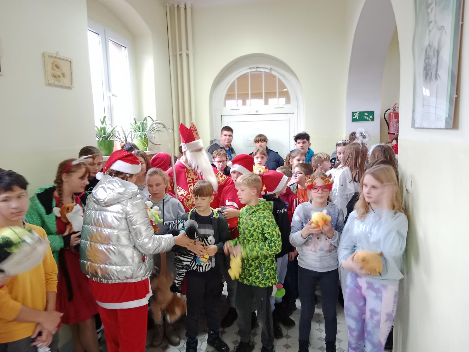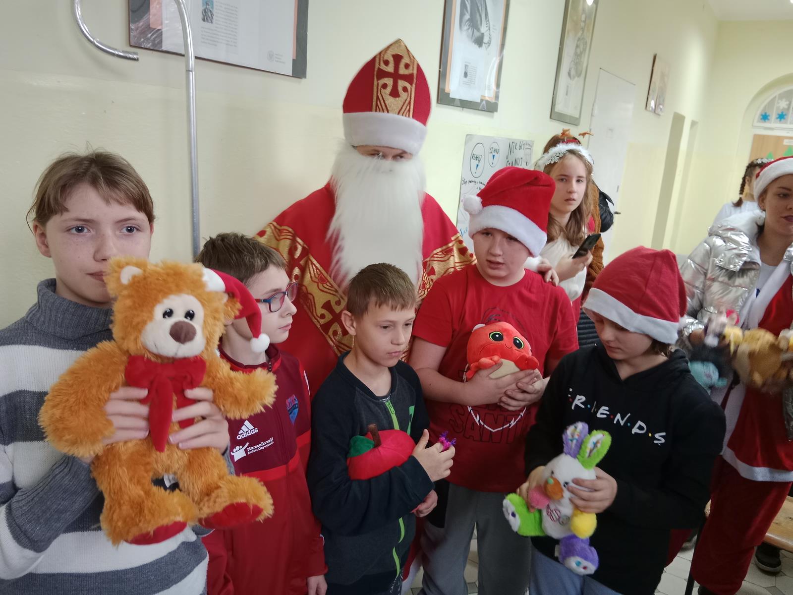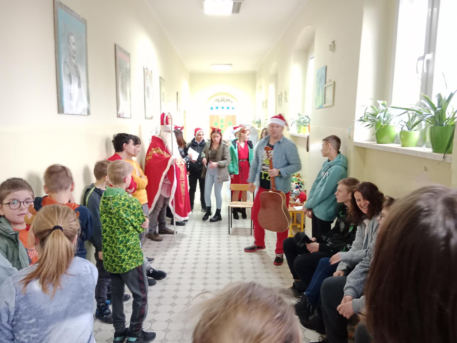 Już od progu drzwi wejściowych rozbrzmiewały dzwonki św. Mikołaja. Wszyscy uczniowie wyszli z klas i zebrali się na szkolnym korytarzu. Mikołaj wraz z pomocnikami serdecznie przywitali zgromadzonych i rozdali prezenty.
