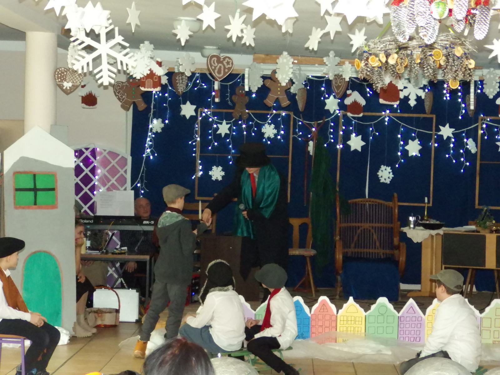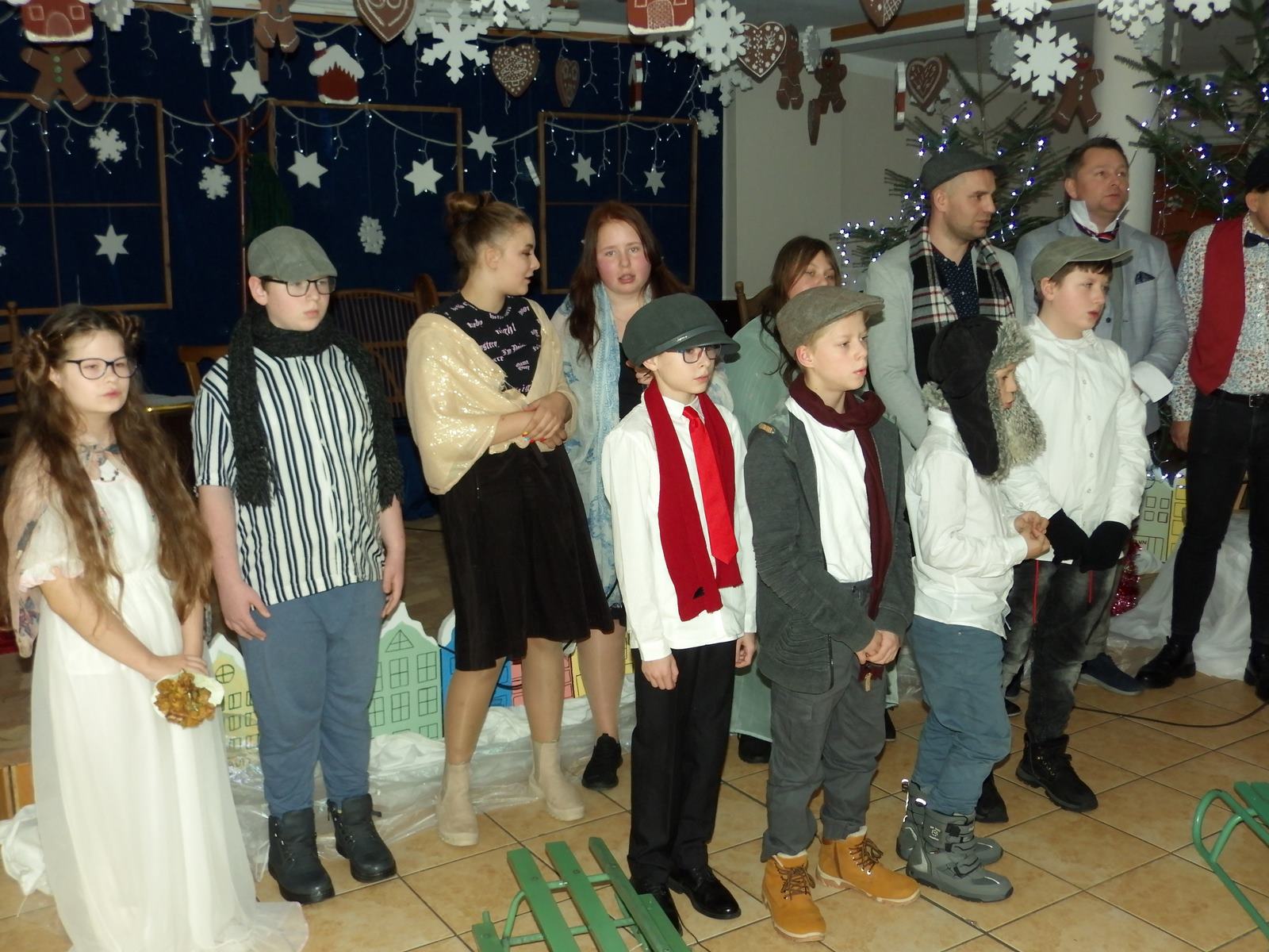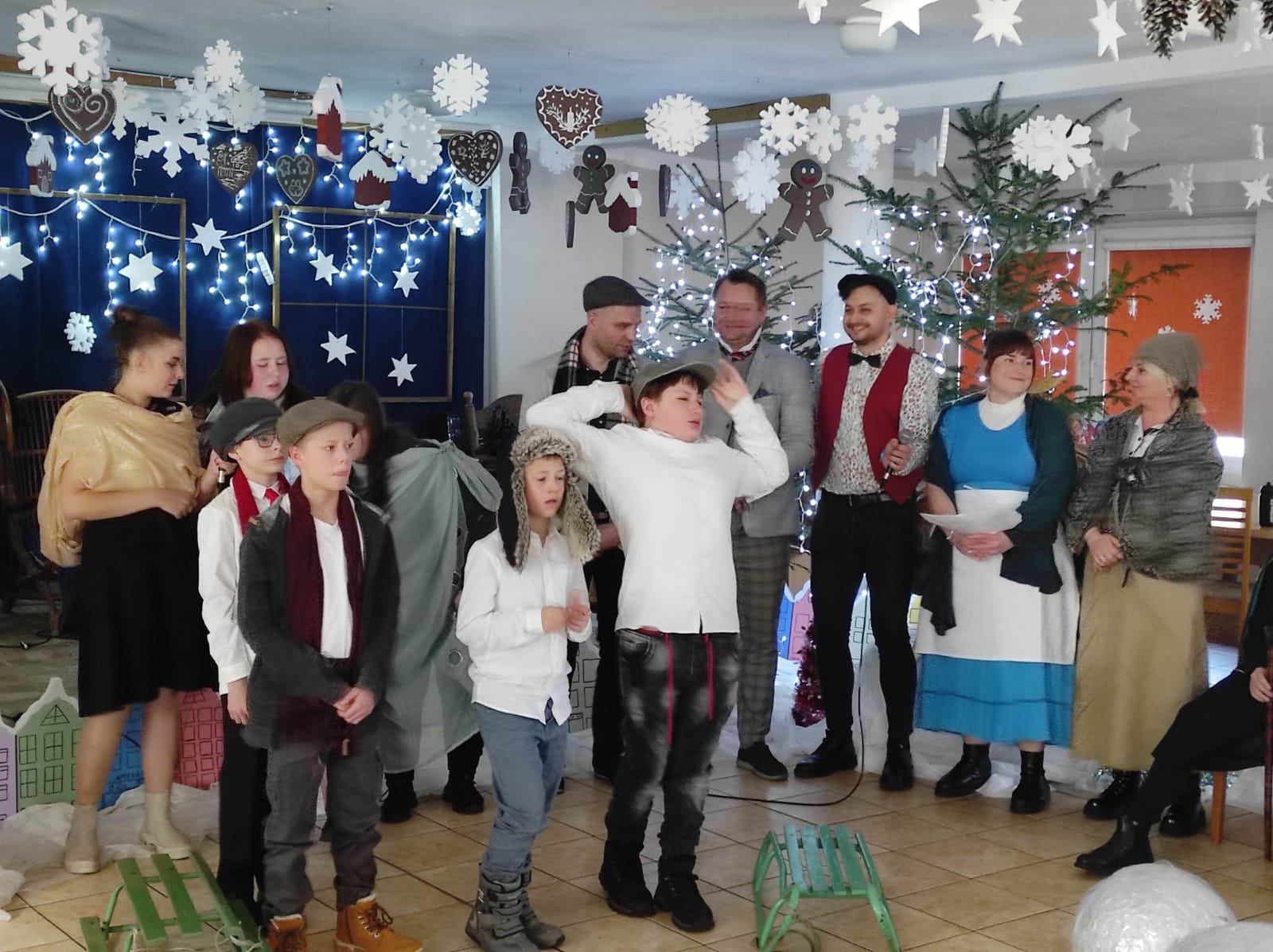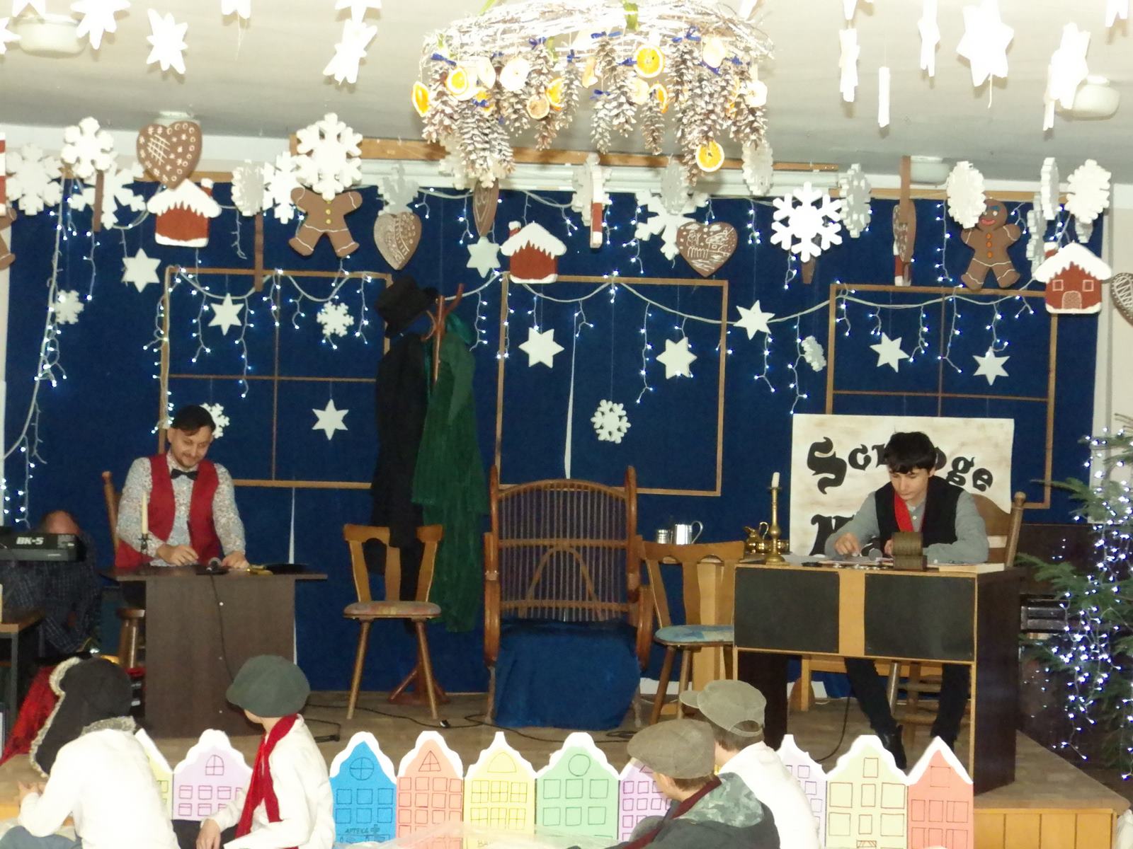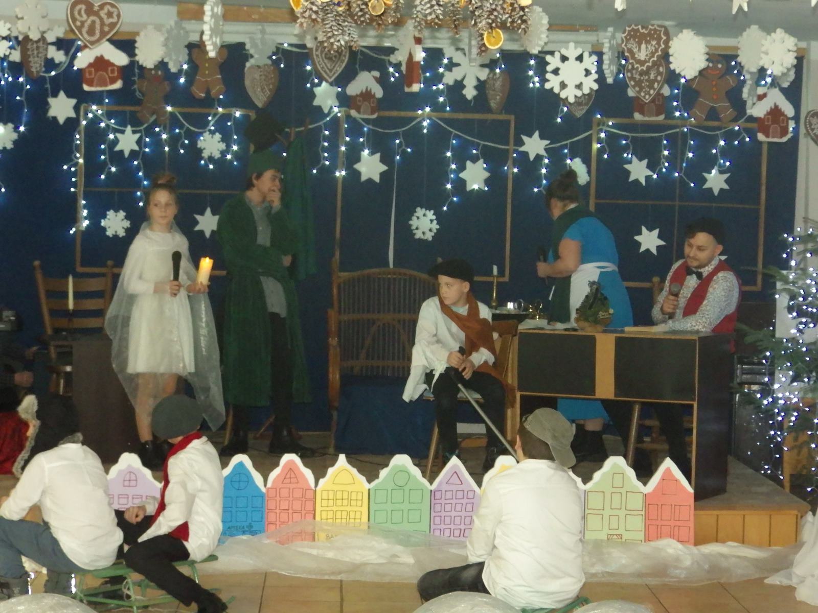 Przedstawienie pokazuje głębokie doświadczenie i przemianę skąpca Ebenezera Schroog’a zachodzącą w czasie nocy Wigilijnej. Wizyta tajemniczych gości sprawia, że dokonała się dobra przemiana w życiu naszego bohatera i na pewno w każdym z nas. Spektakl został uwieńczony wspólnym kolędowaniem w bardzo ciepłej i radosnej atmosferze.
