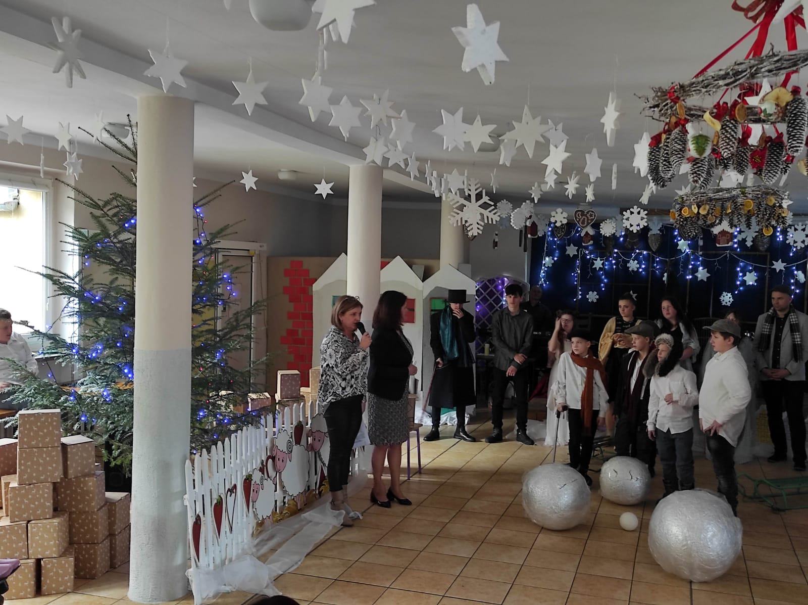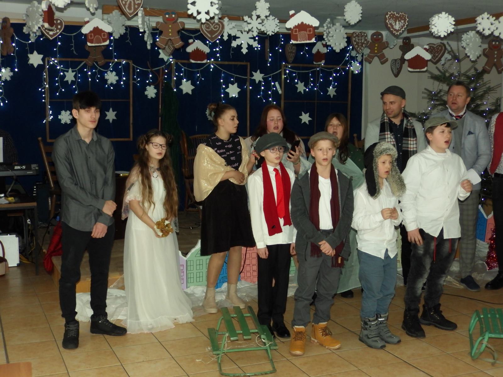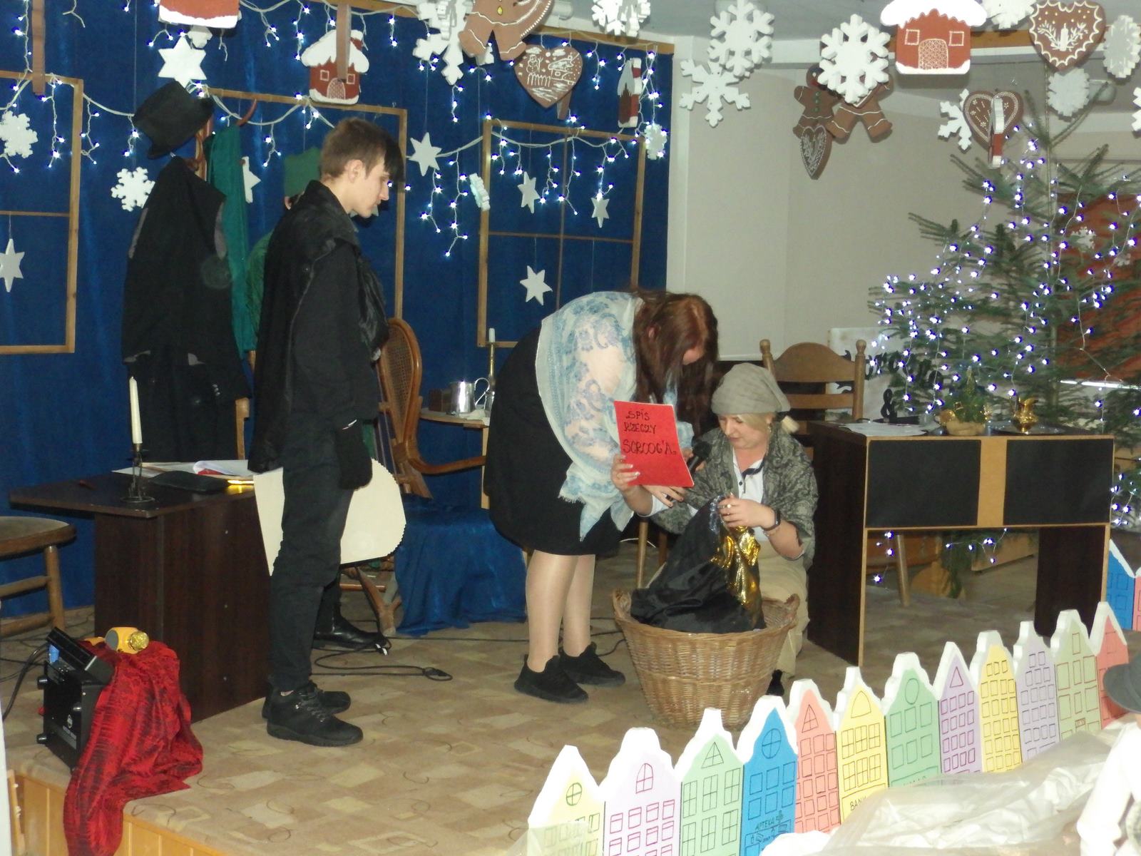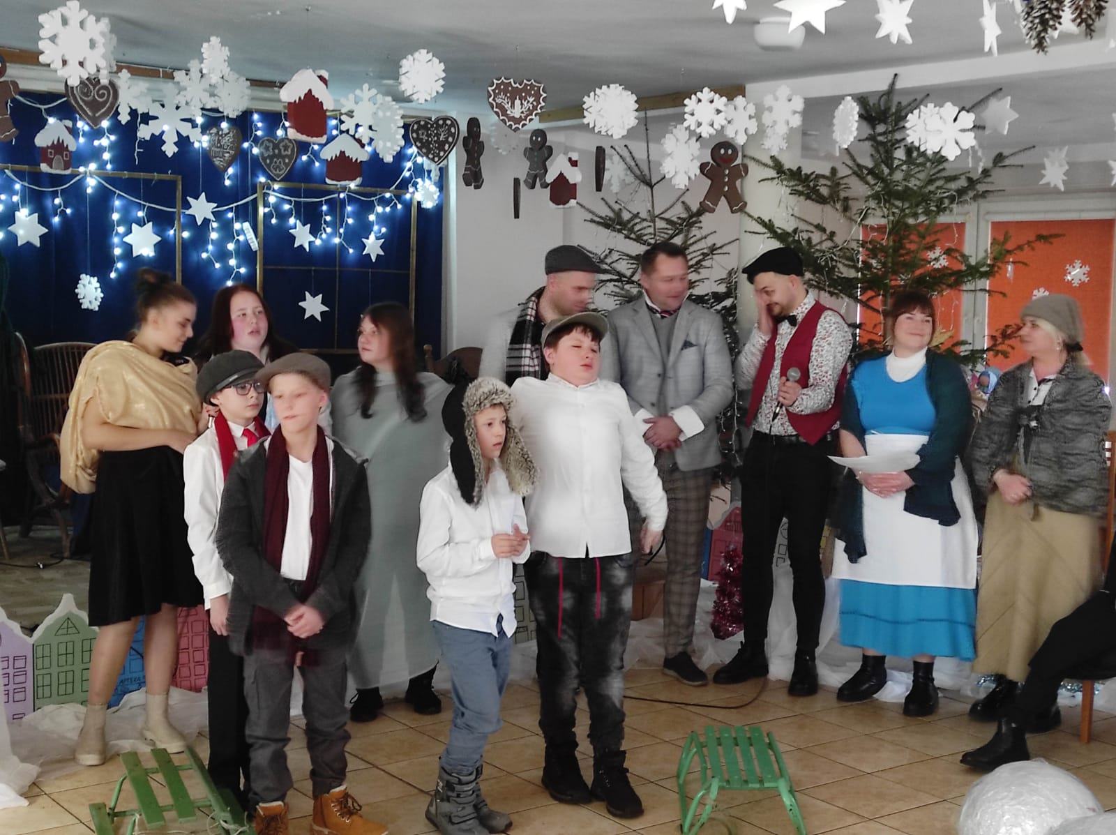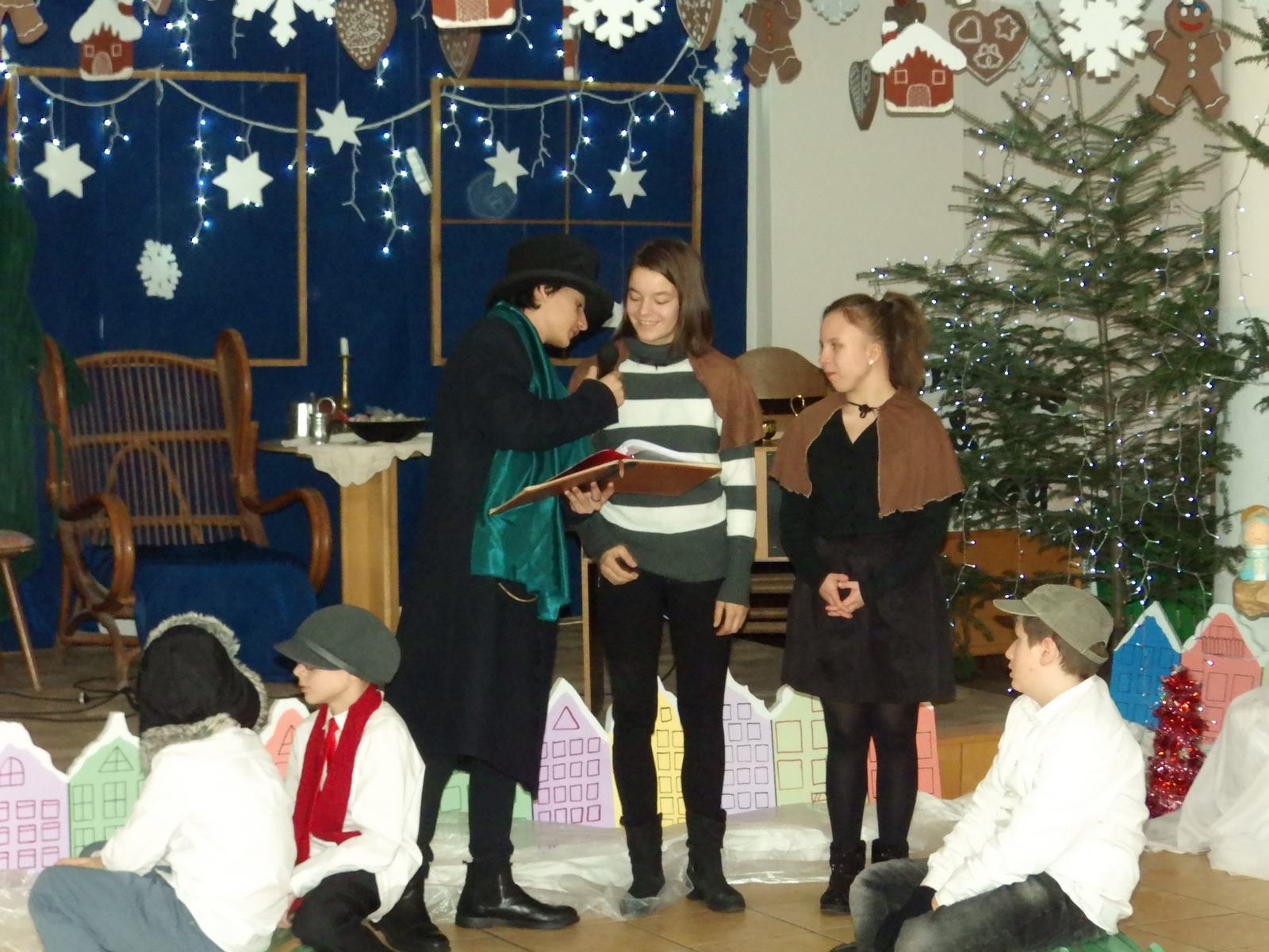 Przedstawienie pokazuje głębokie doświadczenie i przemianę skąpca Ebenezera Schroog’a zachodzącą w czasie nocy Wigilijnej. Wizyta tajemniczych gości sprawia, że dokonała się dobra przemiana w życiu naszego bohatera i na pewno w każdym z nas. Spektakl został uwieńczony wspólnym kolędowaniem w bardzo ciepłej i radosnej atmosferze.
