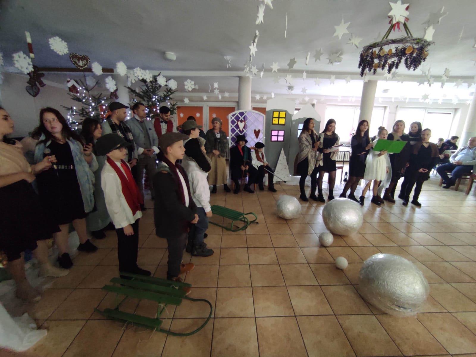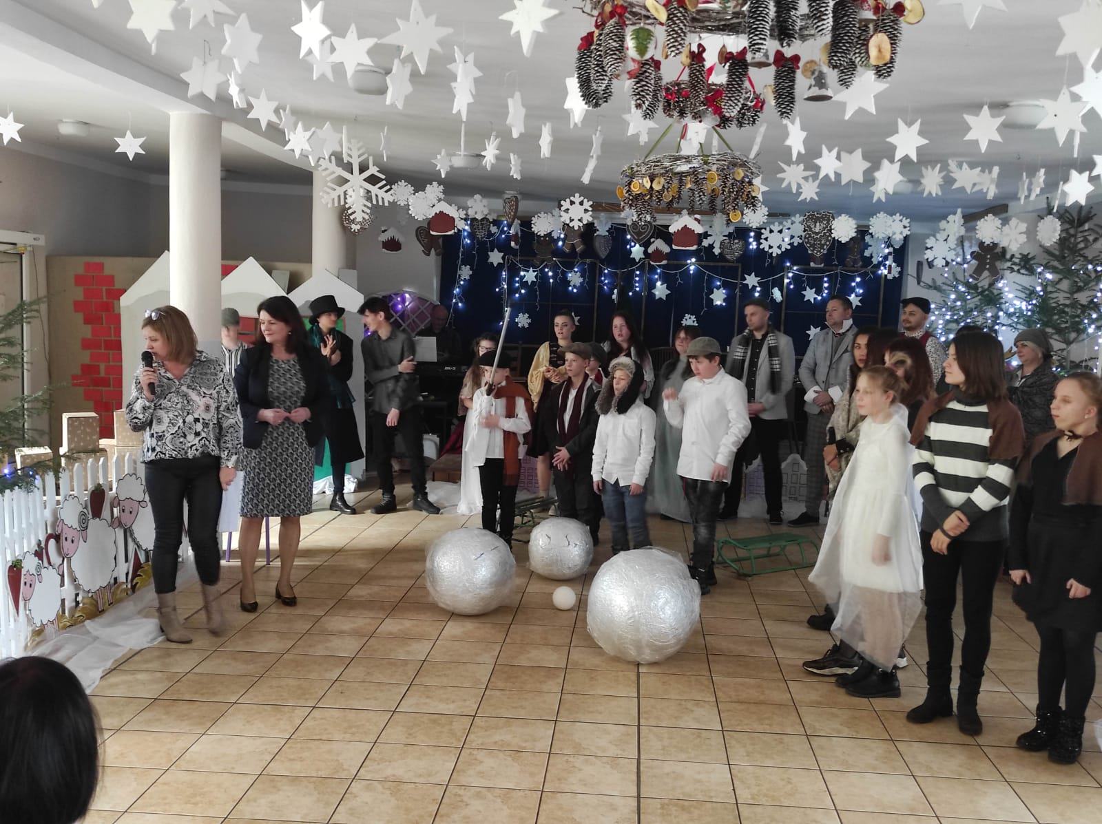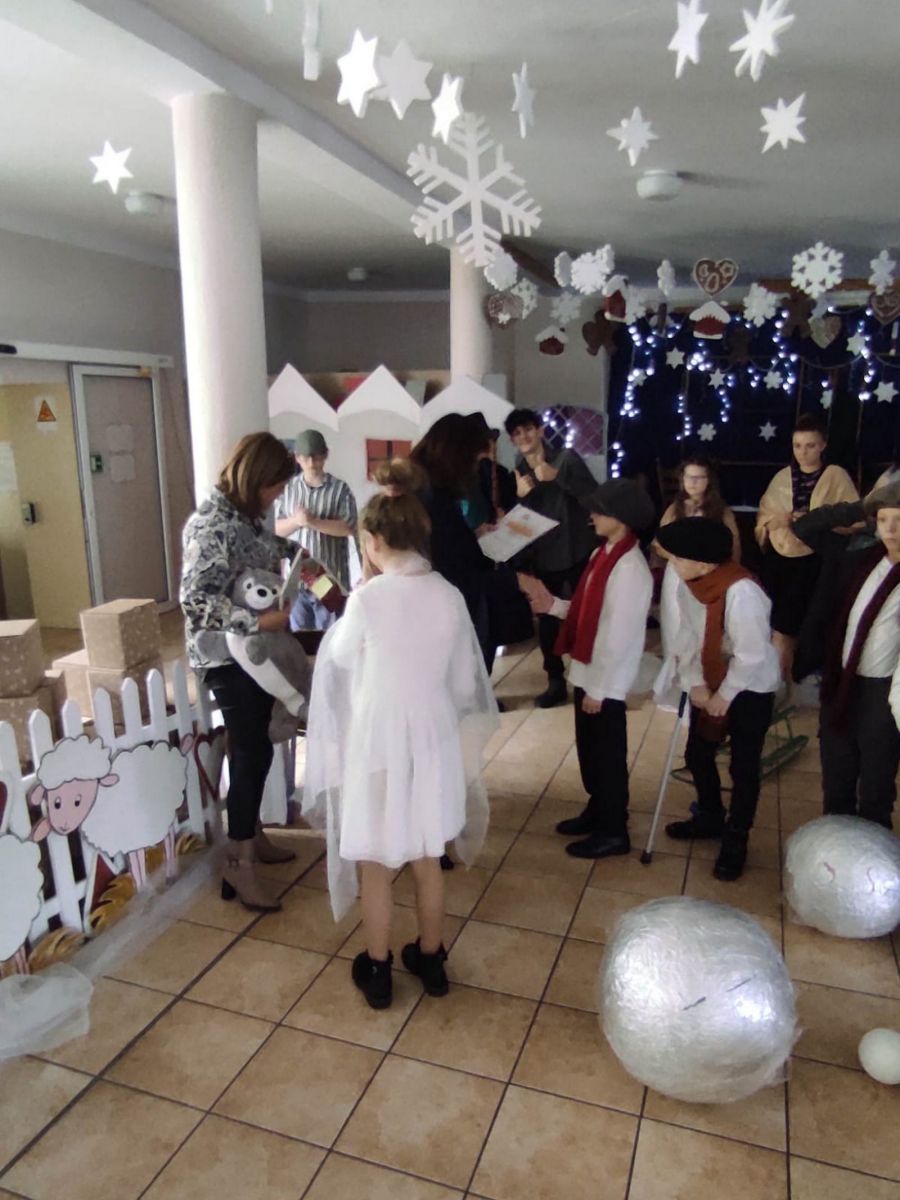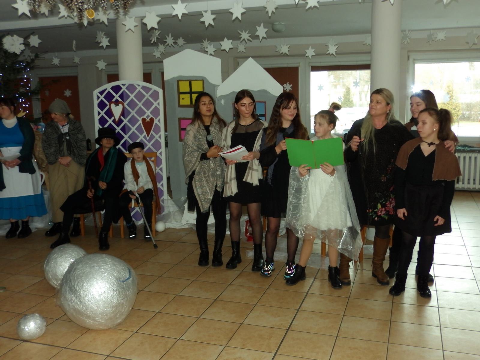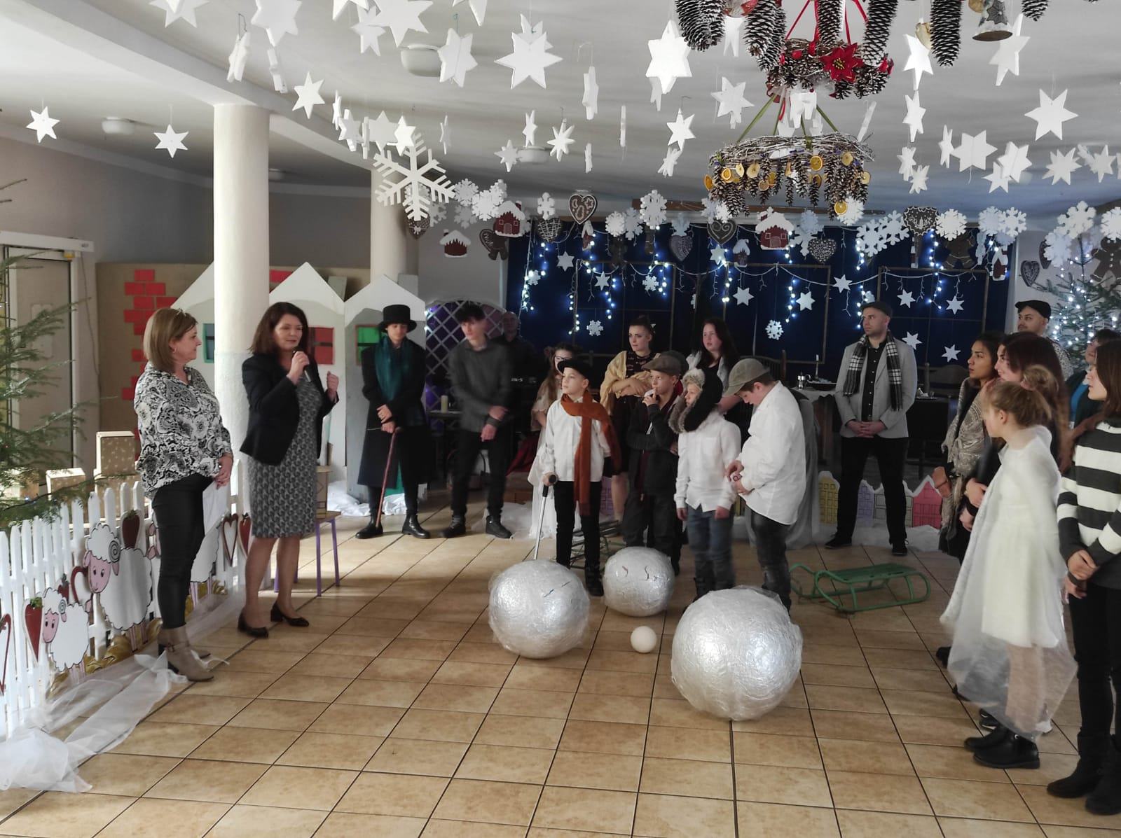 Przedstawienie pokazuje głębokie doświadczenie i przemianę skąpca Ebenezera Schroog’a zachodzącą w czasie nocy Wigilijnej. Wizyta tajemniczych gości sprawia, że dokonała się dobra przemiana w życiu naszego bohatera i na pewno w każdym z nas. Spektakl został uwieńczony wspólnym kolędowaniem w bardzo ciepłej i radosnej atmosferze.