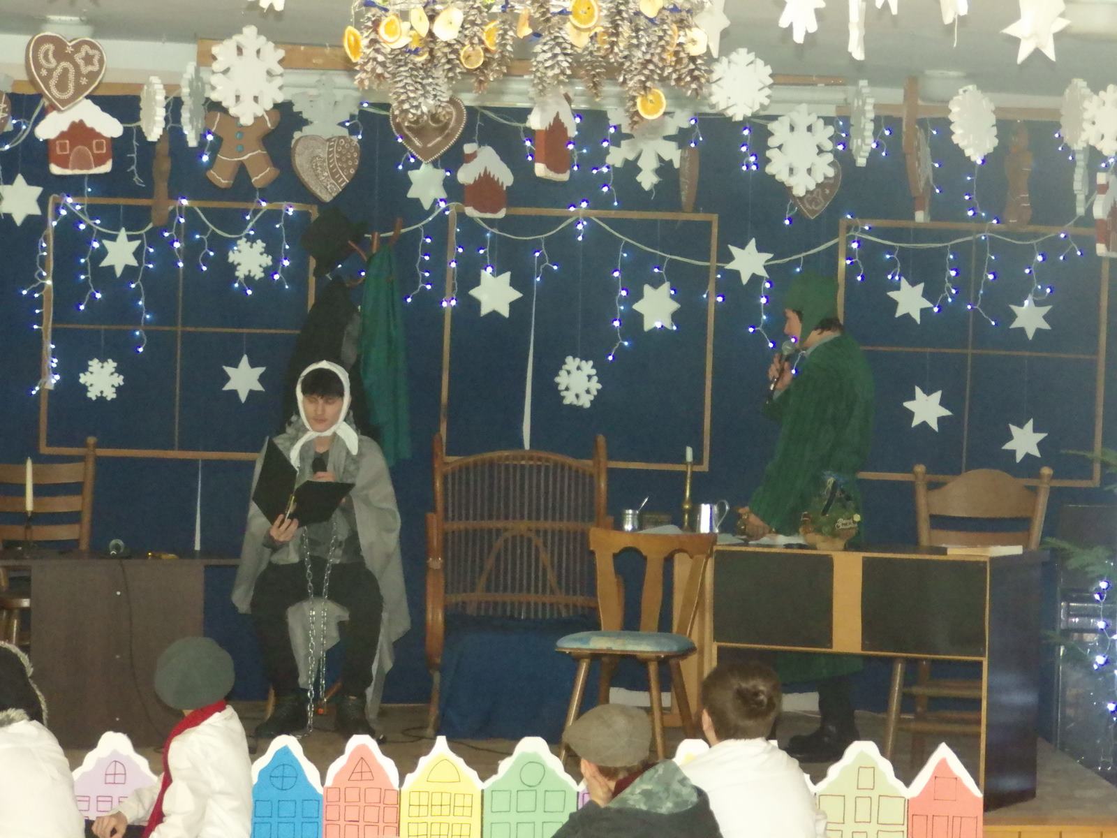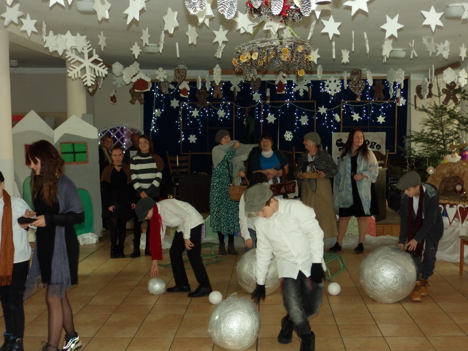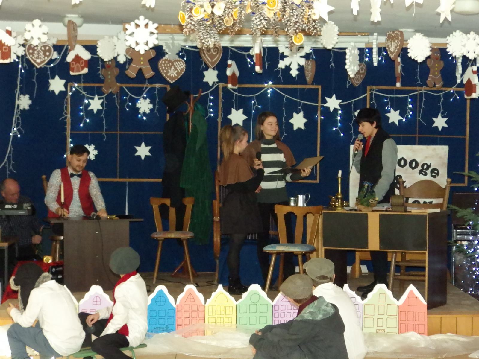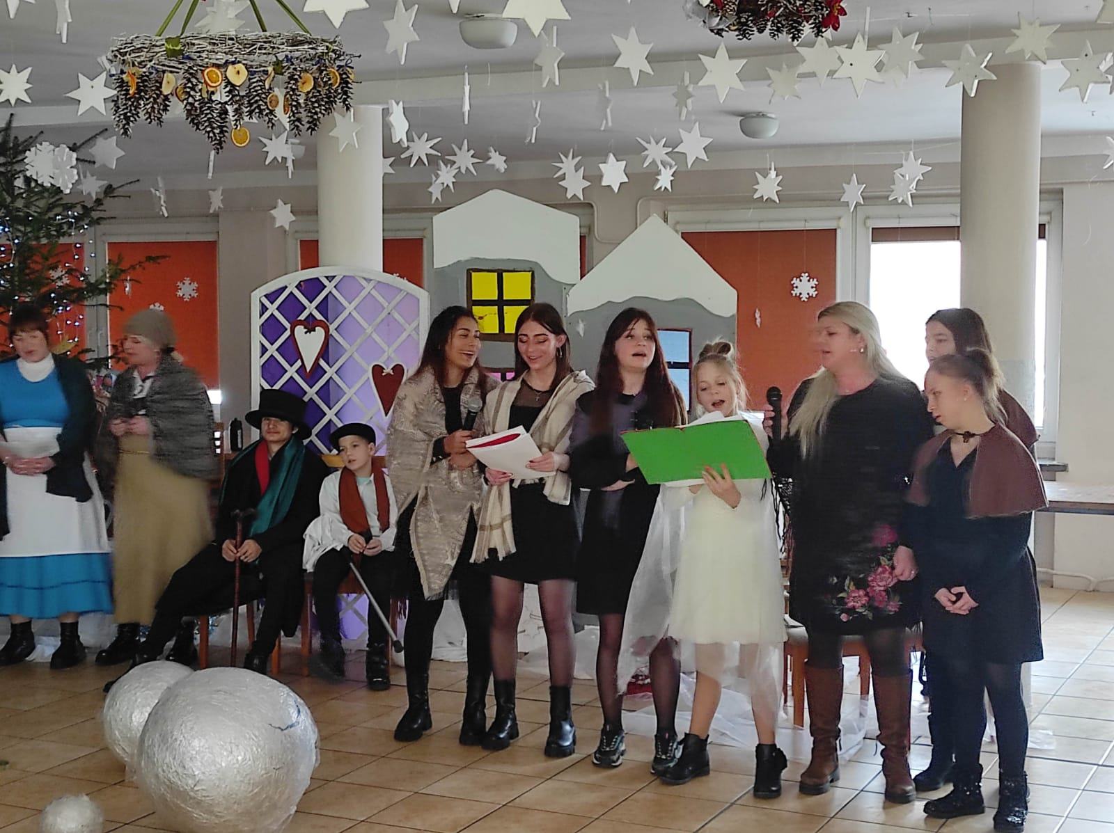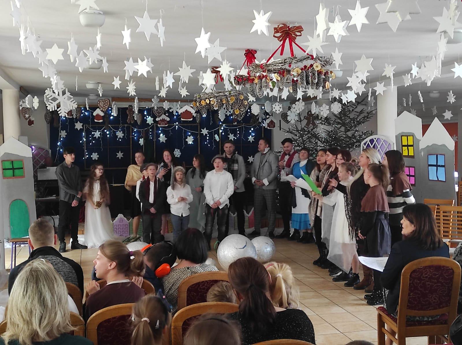 Przedstawienie pokazuje głębokie doświadczenie i przemianę skąpca Ebenezera Schroog’a zachodzącą w czasie nocy Wigilijnej. Wizyta tajemniczych gości sprawia, że dokonała się dobra przemiana w życiu naszego bohatera i na pewno w każdym z nas. Spektakl został uwieńczony wspólnym kolędowaniem w bardzo ciepłej i radosnej atmosferze.