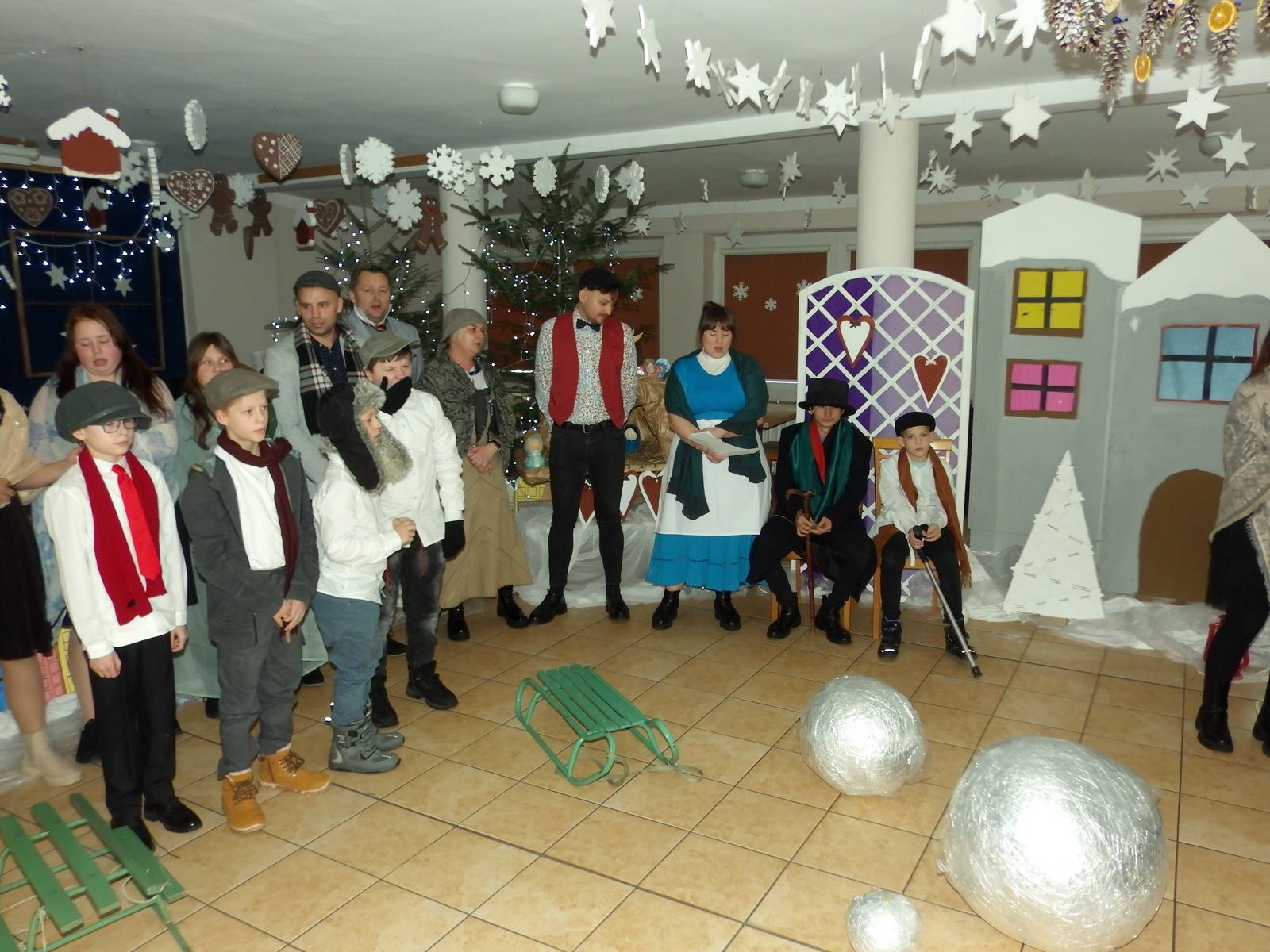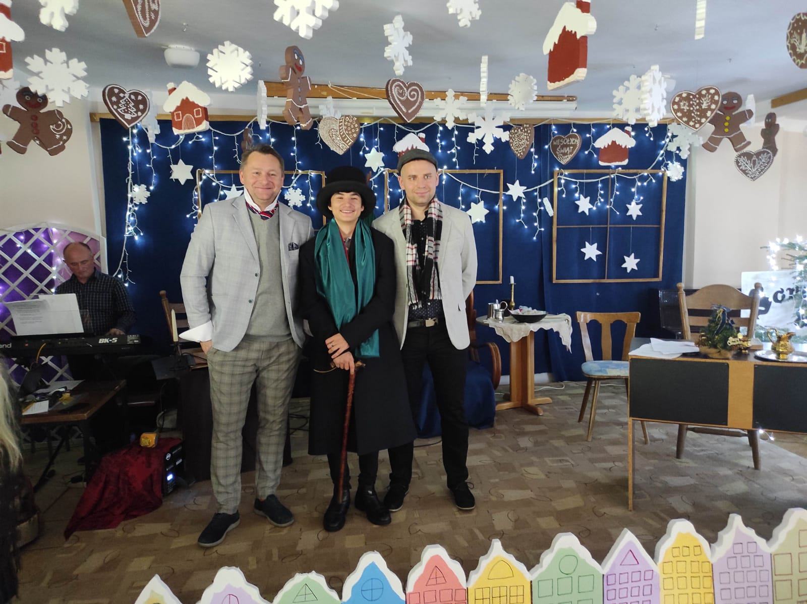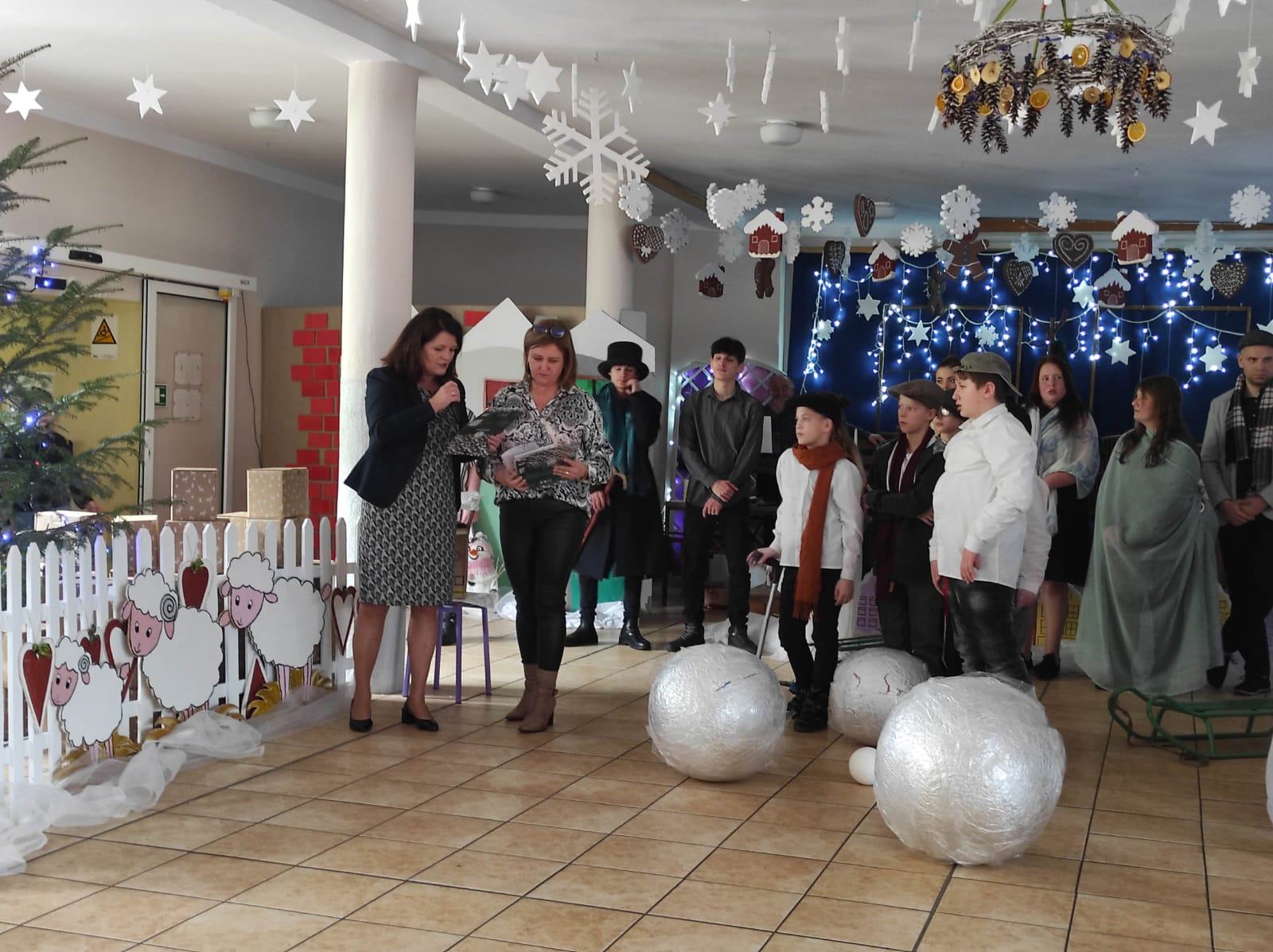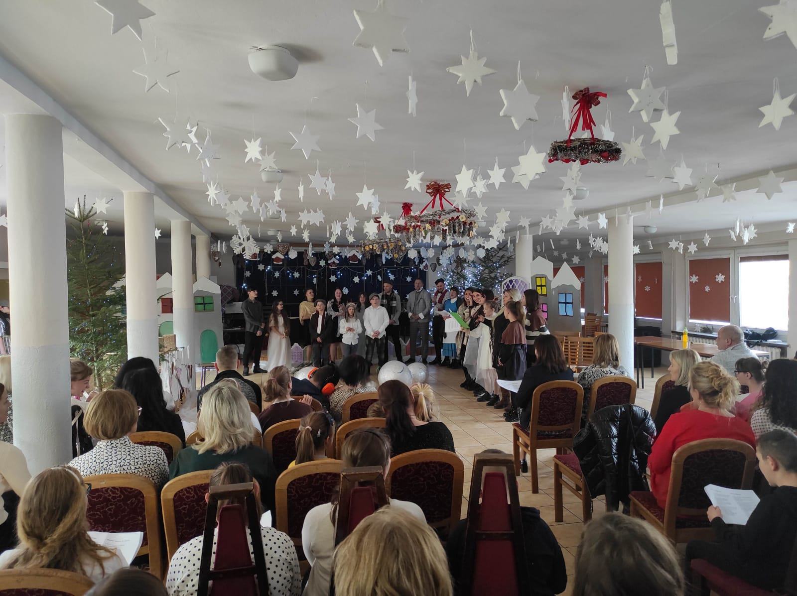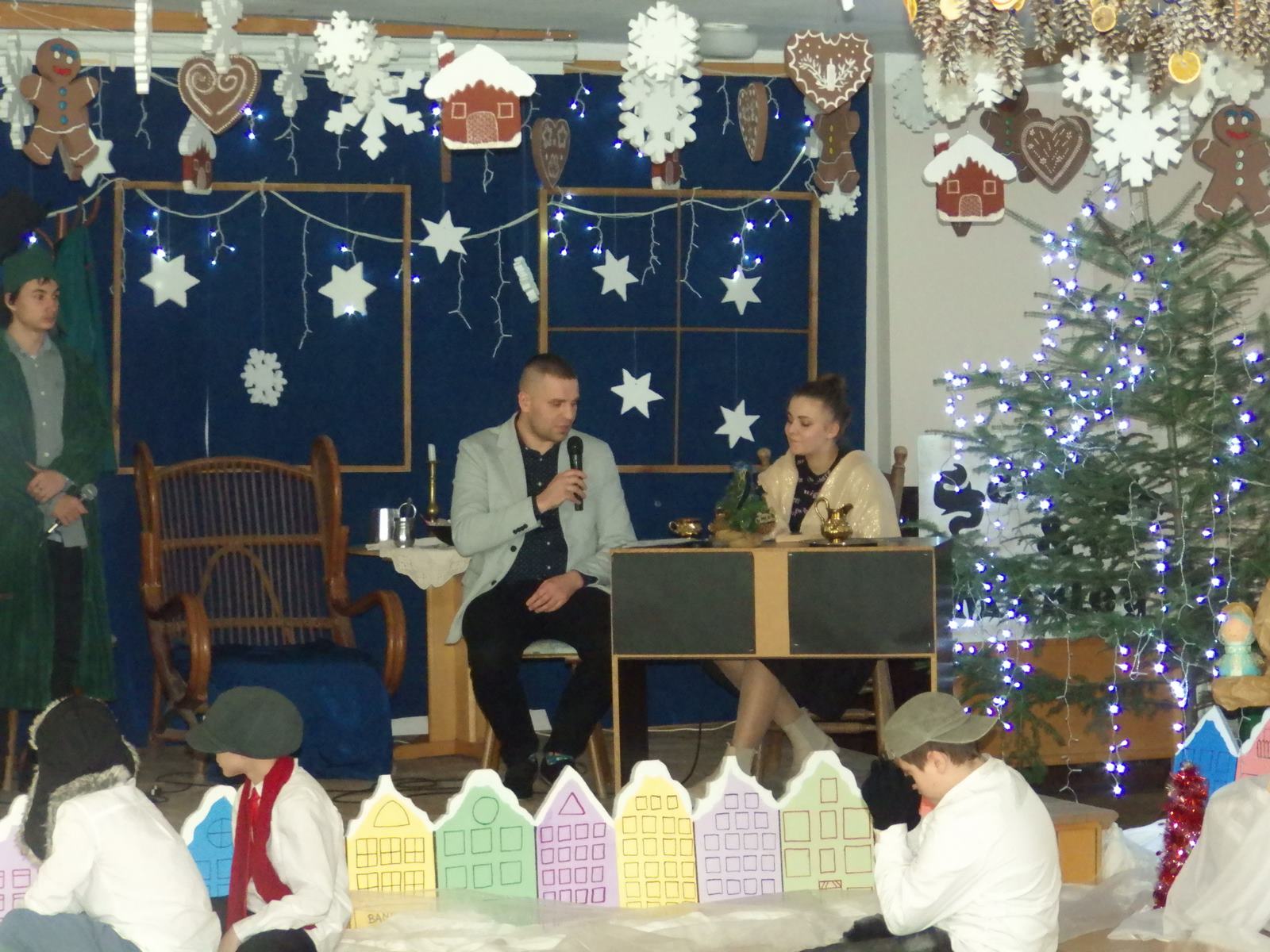 Przedstawienie pokazuje głębokie doświadczenie i przemianę skąpca Ebenezera Schroog’a zachodzącą w czasie nocy Wigilijnej. Wizyta tajemniczych gości sprawia, że dokonała się dobra przemiana w życiu naszego bohatera i na pewno w każdym z nas. Spektakl został uwieńczony wspólnym kolędowaniem w bardzo ciepłej i radosnej atmosferze.