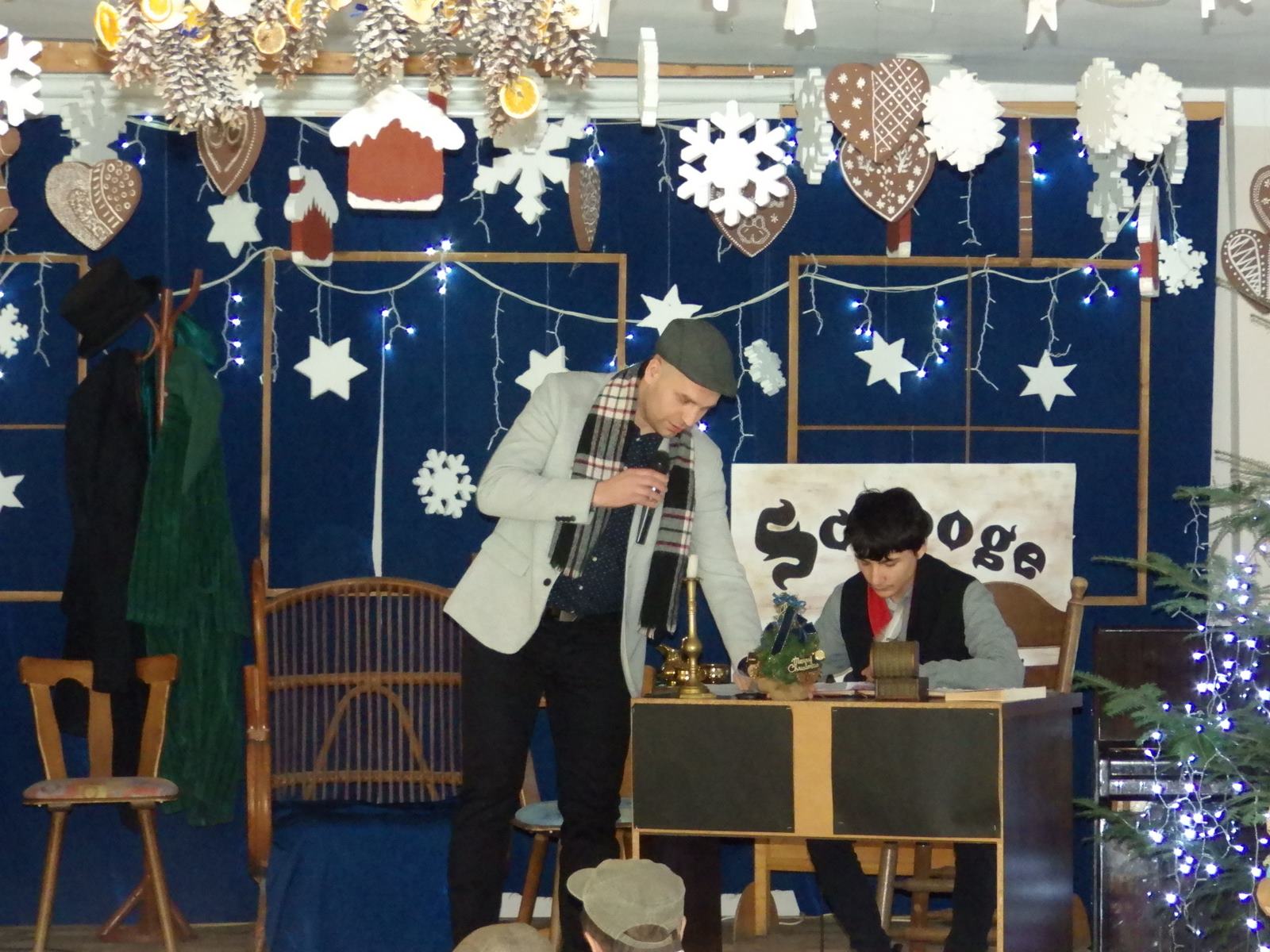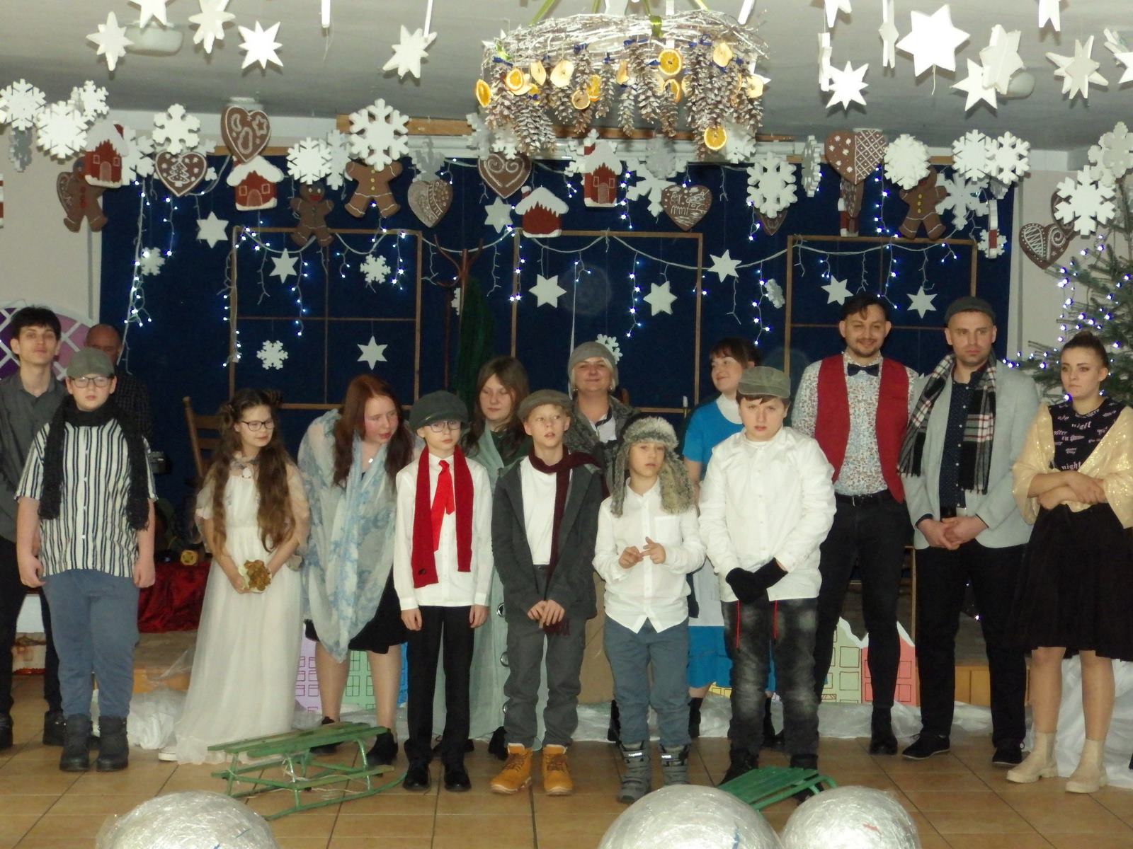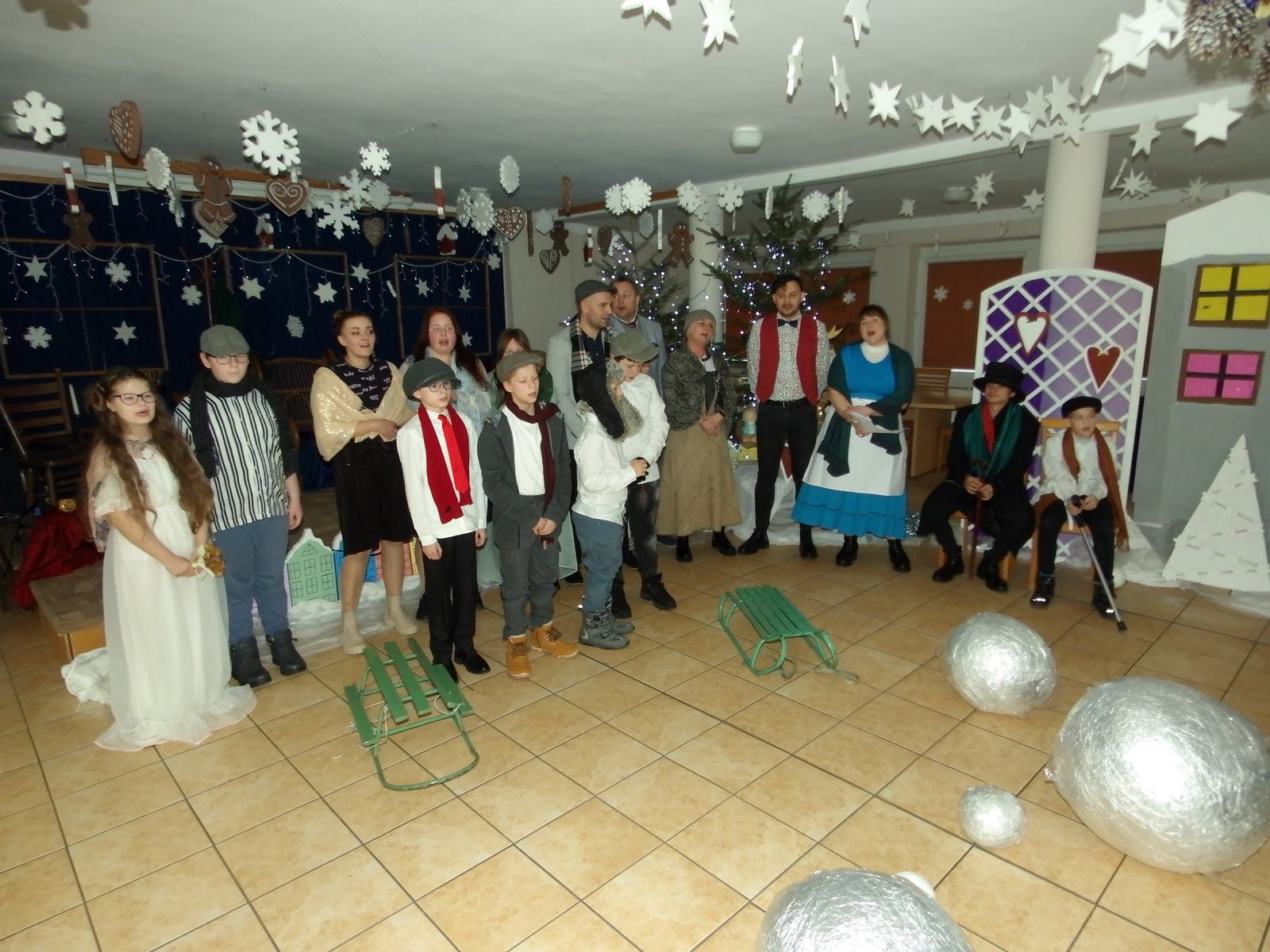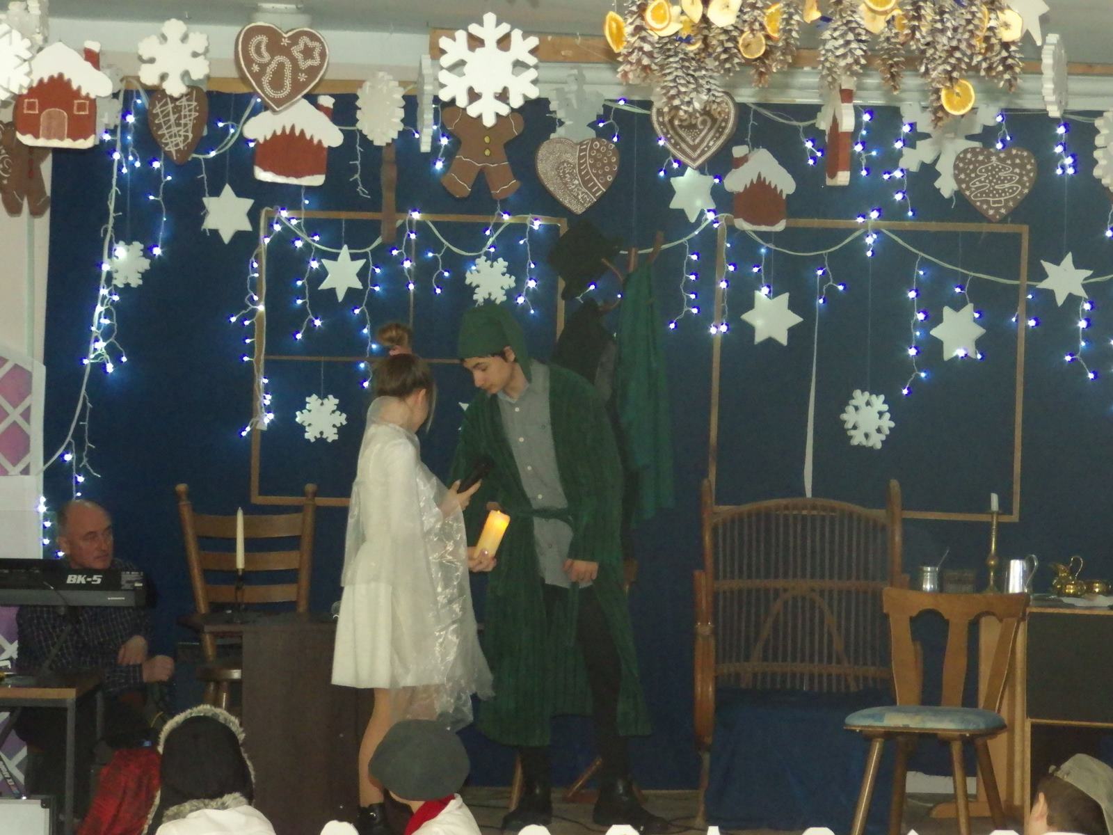 Przedstawienie pokazuje głębokie doświadczenie i przemianę skąpca Ebenezera Schroog’a zachodzącą w czasie nocy Wigilijnej. Wizyta tajemniczych gości sprawia, że dokonała się dobra przemiana w życiu naszego bohatera i na pewno w każdym z nas. Spektakl został uwieńczony wspólnym kolędowaniem w bardzo ciepłej i radosnej atmosferze.