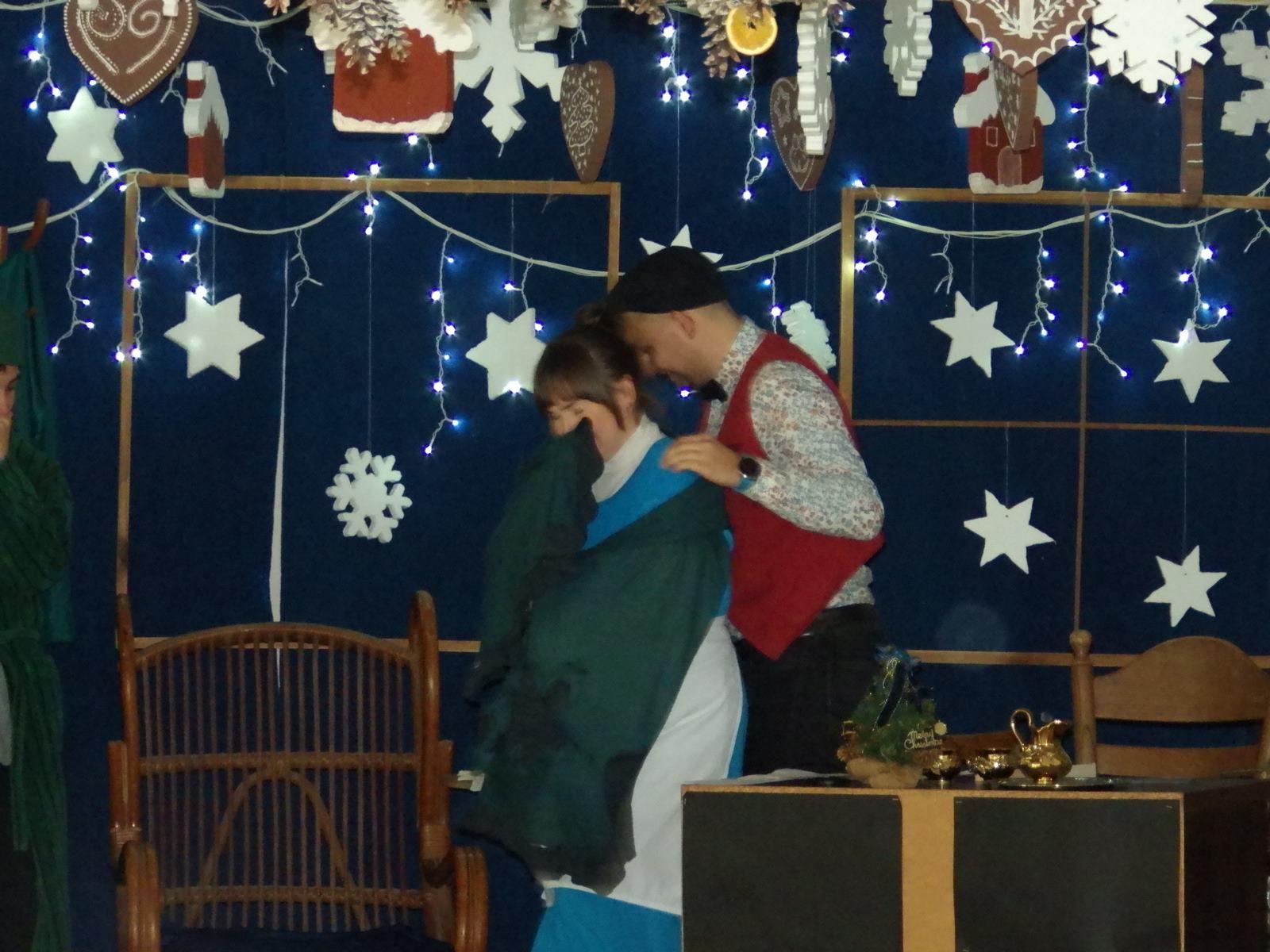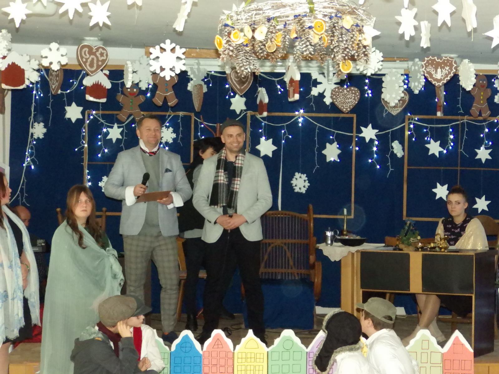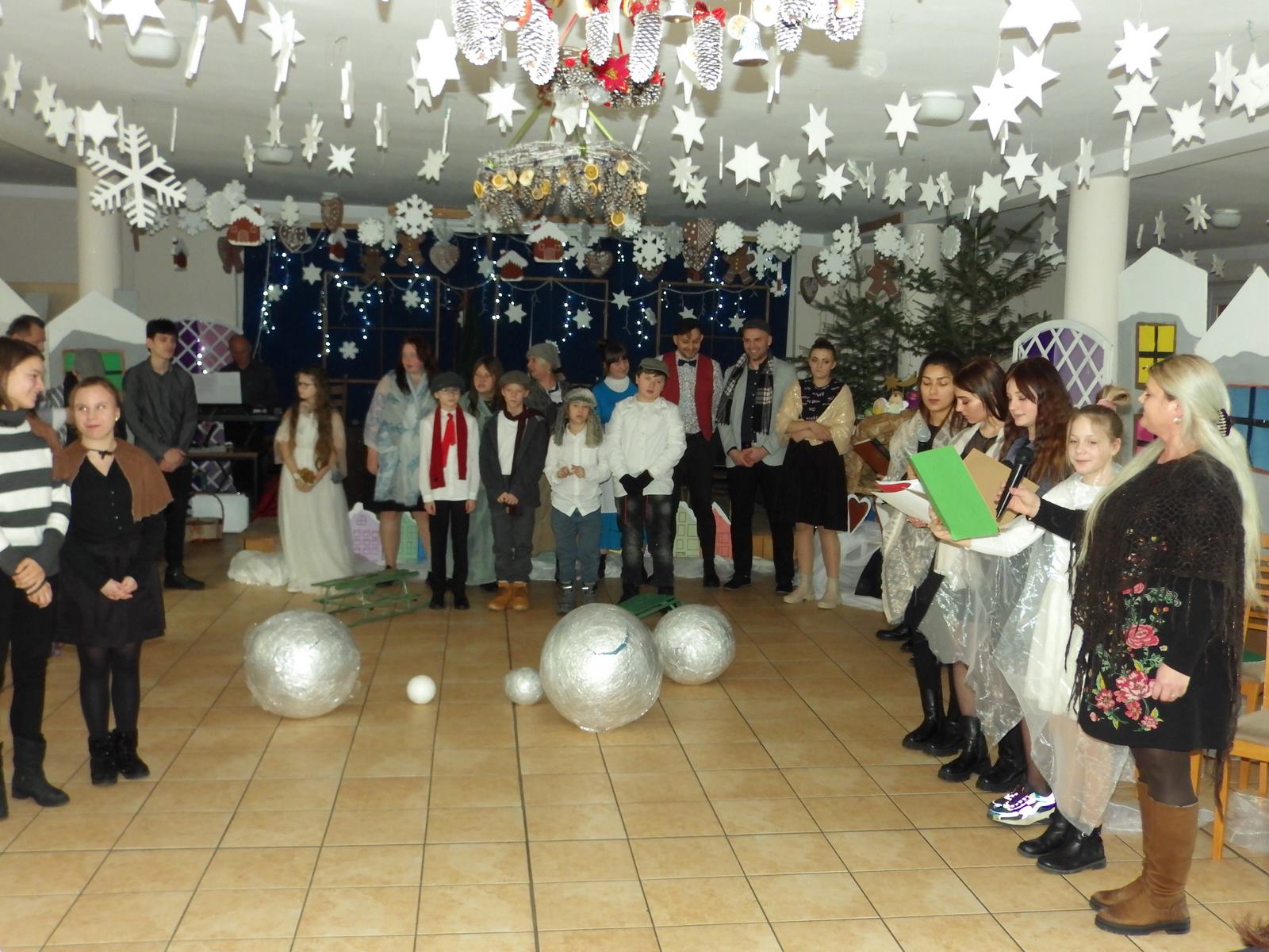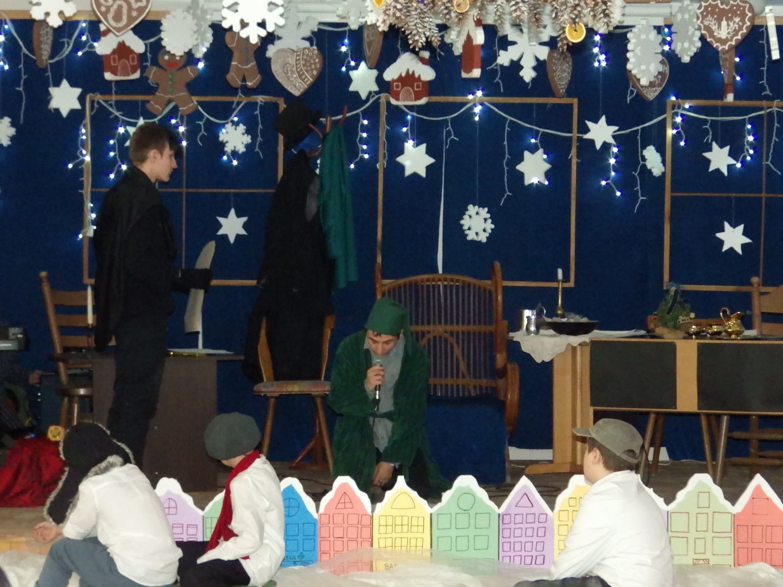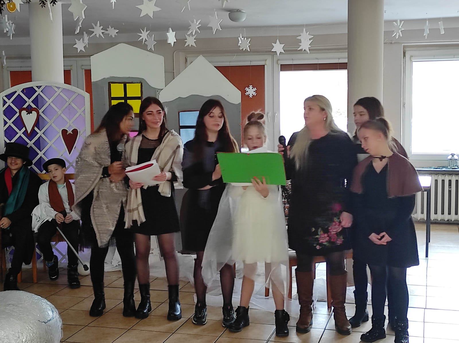 Przedstawienie pokazuje głębokie doświadczenie i przemianę skąpca Ebenezera Schroog’a zachodzącą w czasie nocy Wigilijnej. Wizyta tajemniczych gości sprawia, że dokonała się dobra przemiana w życiu naszego bohatera i na pewno w każdym z nas. Spektakl został uwieńczony wspólnym kolędowaniem w bardzo ciepłej i radosnej atmosferze.