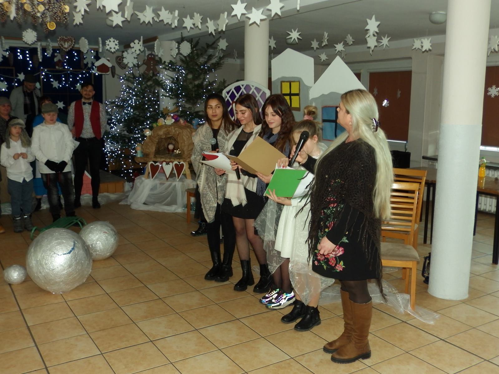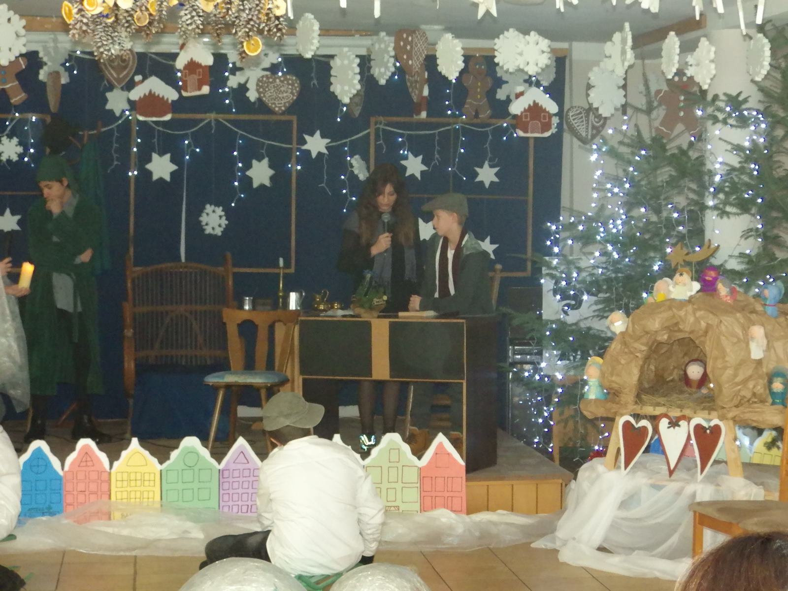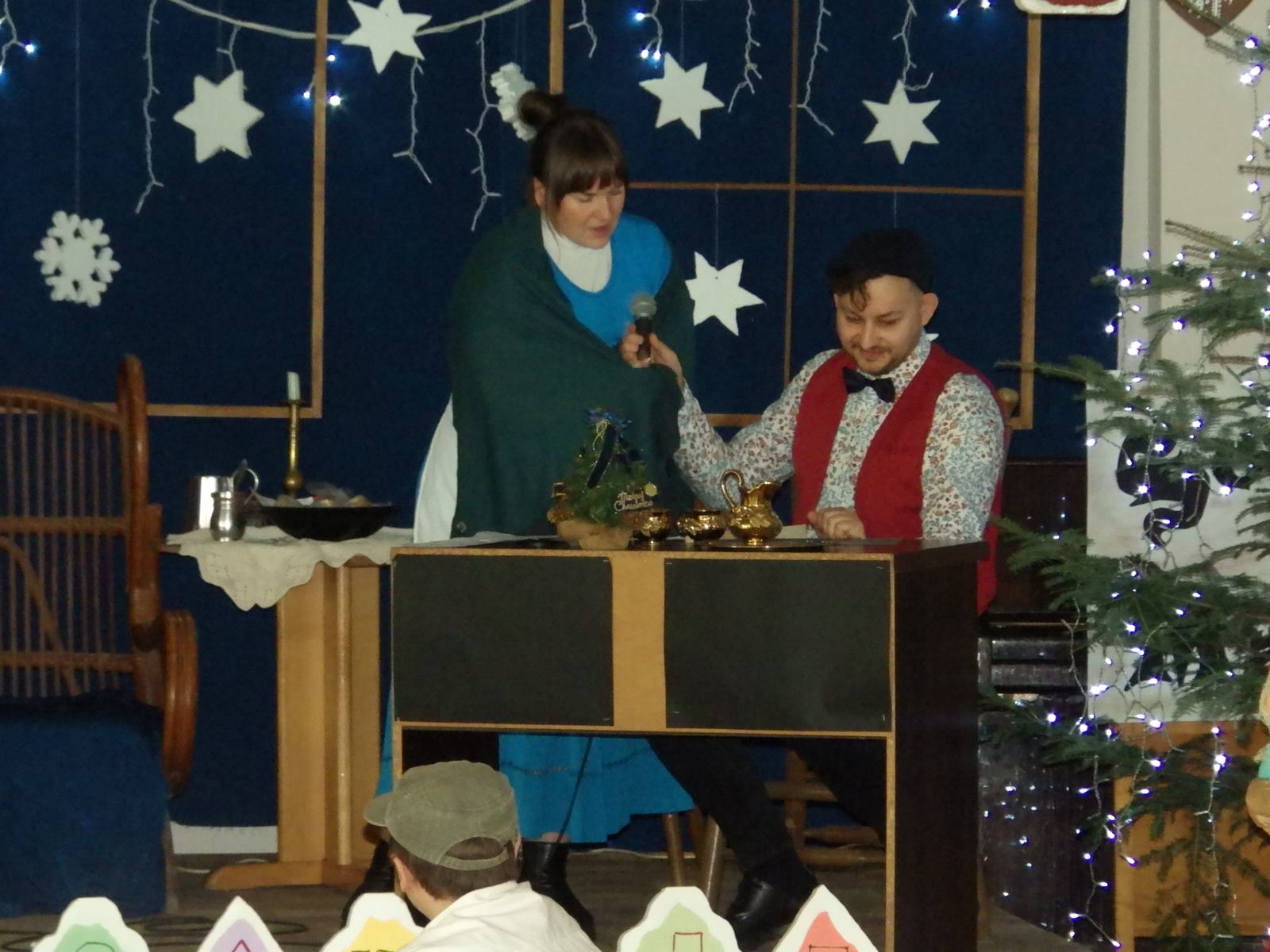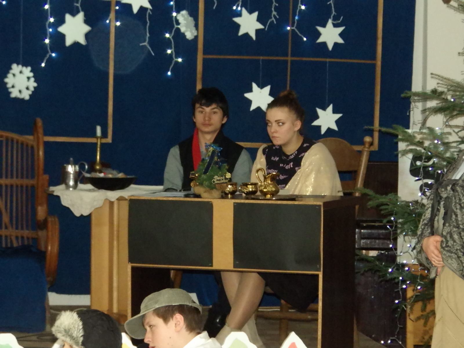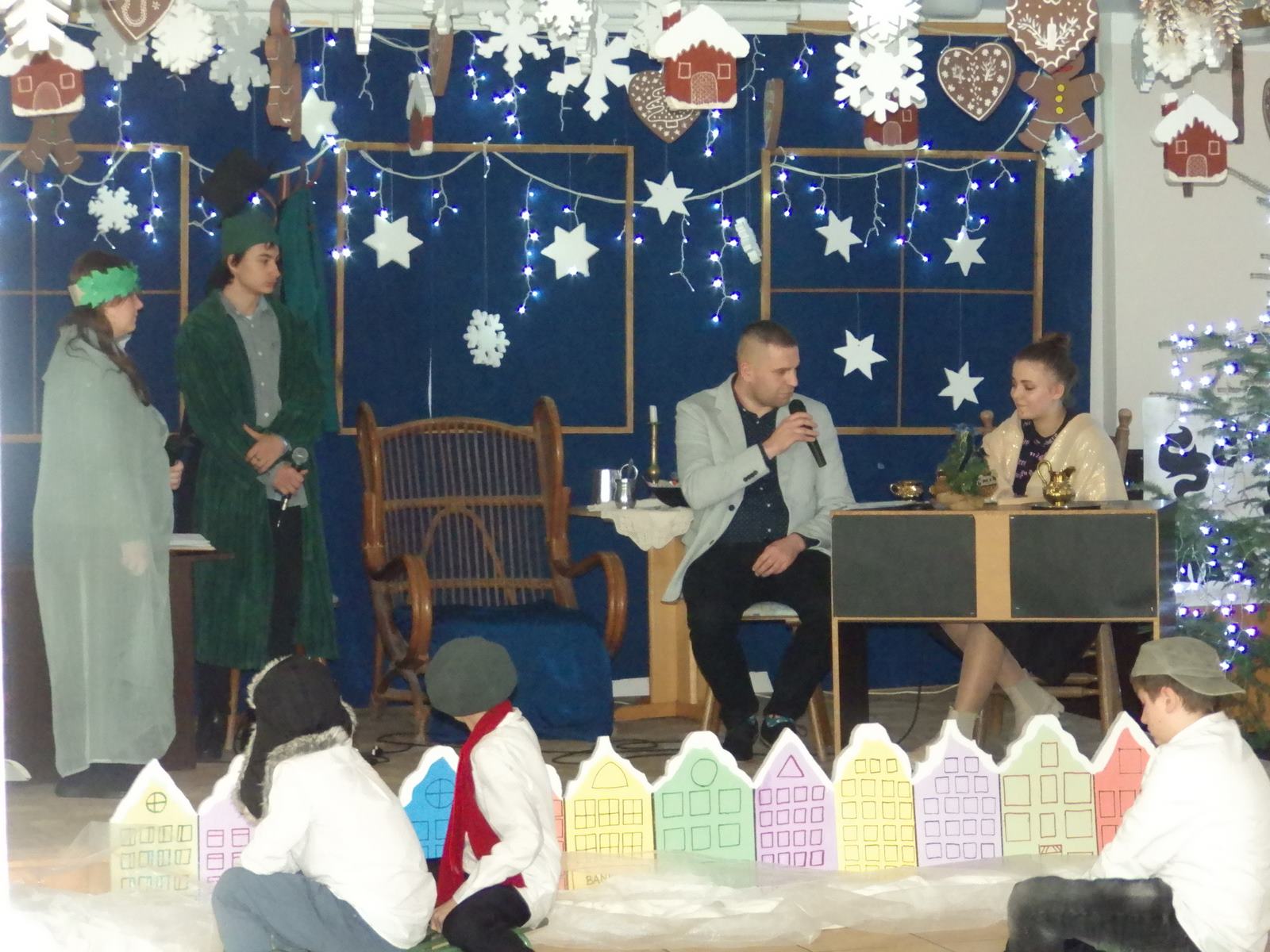 Przedstawienie pokazuje głębokie doświadczenie i przemianę skąpca Ebenezera Schroog’a zachodzącą w czasie nocy Wigilijnej. Wizyta tajemniczych gości sprawia, że dokonała się dobra przemiana w życiu naszego bohatera i na pewno w każdym z nas. Spektakl został uwieńczony wspólnym kolędowaniem w bardzo ciepłej i radosnej atmosferze.
