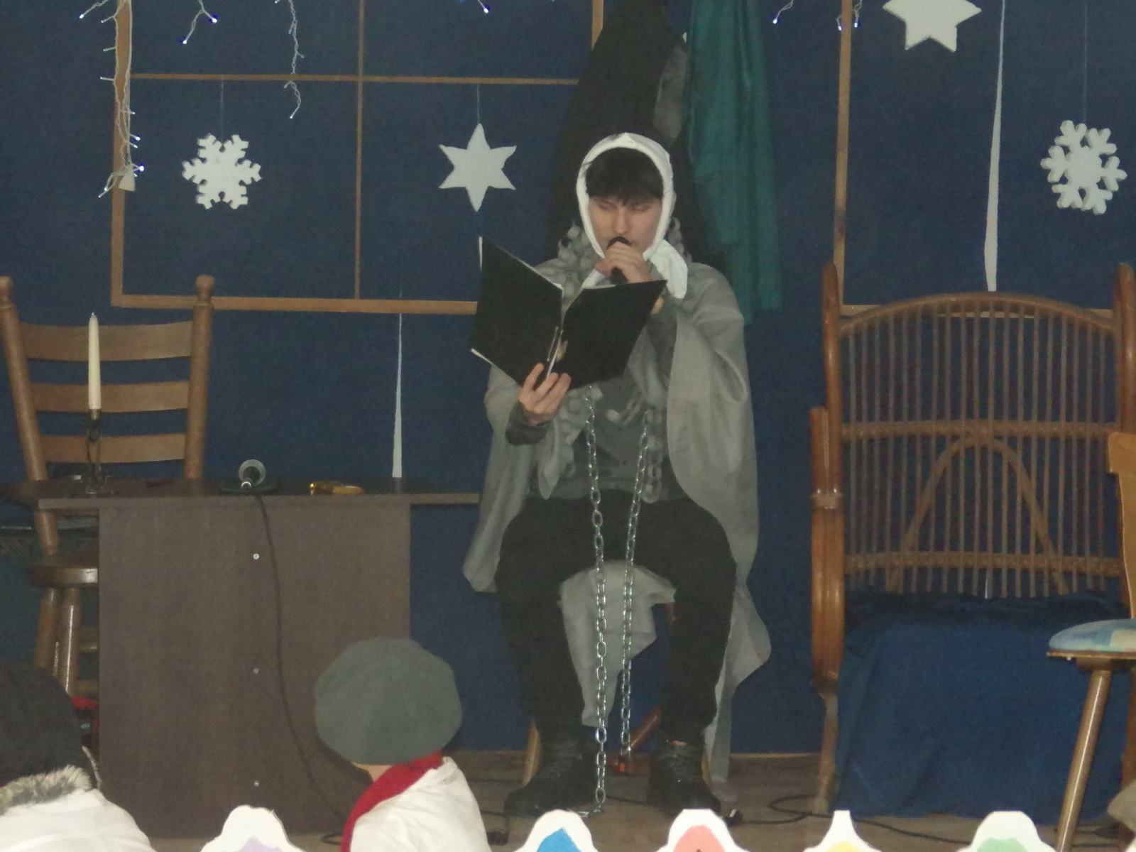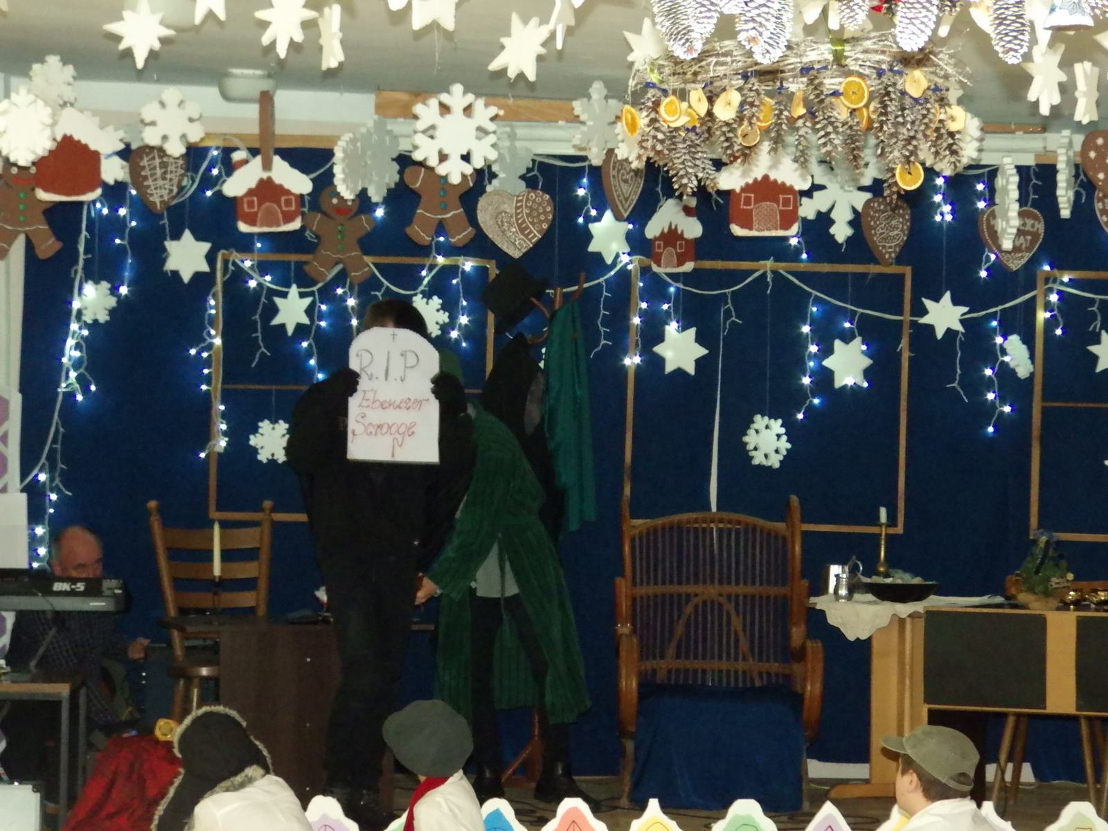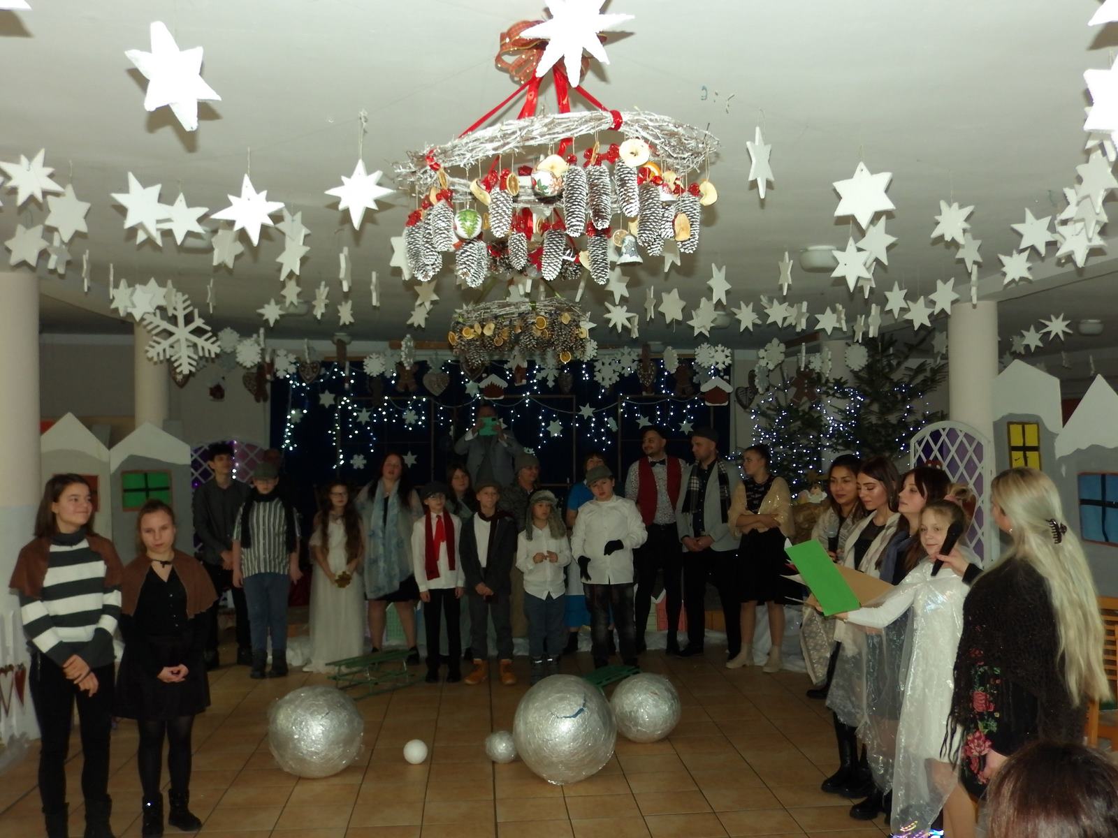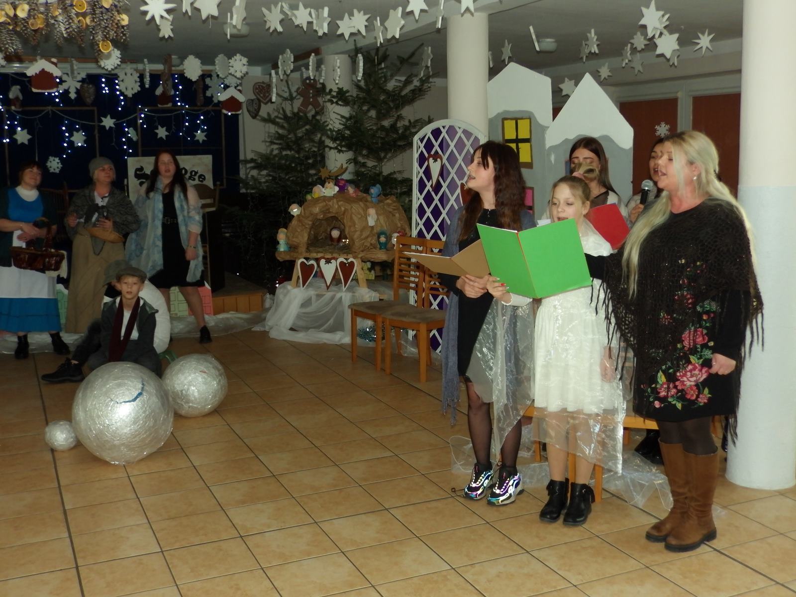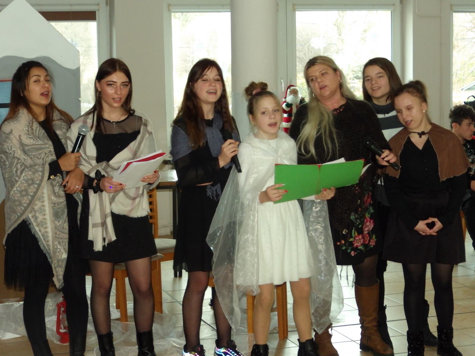 Przedstawienie pokazuje głębokie doświadczenie i przemianę skąpca Ebenezera Schroog’a zachodzącą w czasie nocy Wigilijnej. Wizyta tajemniczych gości sprawia, że dokonała się dobra przemiana w życiu naszego bohatera i na pewno w każdym z nas. Spektakl został uwieńczony wspólnym kolędowaniem w bardzo ciepłej i radosnej atmosferze.