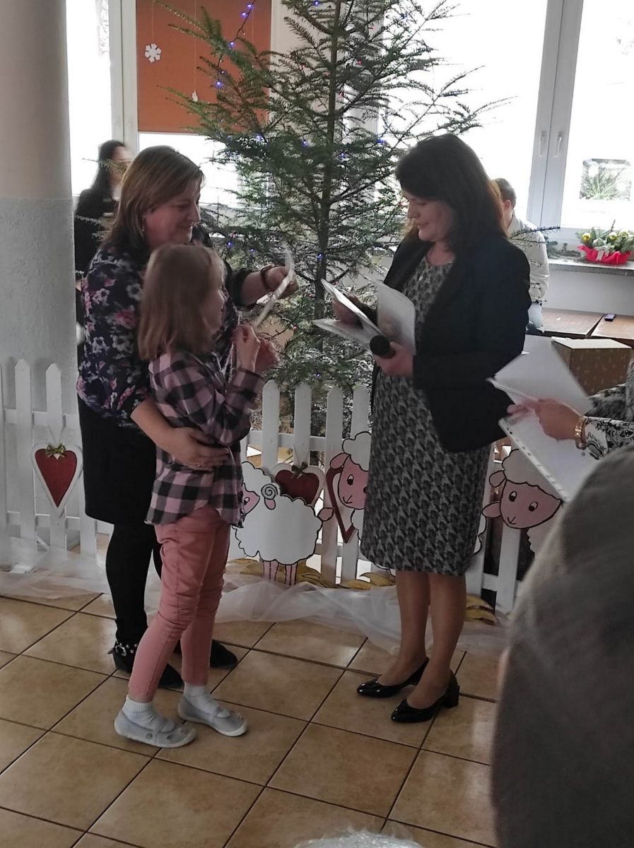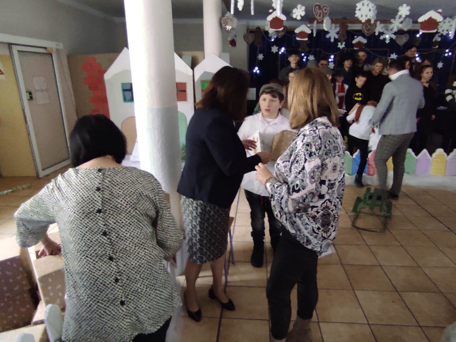Na zakończenie dzieci otrzymały upominki, za które kierujemy ciepłe podziękowania dla p. D. Rutkiewicz. Spotkanie zakończyło się złożeniem życzeń świątecznych przez p. Dyrektor Elżbietę Galus i P. Dyrektor Marię Ziółkowską.