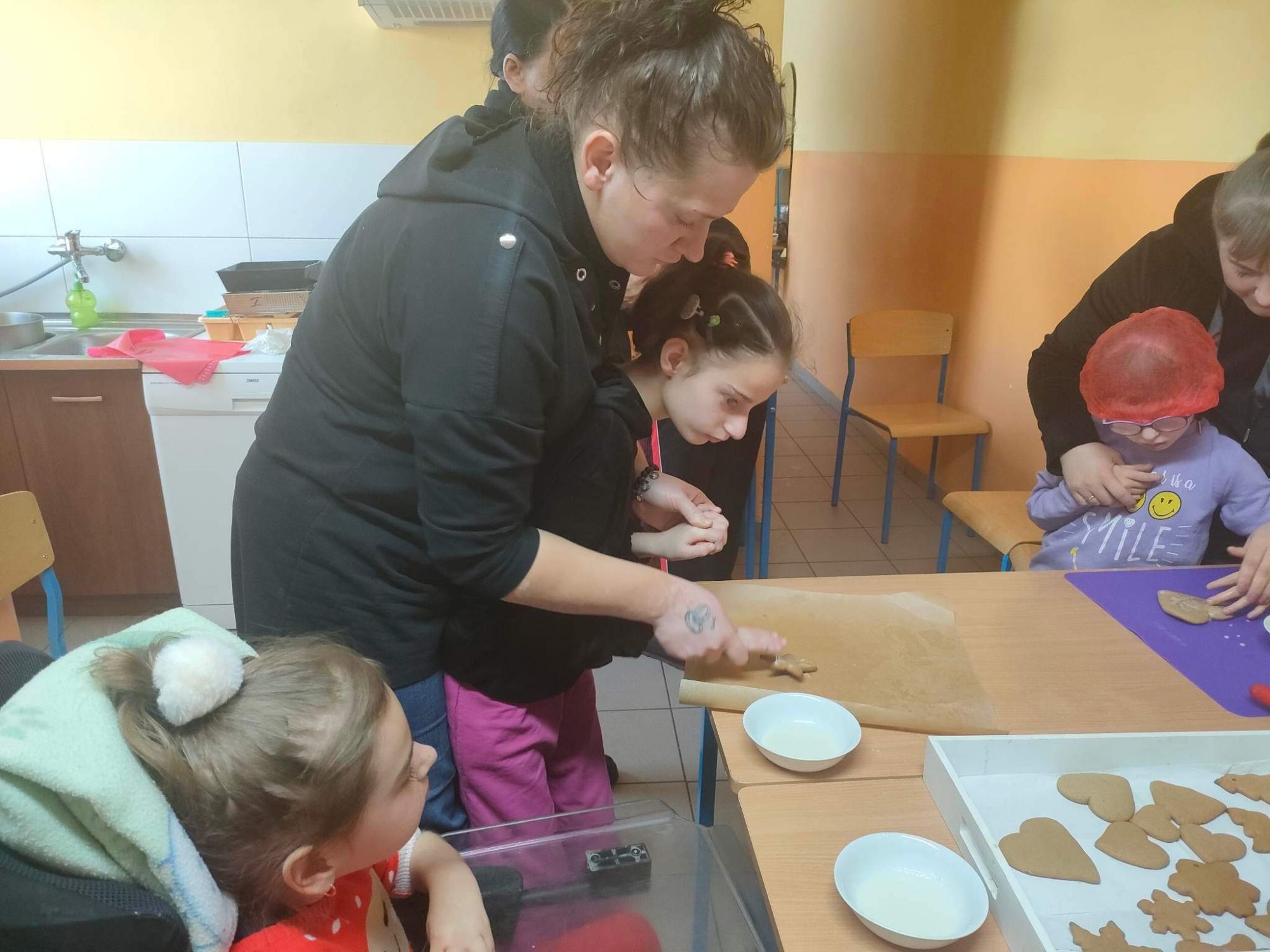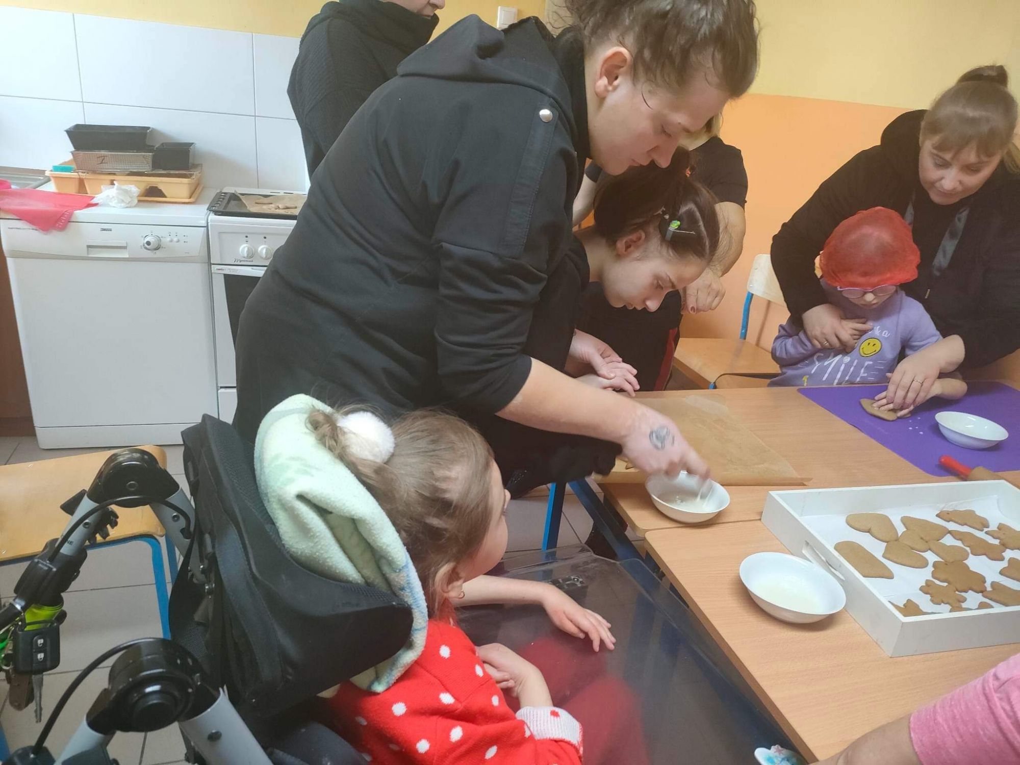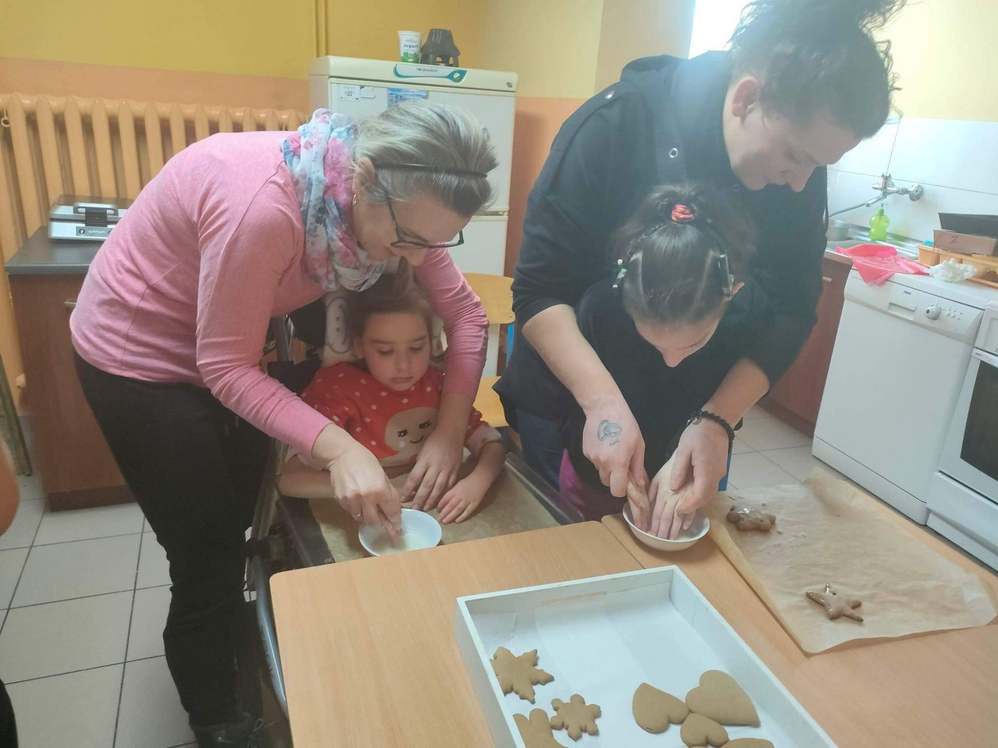 W grudniu robiliśmy sensoryczne ozdoby świąteczne - pierniczki. Dziewczynki wspólnie z nauczycielami zrobiły ciasto na pierniczki, z którego uformowałyśmy i upiekłyśmy różne kształty pierniczków. Na koniec zajęć było trochę zabawy, śmiechu oraz dużo słodkości podczas dekorowania pierniczków lukrem i cukiereczkami. Gotowe pierniczki zostały powieszone na choince.