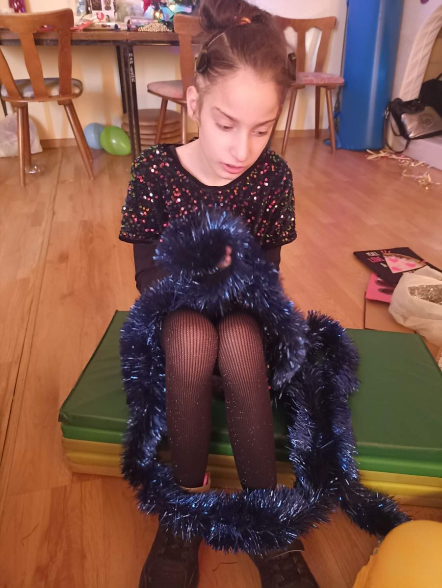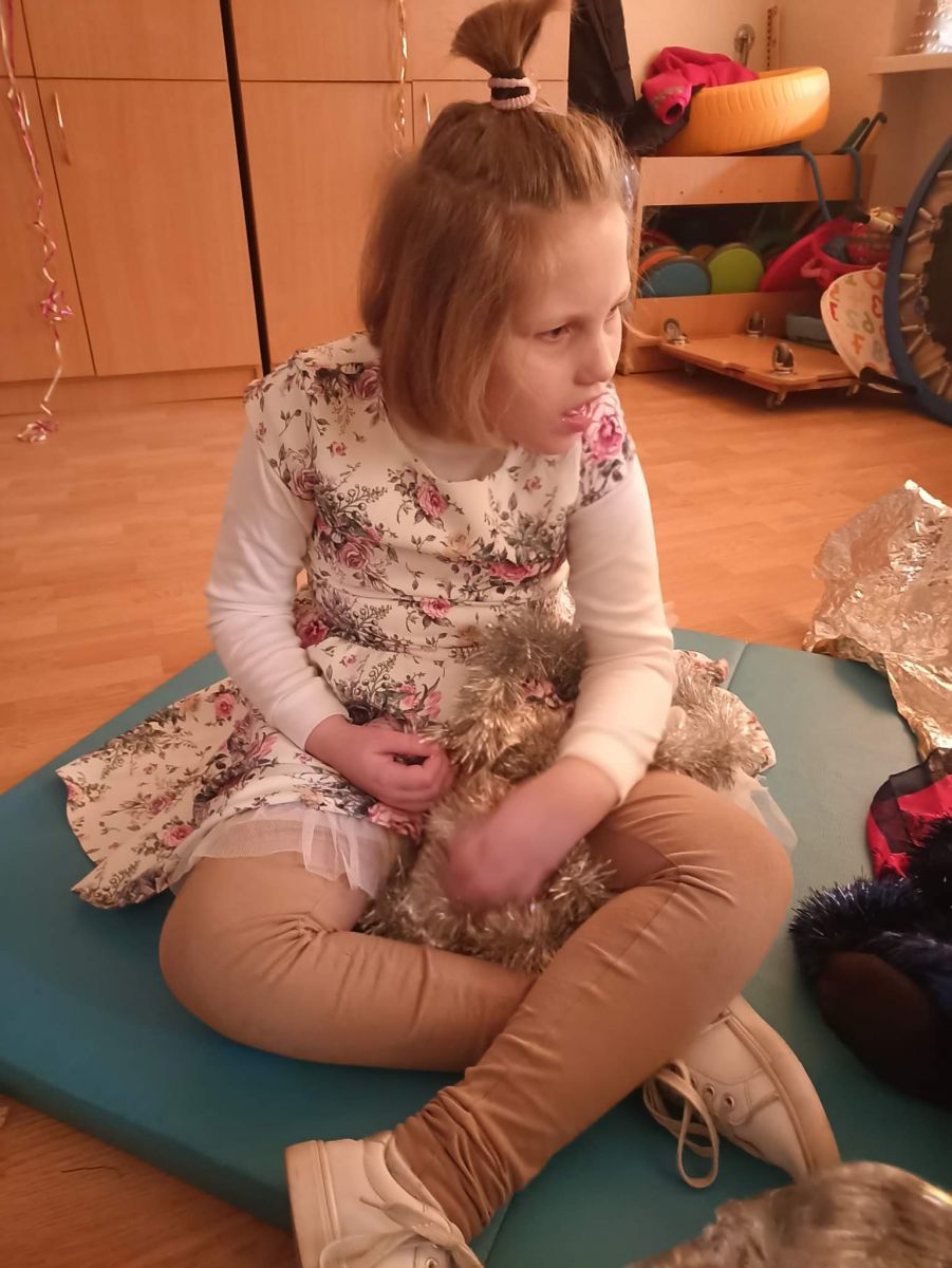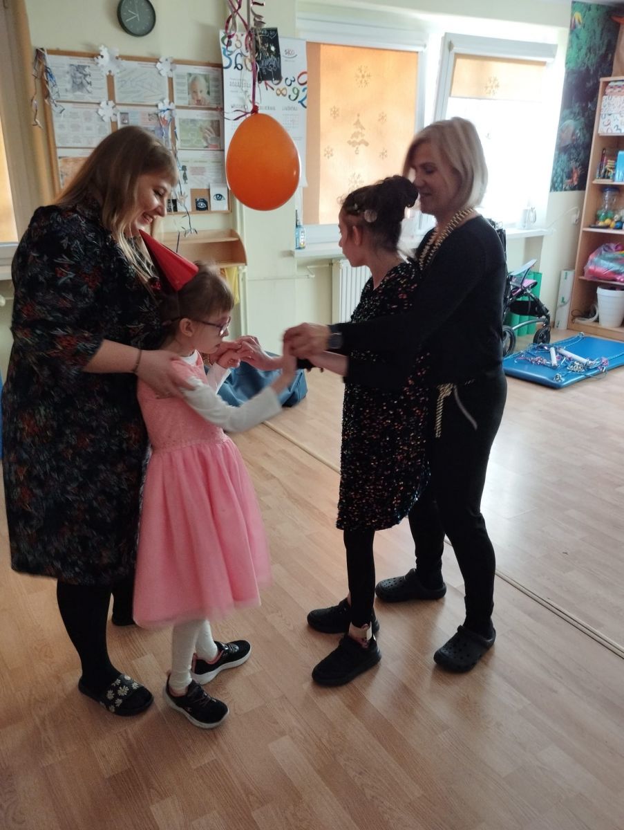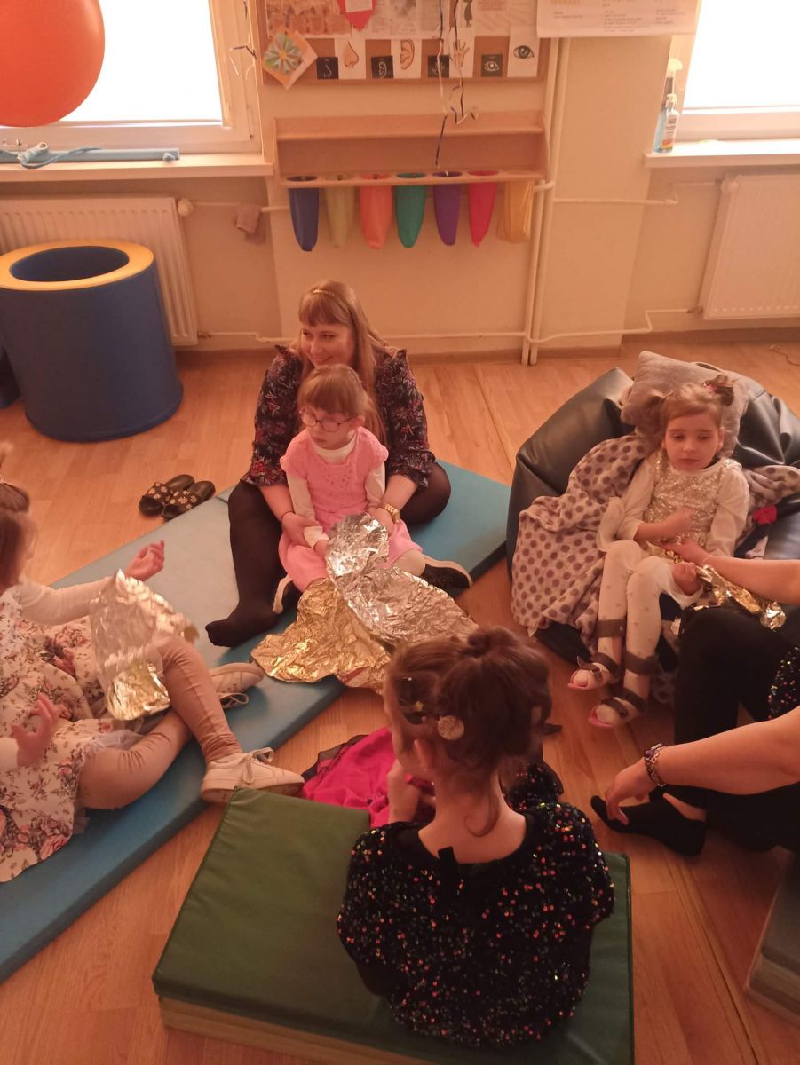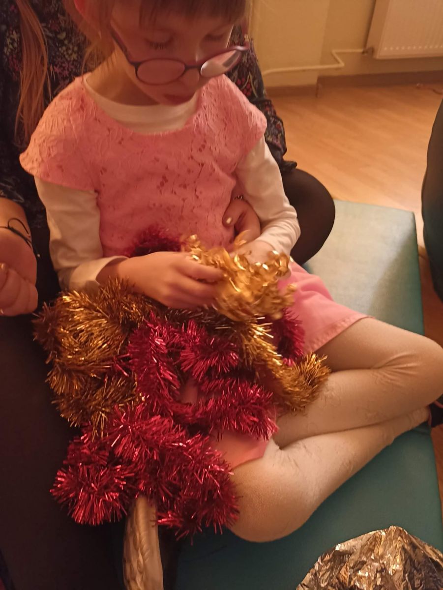 W styczniu rozwijałyśmy zmysł wzroku. Zajęcia z realizacji tego zadania połączone były z Balem Karnawałowym. Było bardzo wesoło, kolorowo i brokatowo. Na koniec balu dziewczynki wspólnie oglądały kolorowe książeczki, bawiły się serpentynami i kolorowymi łańcuchami choinkowymi oraz stymulowały wzrok poprzez kule świetlne.