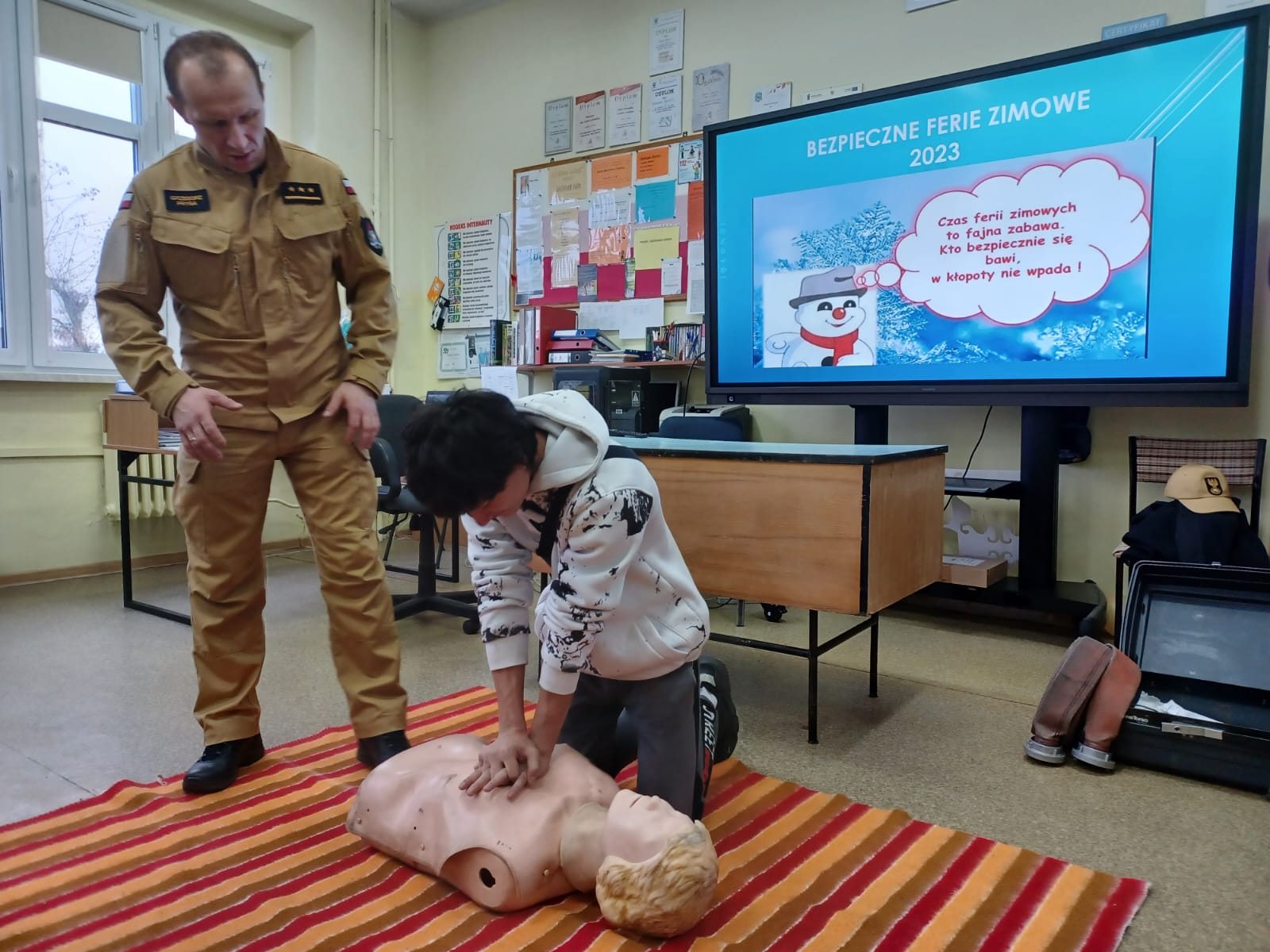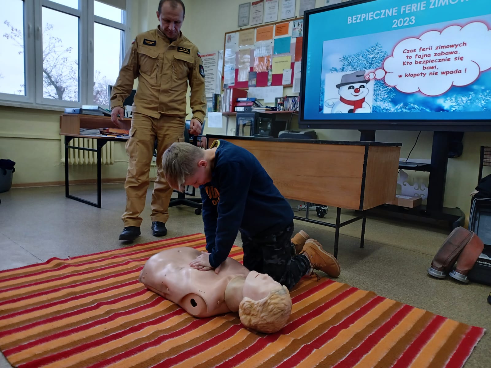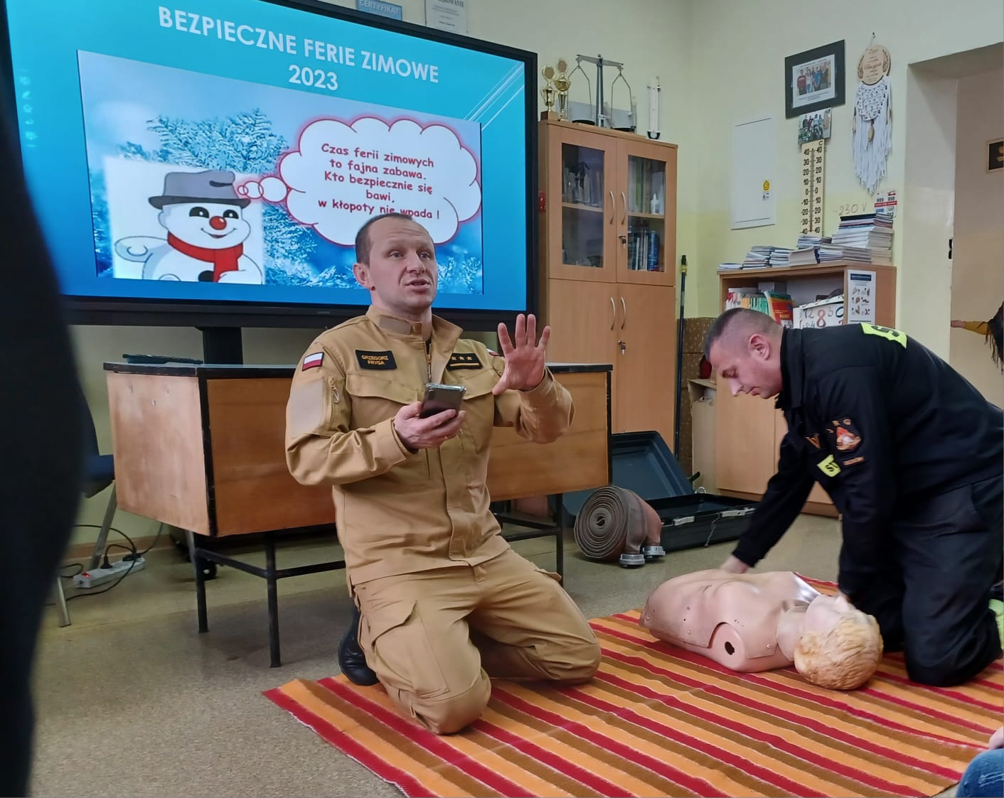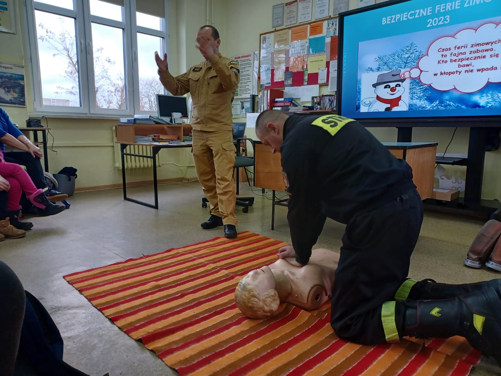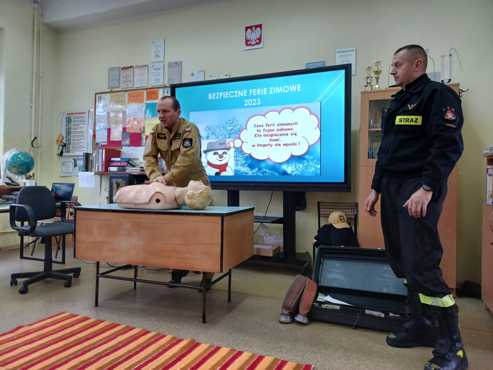 w bardzo przystępnej formie opowiedzieli o grożących niebezpieczeństwach podczas zabaw zimowych i tych związanych z zimową aurą, ale przede wszystkim skupili się na praktycznej stronie: jak sobie radzić, kiedy takie sytuacje kryzysowe wystąpią? Uczniowie poznali, ale też utrwalili zasady postępowania w momencie, gdy są świadkami wypadku, załamania tafli lodu, porażenia prądem, zatrucia tlenkiem węgla, zakrztuszenia itp. zdarzeń.