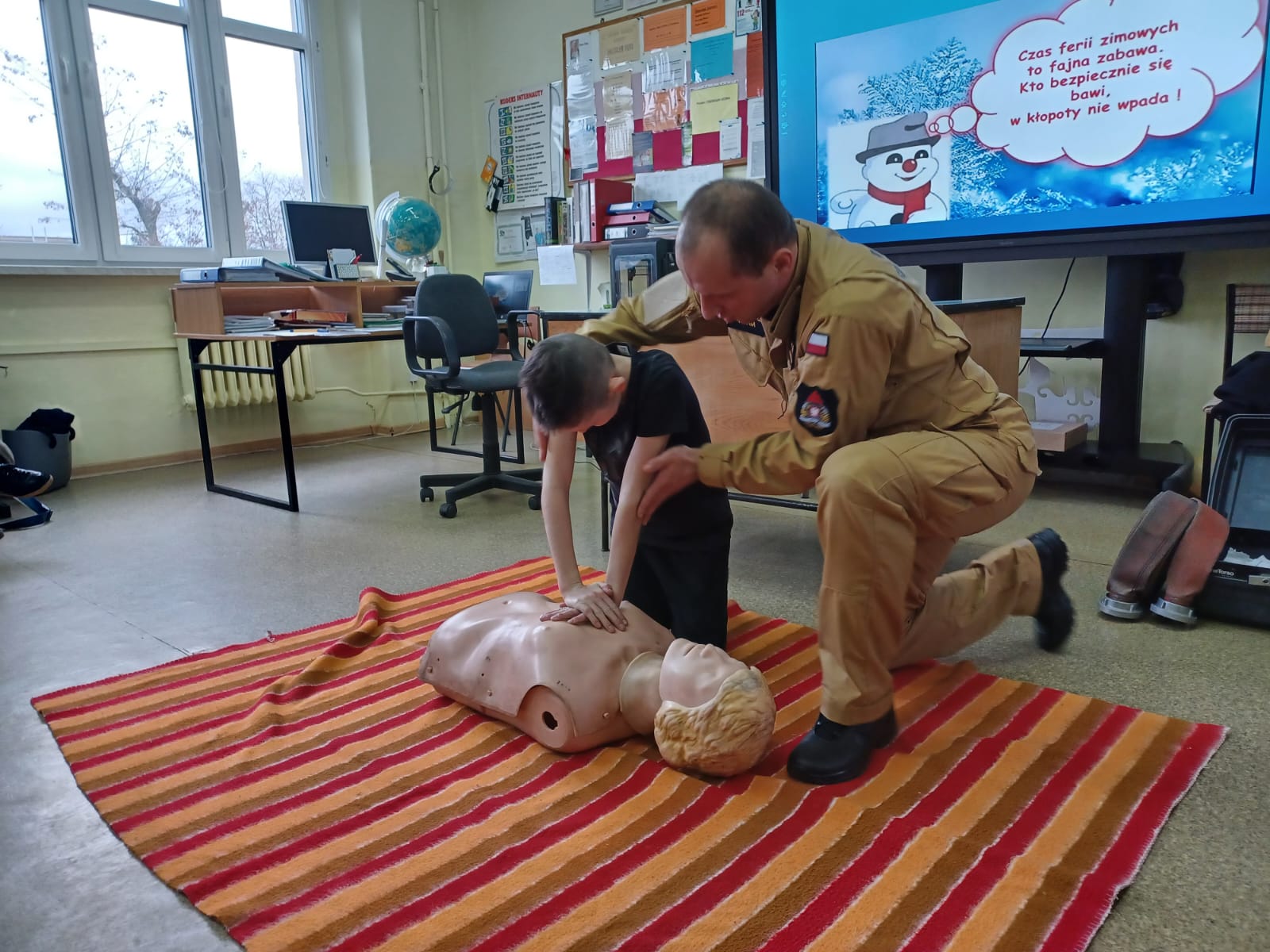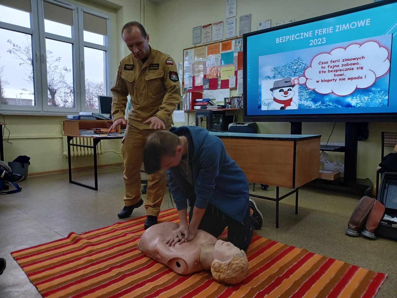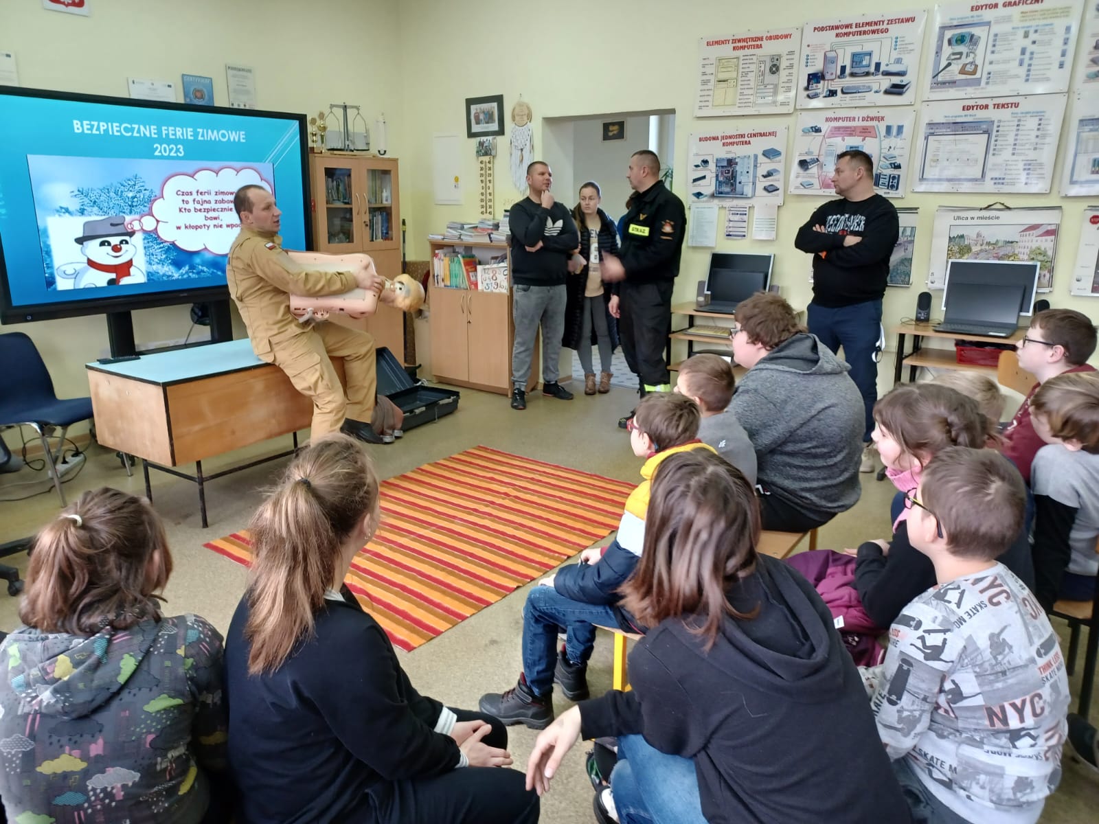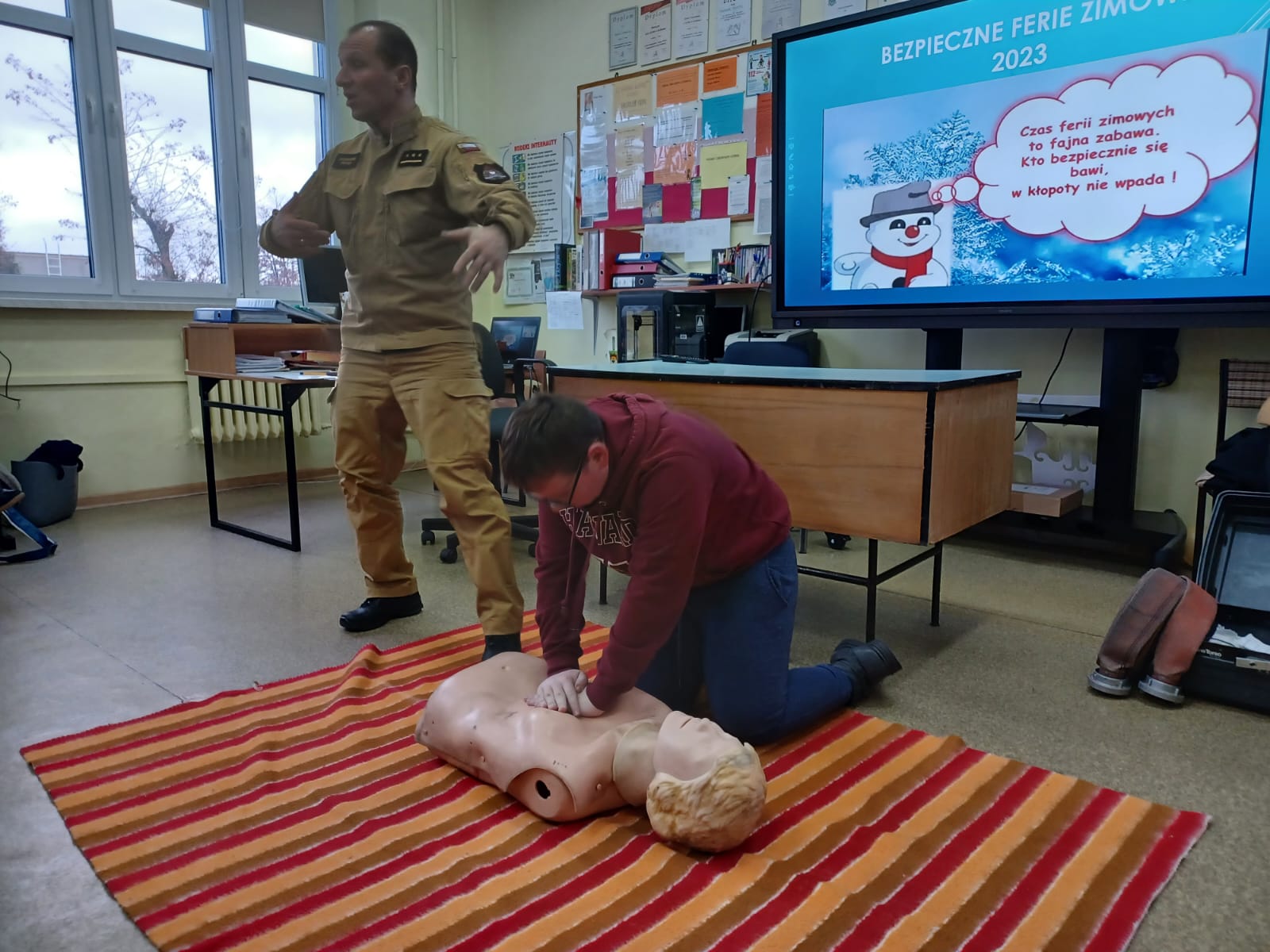 w bardzo przystępnej formie opowiedzieli o grożących niebezpieczeństwach podczas zabaw zimowych i tych związanych z zimową aurą, ale przede wszystkim skupili się na praktycznej stronie: jak sobie radzić, kiedy takie sytuacje kryzysowe wystąpią? Uczniowie poznali, ale też utrwalili zasady postępowania w momencie, gdy są świadkami wypadku, załamania tafli lodu, porażenia prądem, zatrucia tlenkiem węgla, zakrztuszenia itp. zdarzeń.
