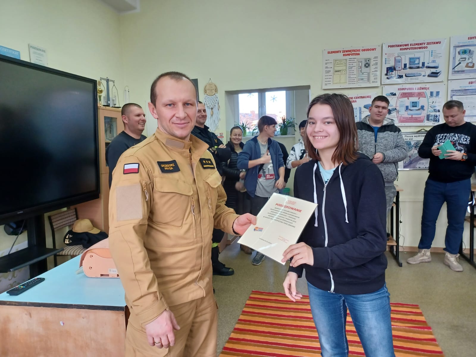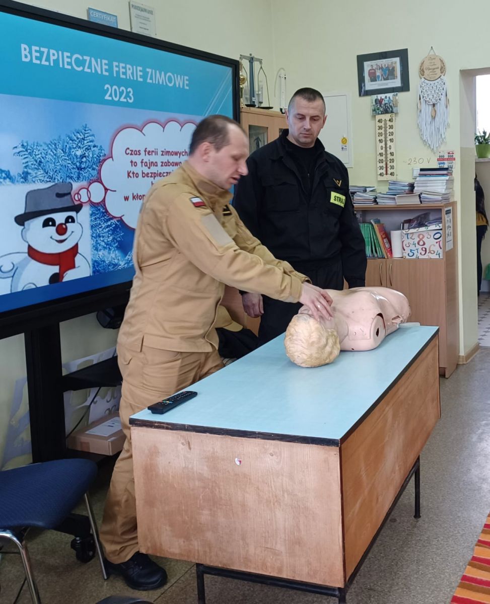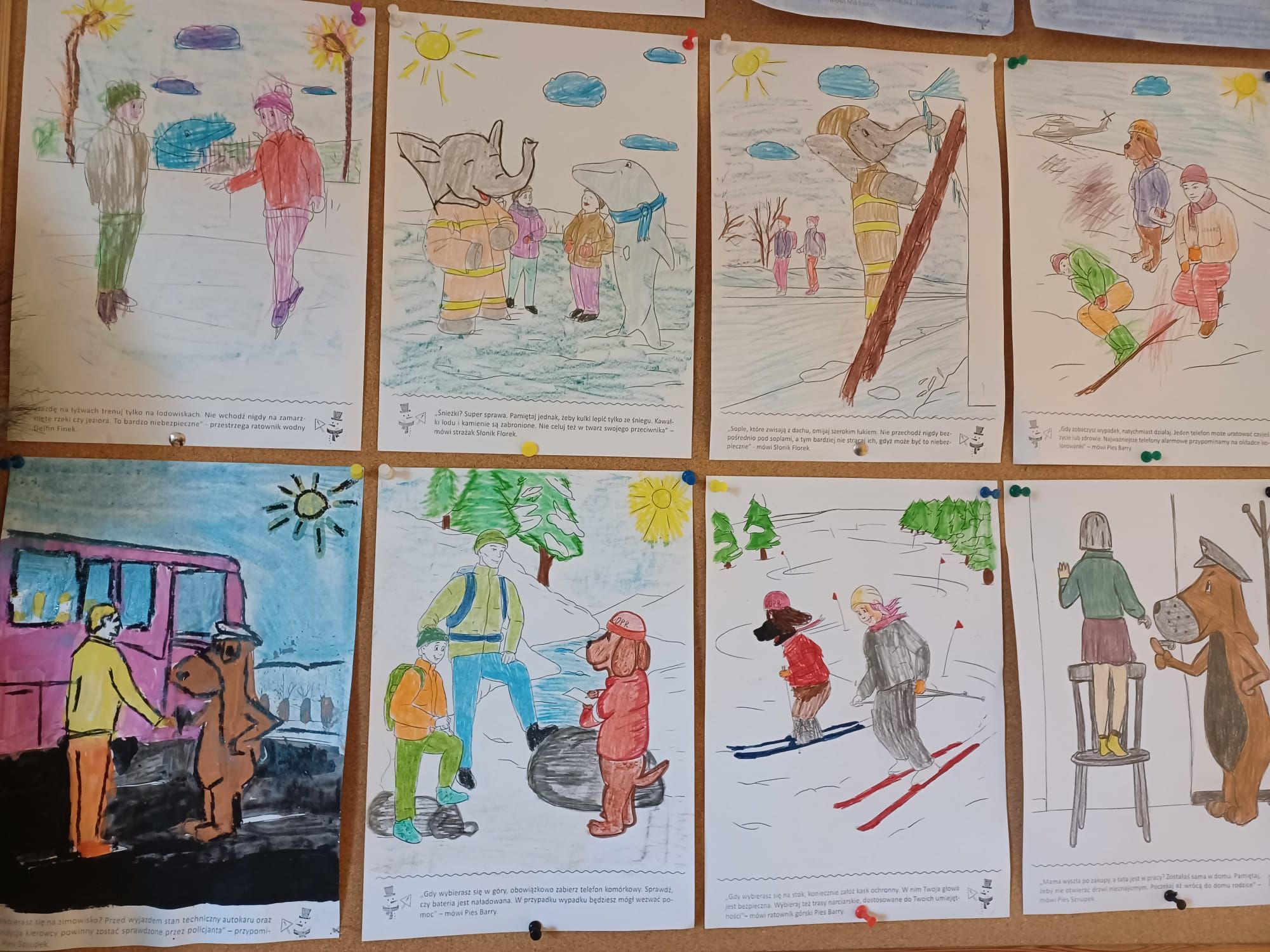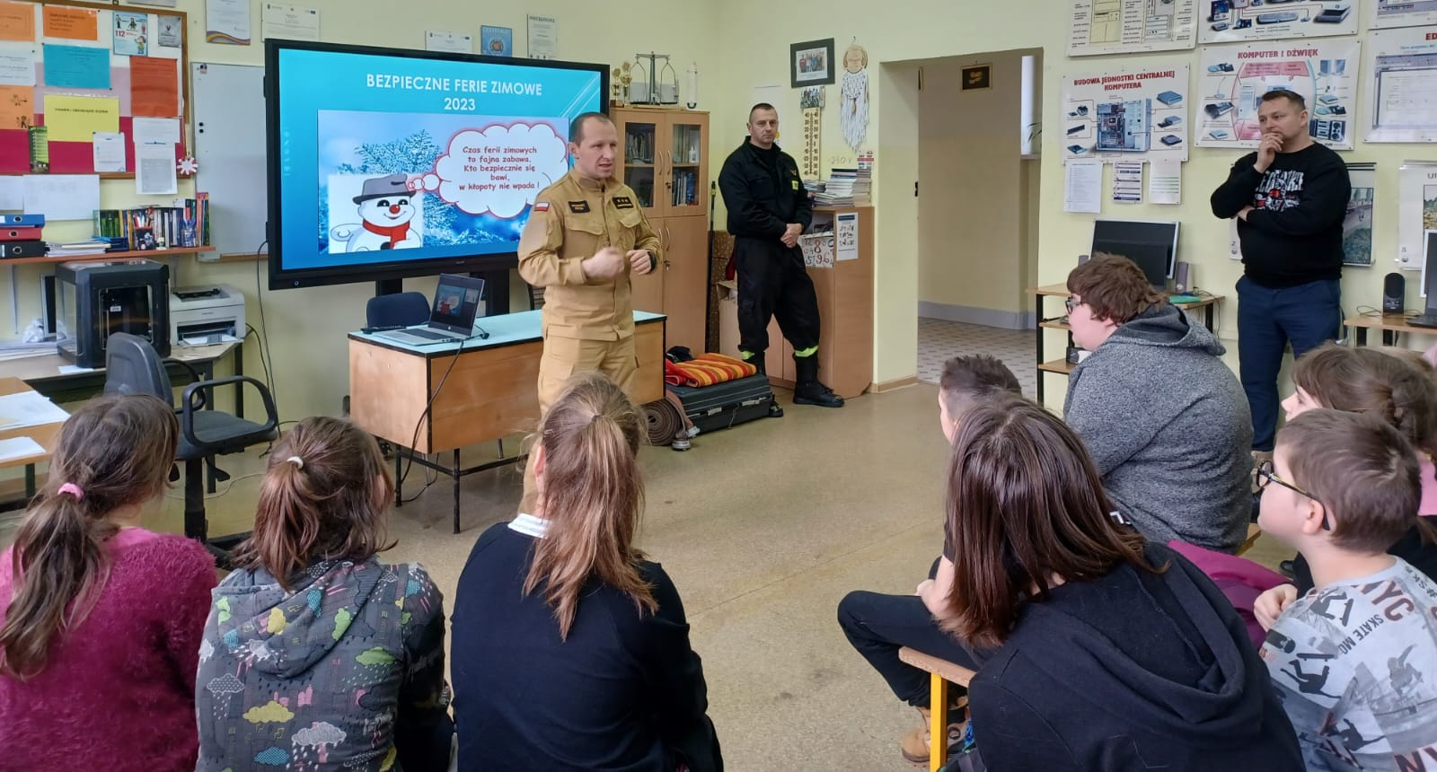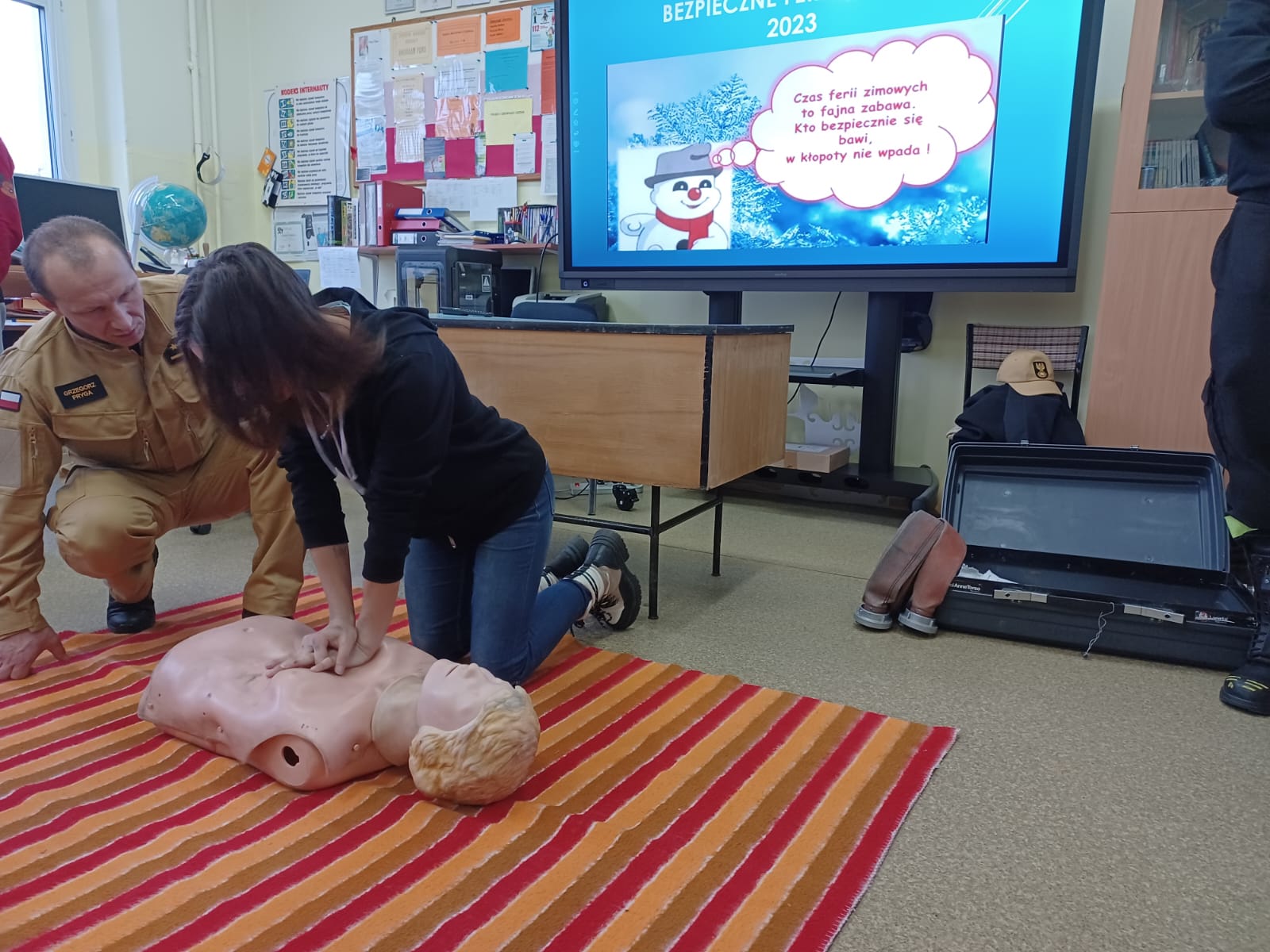 w bardzo przystępnej formie opowiedzieli o grożących niebezpieczeństwach podczas zabaw zimowych i tych związanych z zimową aurą, ale przede wszystkim skupili się na praktycznej stronie: jak sobie radzić, kiedy takie sytuacje kryzysowe wystąpią? Uczniowie poznali, ale też utrwalili zasady postępowania w momencie, gdy są świadkami wypadku, załamania tafli lodu, porażenia prądem, zatrucia tlenkiem węgla, zakrztuszenia itp. zdarzeń.