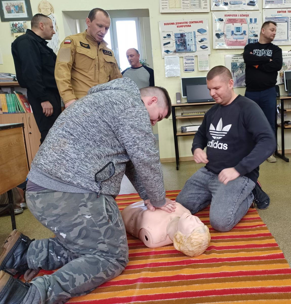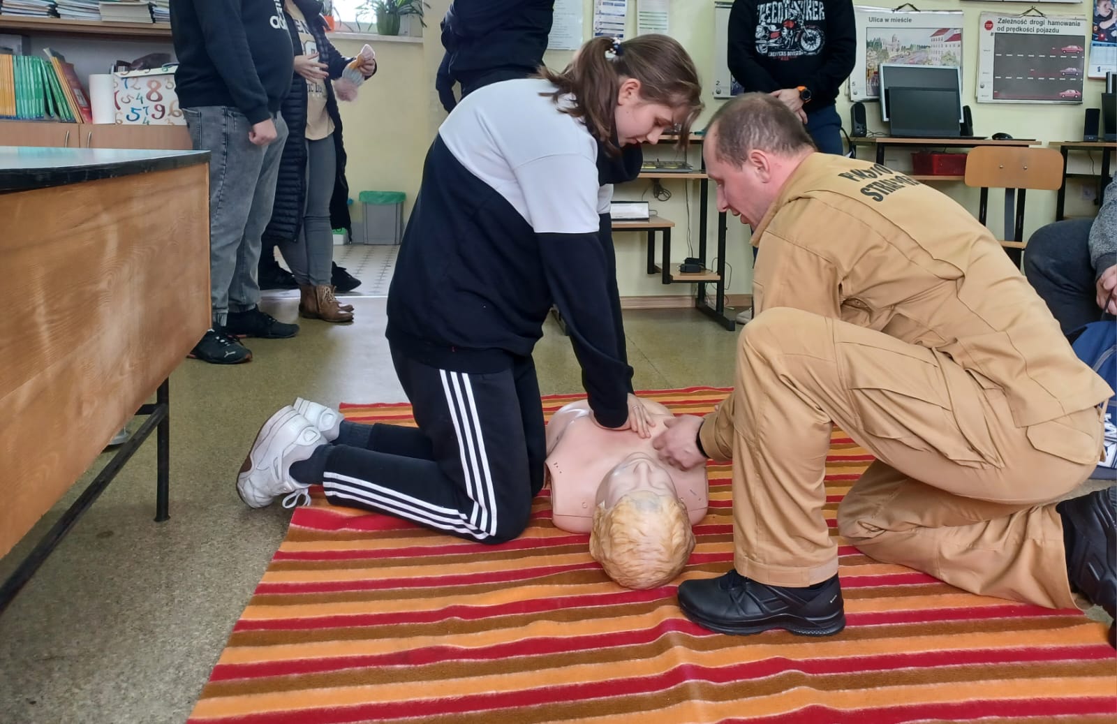 Ćwiczenia w udzielaniu pierwszej pomocy wzbudziły duże zainteresowanie i zaangażowało się w niewielu uczniów, i tych młodszych, i tych starszych. A fachowy instruktaż i praktyczne ćwiczenia pozwoliły od razu skorygować ewentualne błędy i uświadomić, że taka czynna postawa ratuje życie.