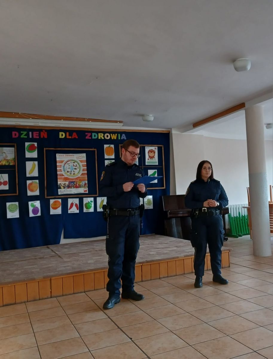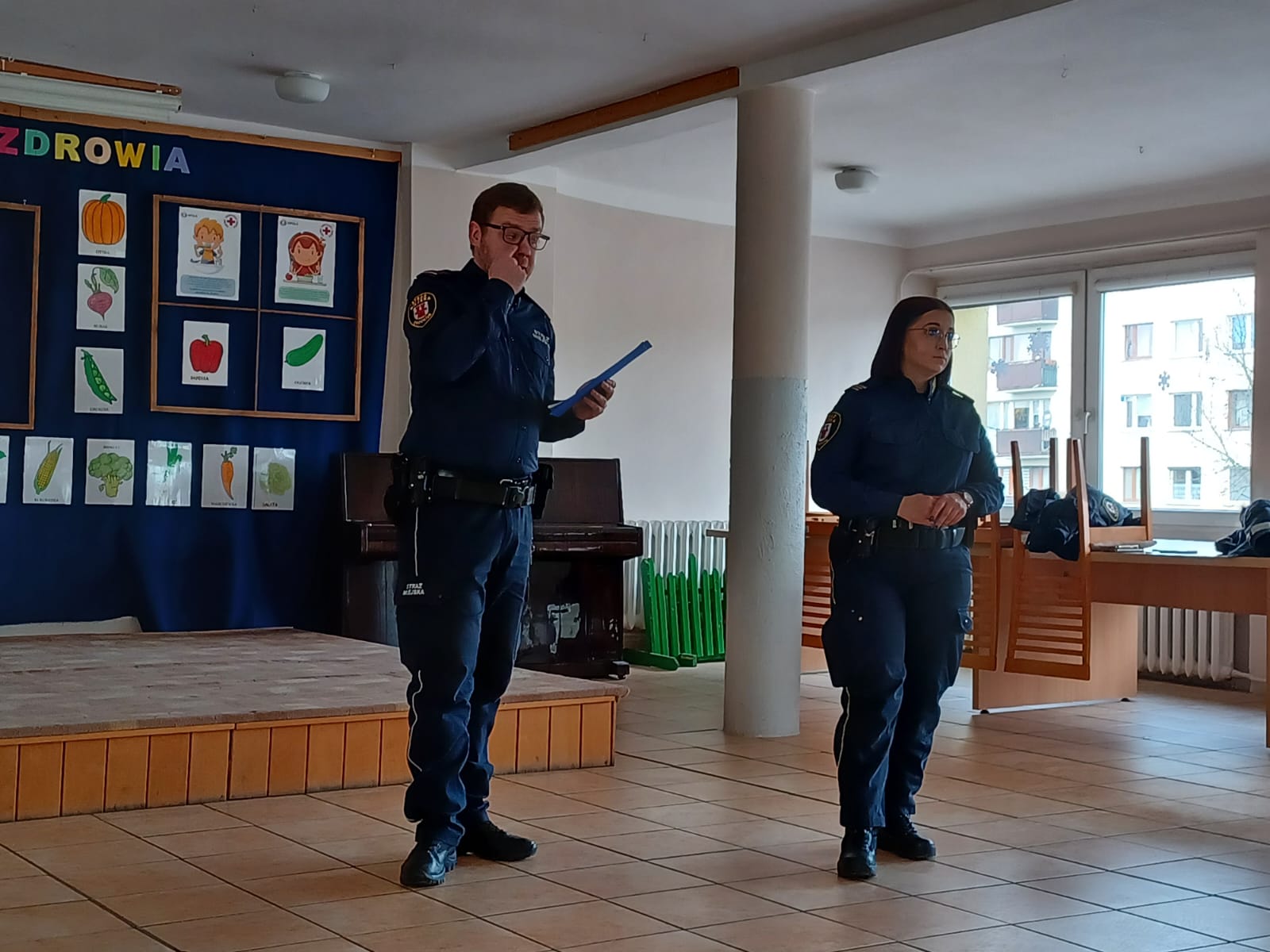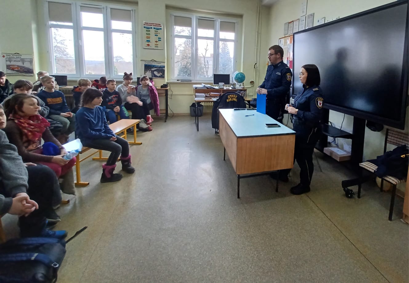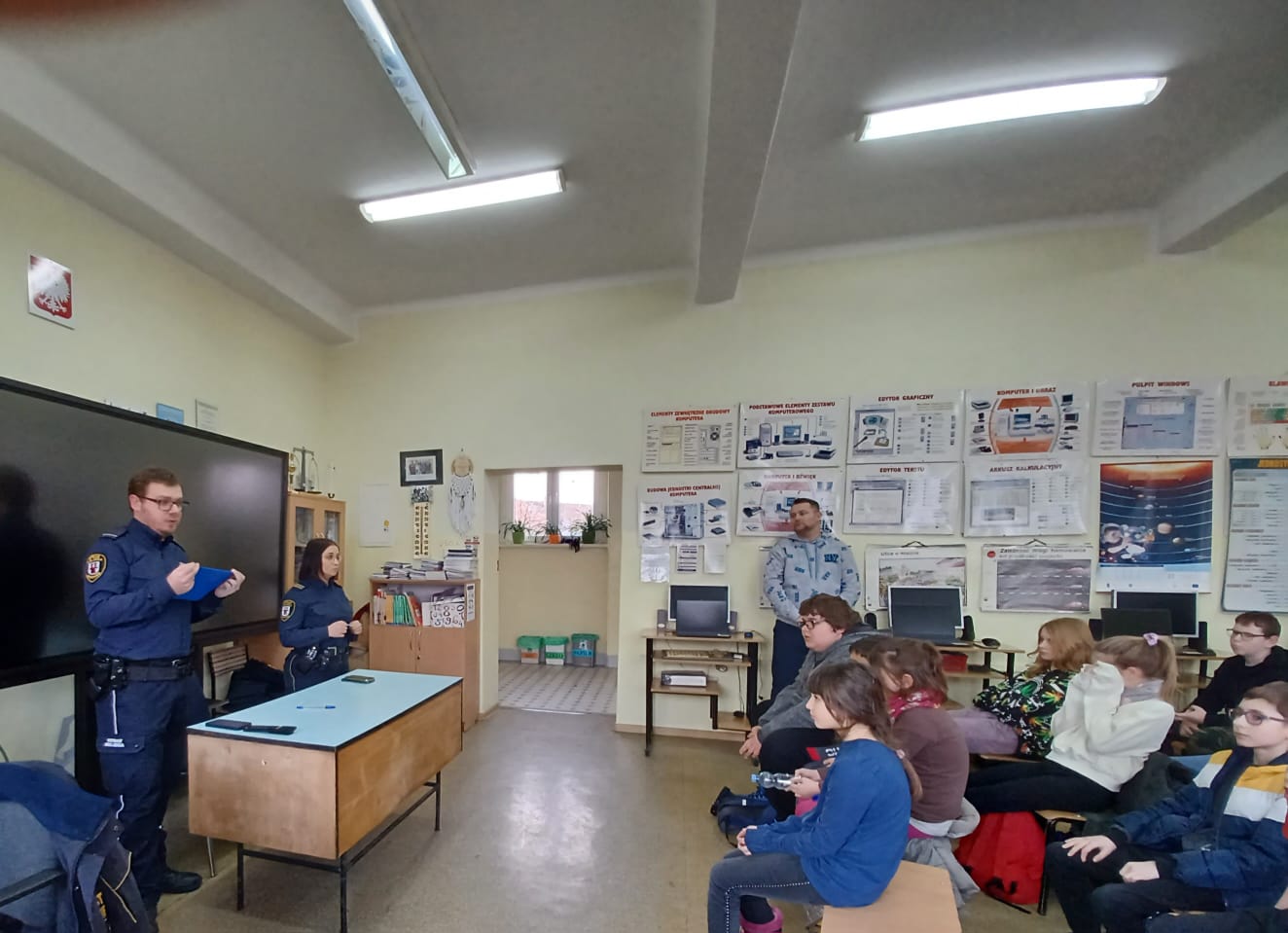 Kolejnym punktem „Tygodnia Bezpieczeństwa” było spotkanie z przedstawicielami Straży Miejskiej w Grodkowie. Pani Natalia i pan Patryk, oprócz powtórzenia zasad bezpiecznego poruszania się pieszego w ruchu drogowym, skupili się na aspekcie prawnym przebywania młodych w miejscach publicznych oraz korzystania przez nich z zasobów sieci Internetu. Uczniowie pozyskali wiedzę na temat ewentualnych konsekwencji wydawałoby się beztrosko spędzanego czasu w wirtualnym świecie. Strażnicy przestrzegali przede wszystkim przed zawieraniem „internetowych” znajomości i udzielili wskazówek, jak reagować, gdy takie sytuacje zaistnieją.