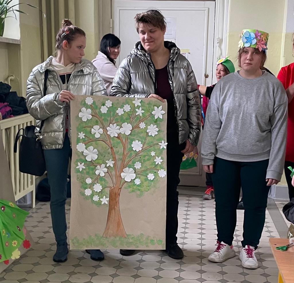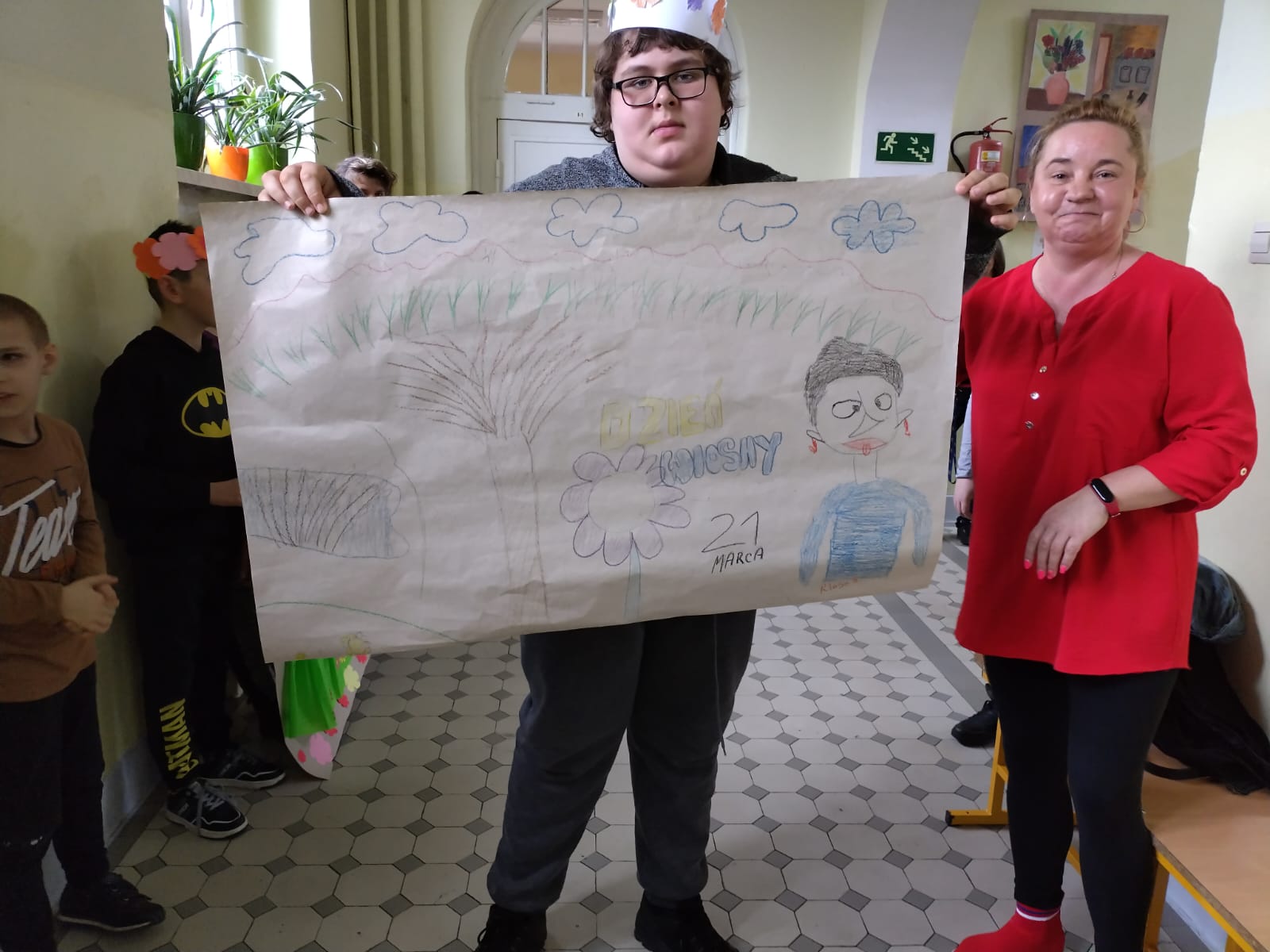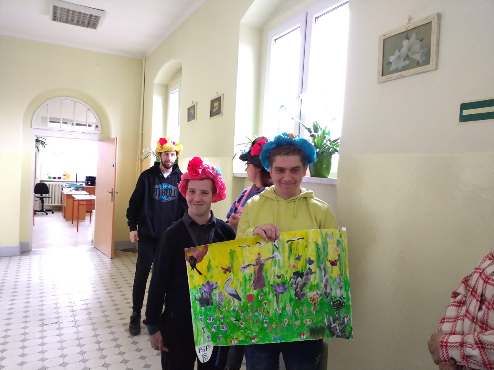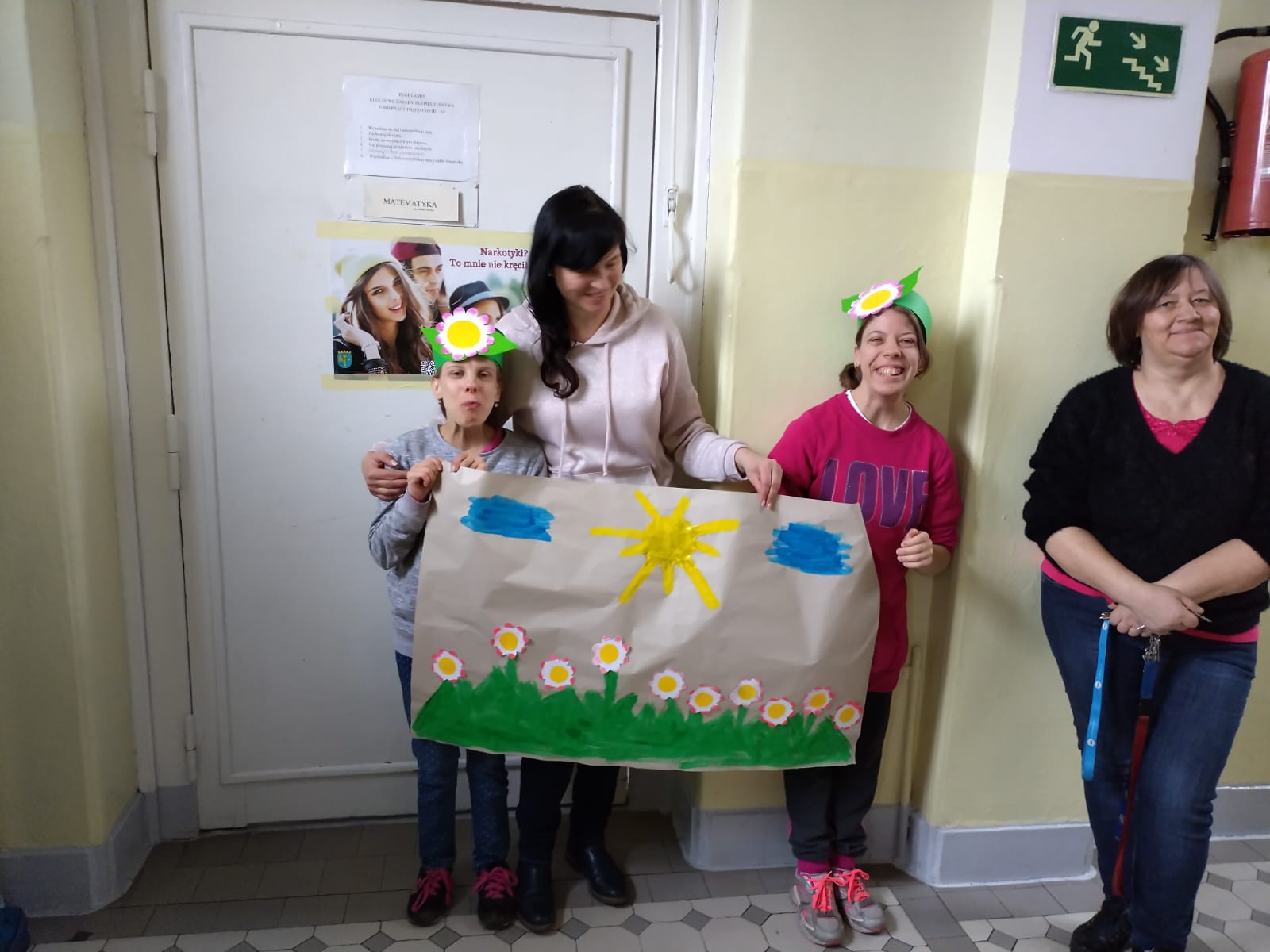 Nasi podopieczni wykonali piękne prace plastyczne w formie plakatów. Każda klasa w ramach Akcji Integracji wykonała przepiękne, wiosenne nakrycia na głowy. W holu szkoły odbyła się prezentacja prac. Ostatnim punktem uroczystości było wyjście wszystkich uczniów do grodkowskiego Kina Klaps.