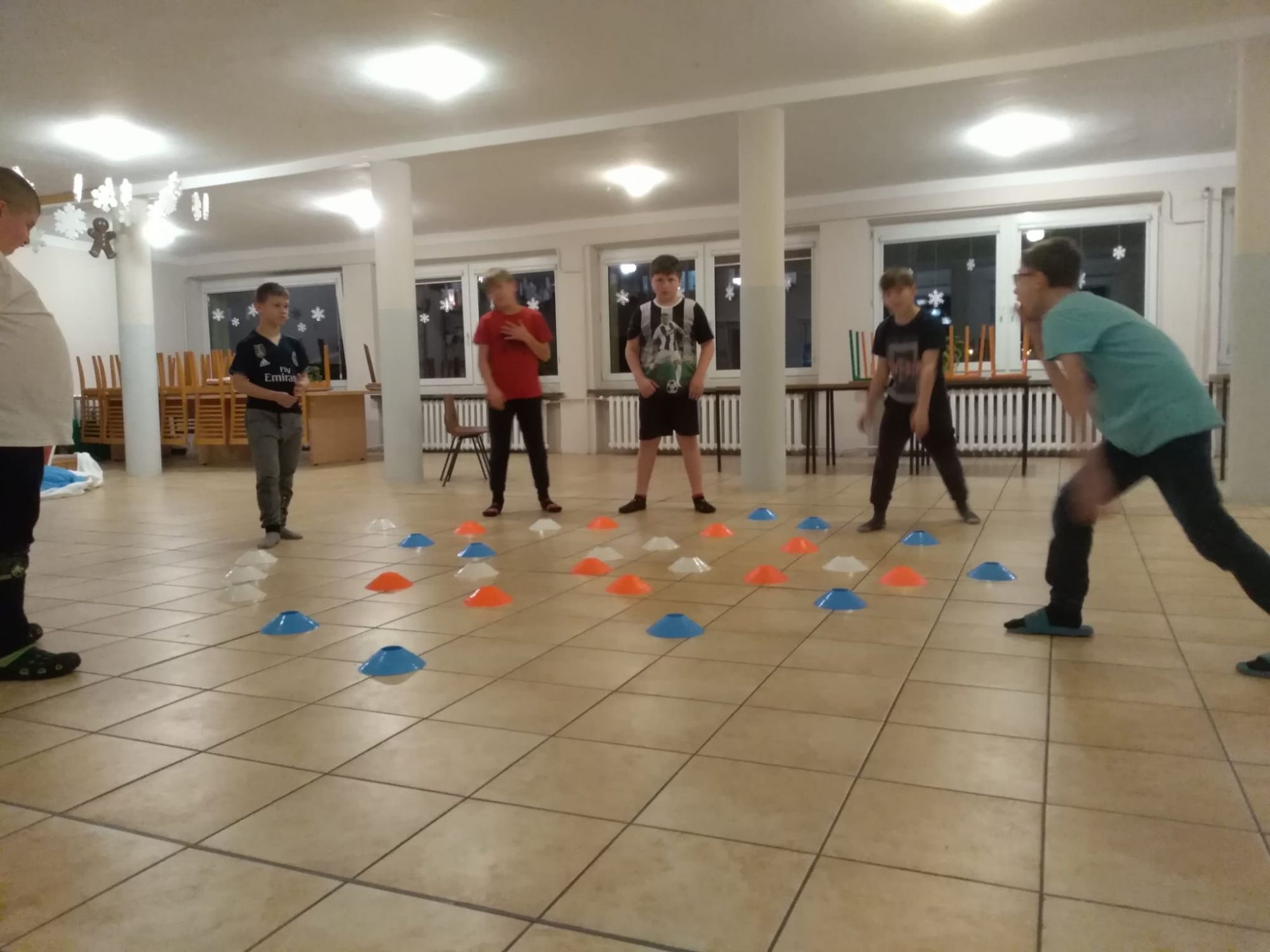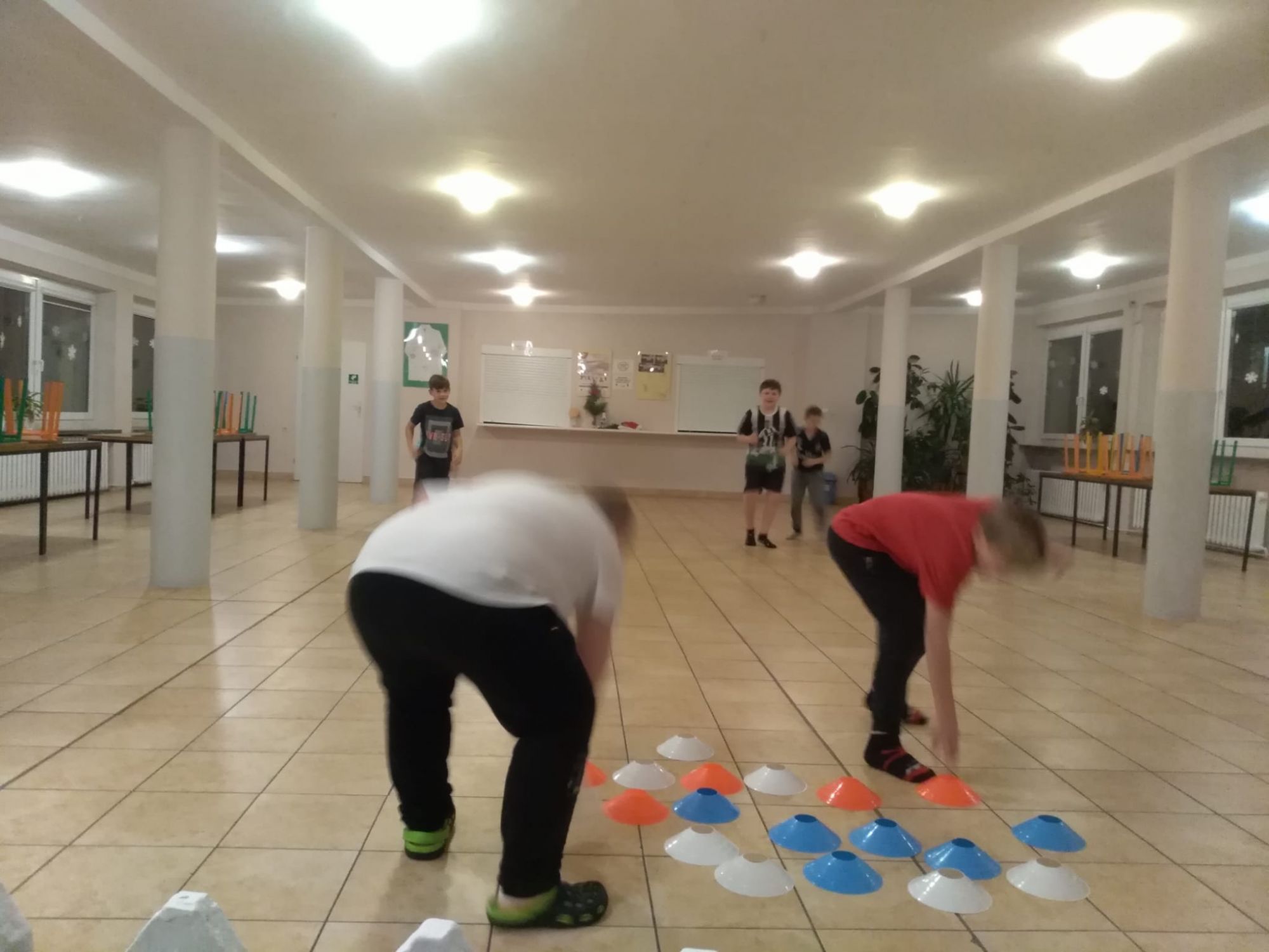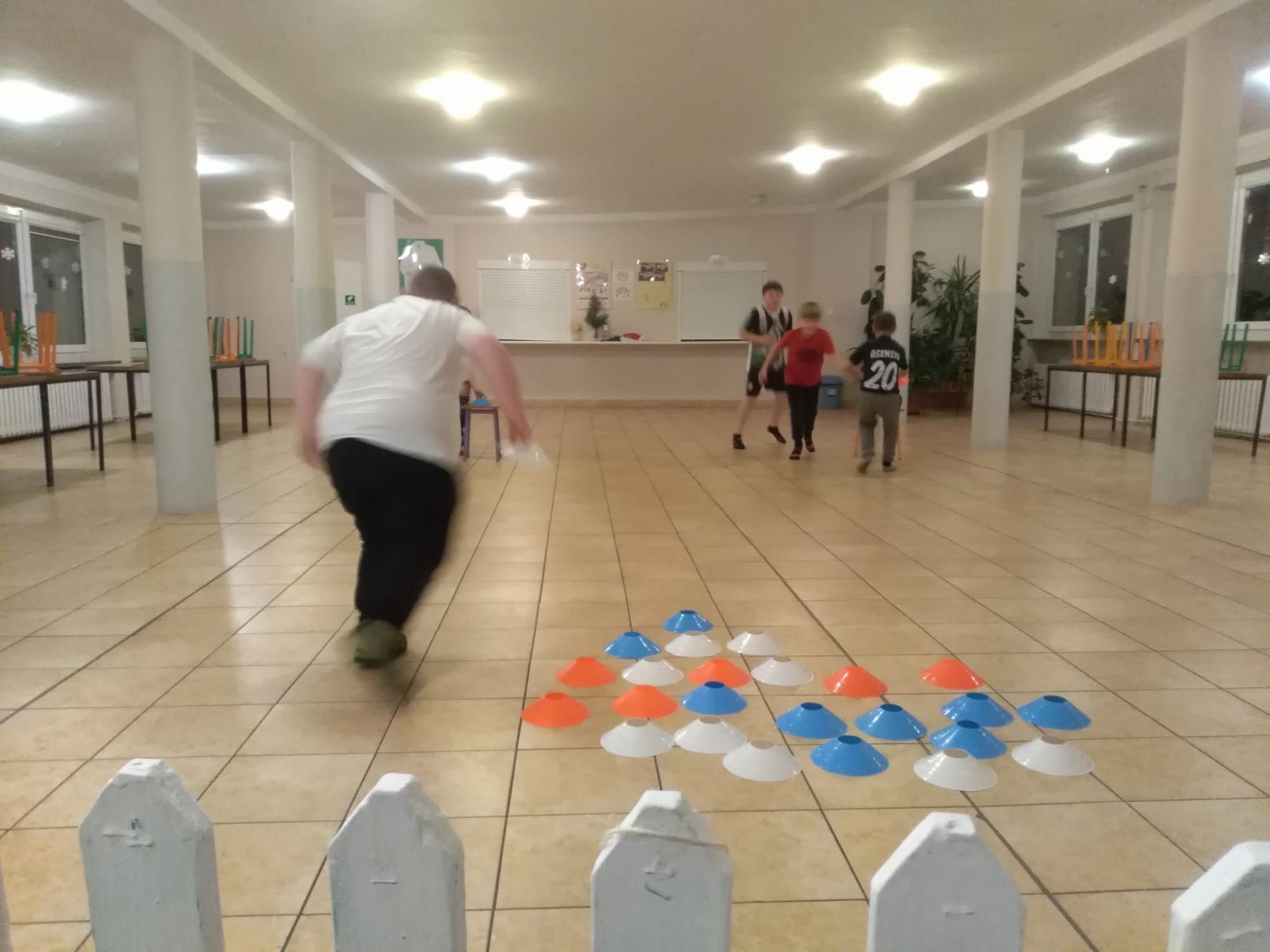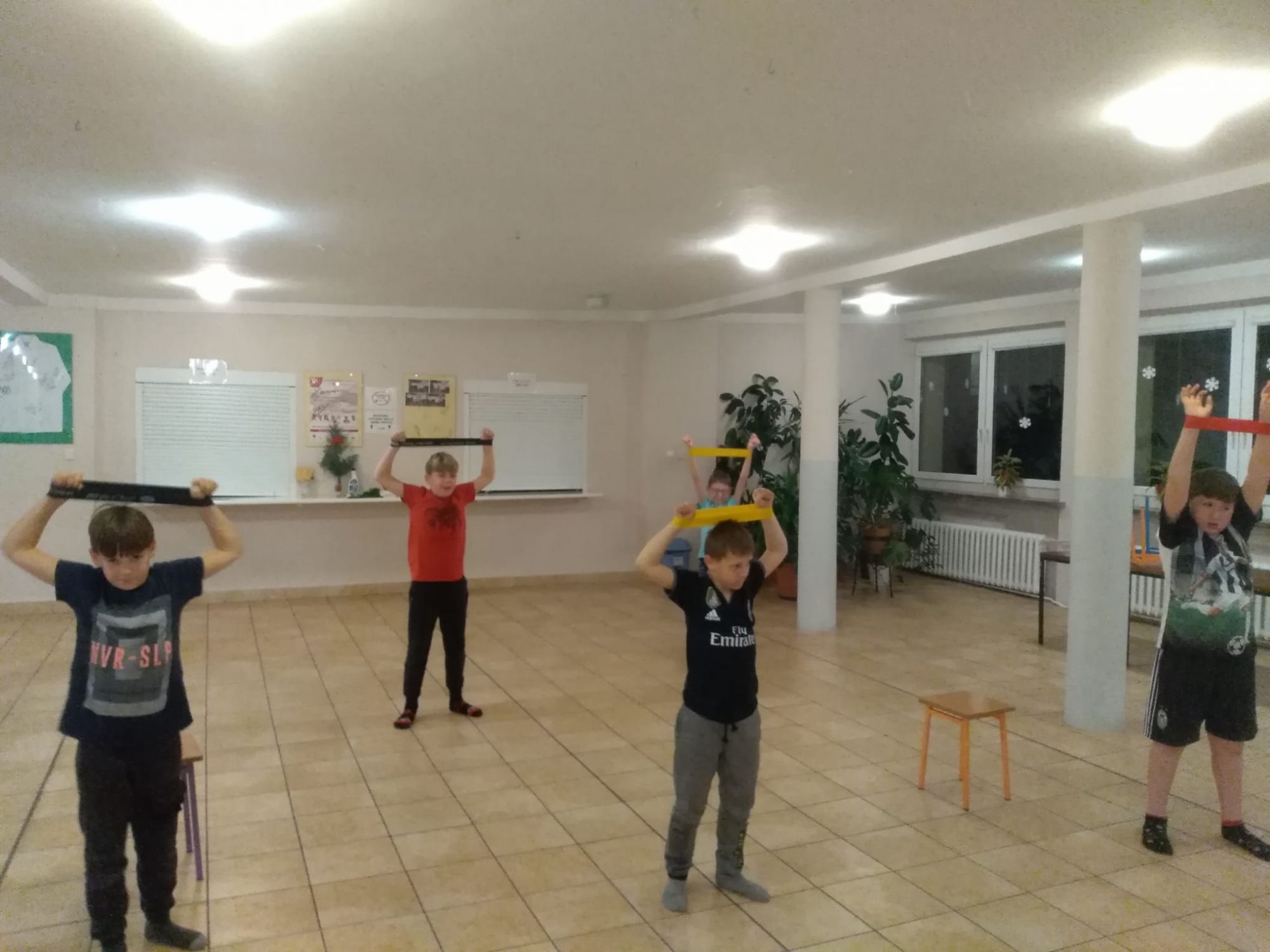 Wychowankpowie m. in. wykonywali ćwiczenia górnych partii mięśniowych na gumach mini band, poznali zabaway ruchowe z wykorzystaniem płaskich pachołkow oraz korzystali z uroków zimowej aury. Podczas zajęć u wszystkich gościł uśmiech twarzach.