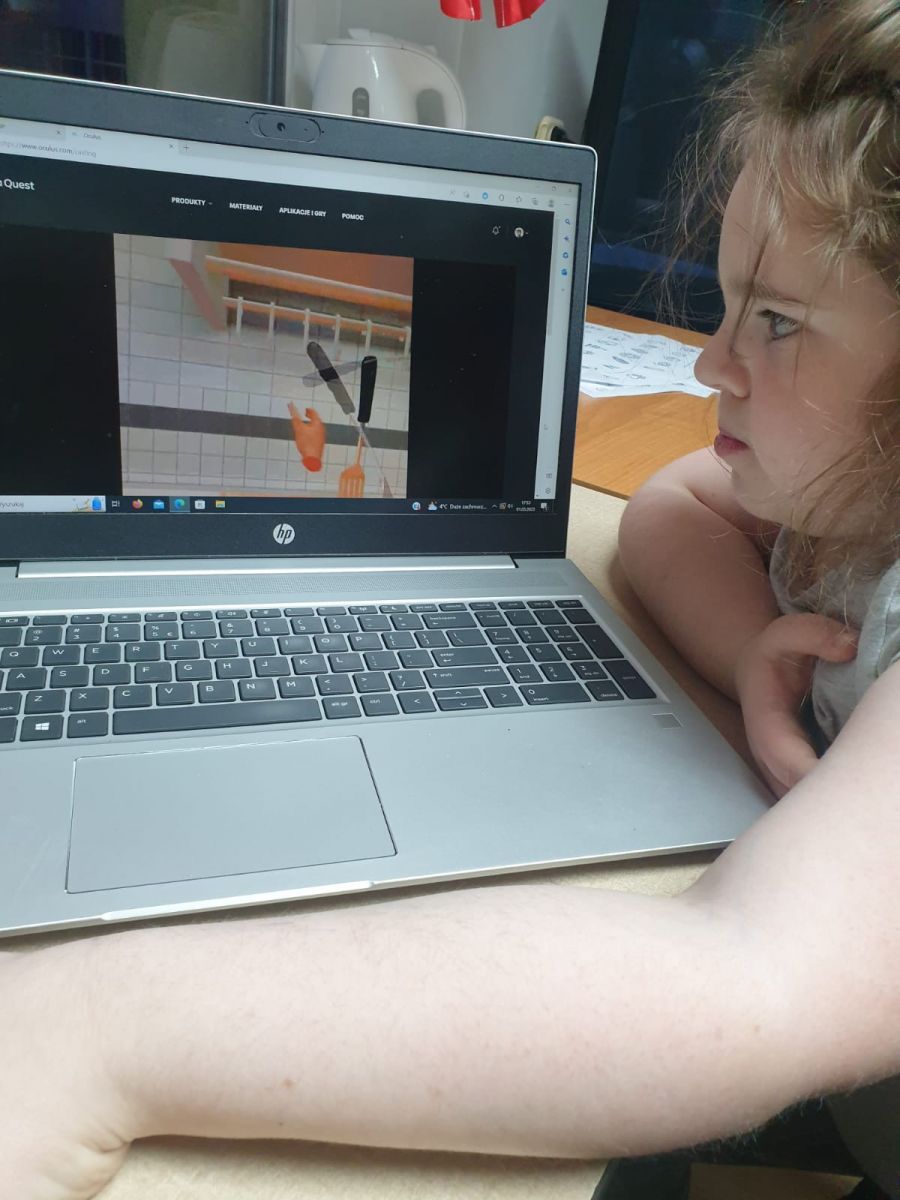 Zajęcia pozwalają na wirtualną adaptację w kuchni. Wiedzą gdzie można znaleźć potrzebne produkty czy przyprawy. Każdy ruch wymaga skupienia i precyzji w wykonaniu. Wiele radości i zabawy przyniosły drobne niepowodzenia np. wysypane z garnka ziemniaki, które można podnieść z ziemi, by następnie je poukładać.
