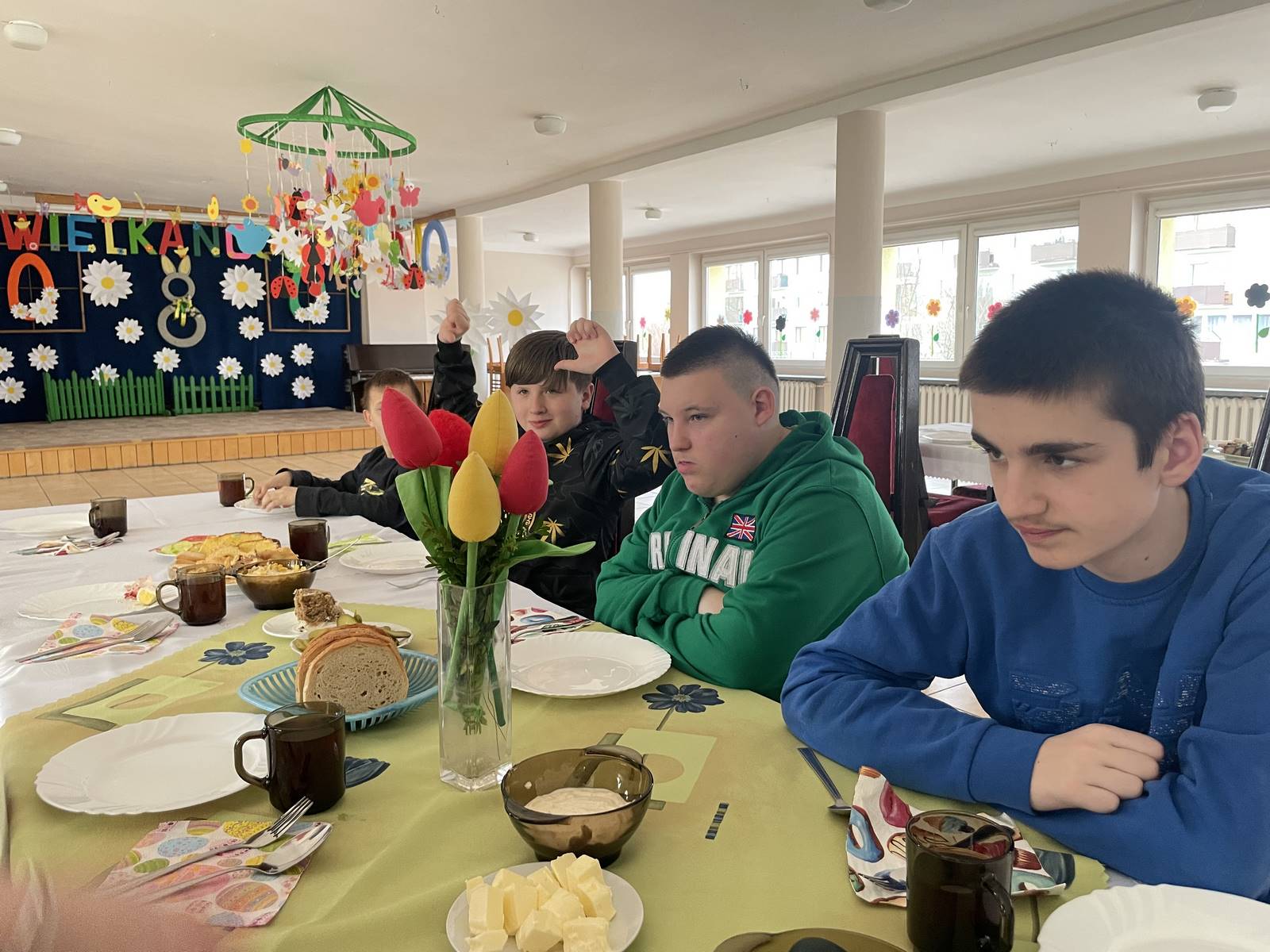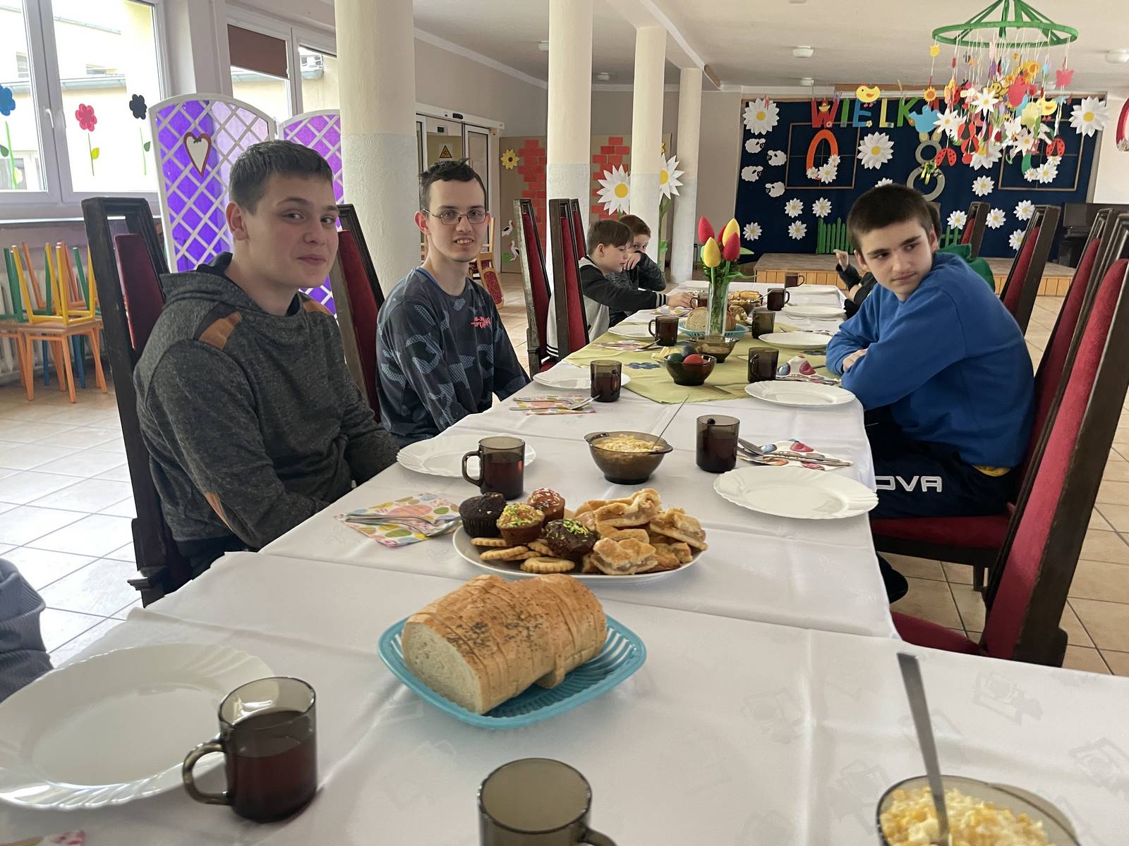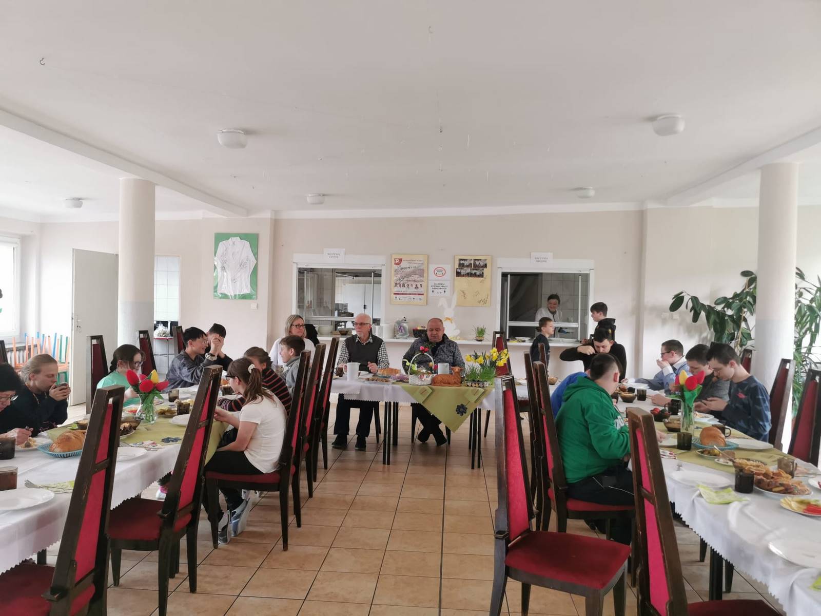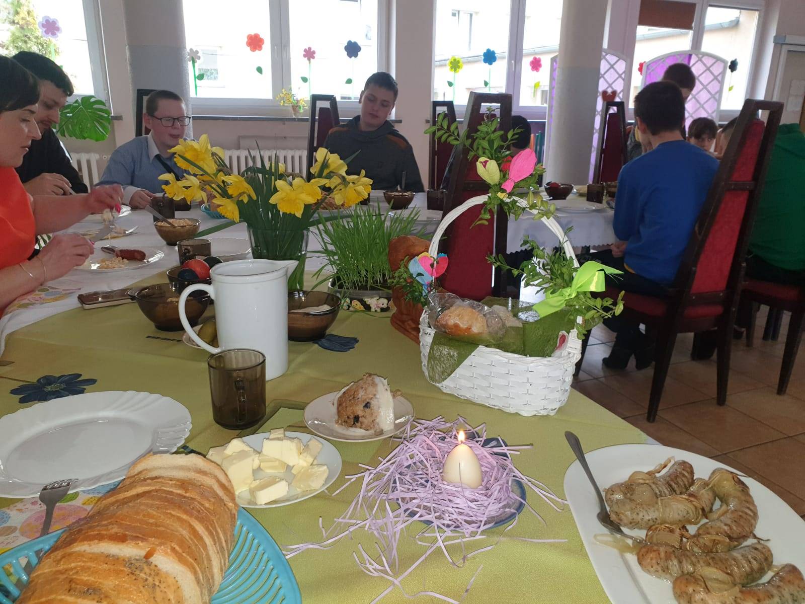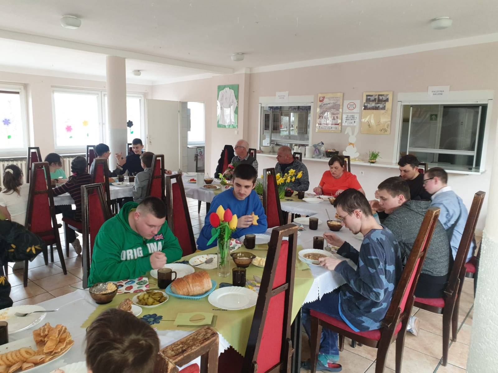 Wszyscy mogli raczyć się przygotowanymi na ten dzień posiłkami, związanymi z tradycją Świąt Wielkiej Nocy. Wychowawcy i wychowankowie wespół podzielili się również jajkiem. Na koniec wychowawcy zorganizowali konkurs na najpiękniejszą pisankę. Najładnieszą pracę wykonał Kacper Danyluk, następny był Patryk Zapotoczny.