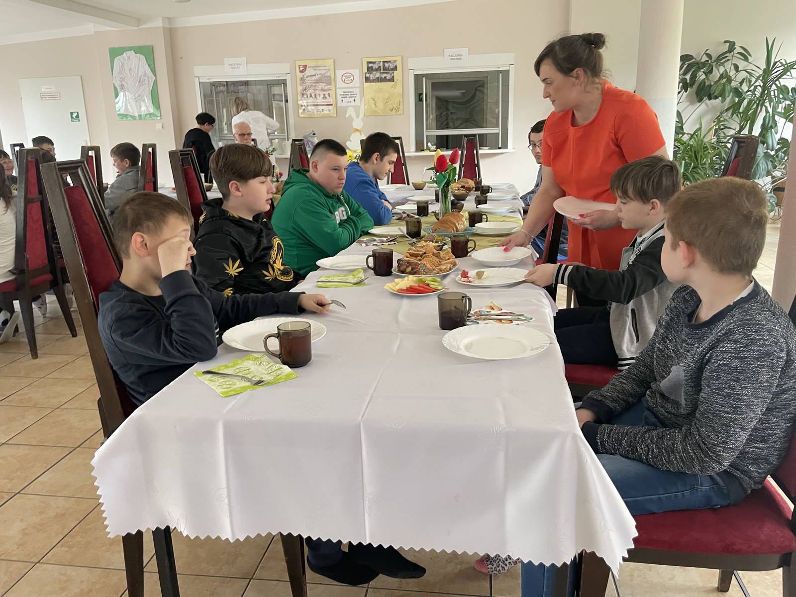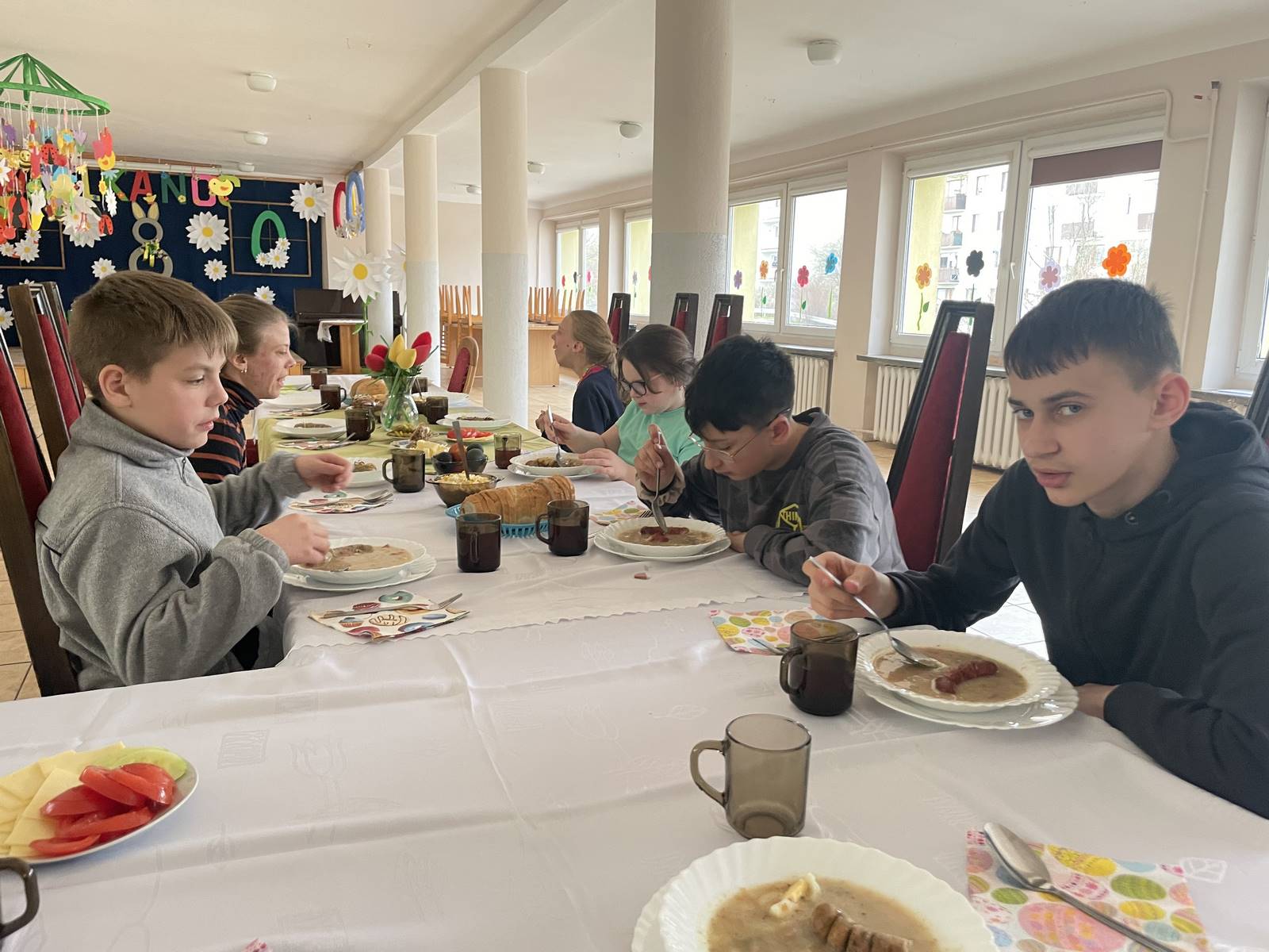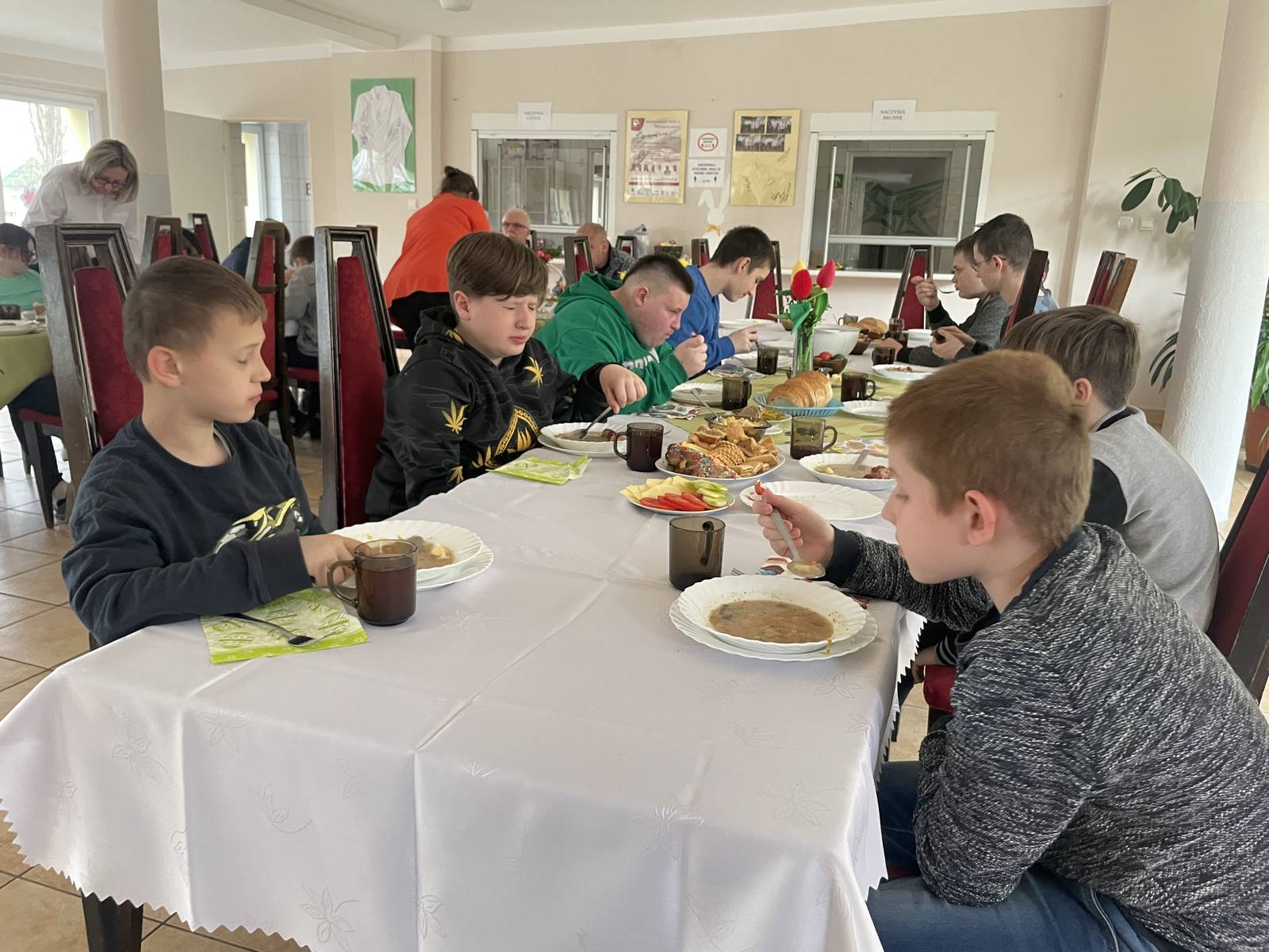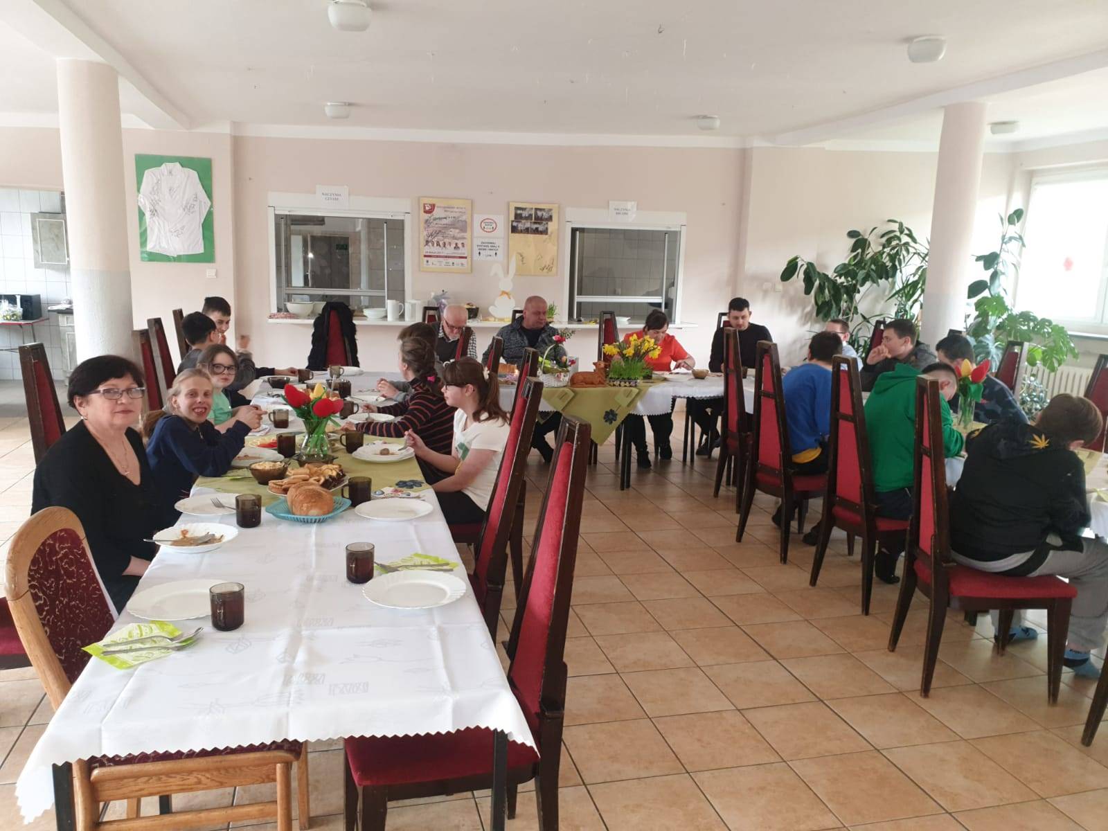 Wszyscy mogli raczyć się przygotowanymi na ten dzień posiłkami, związanymi z tradycją Świąt Wielkiej Nocy. Wychowawcy i wychowankowie wespół podzielili się również jajkiem. Na koniec wychowawcy zorganizowali konkurs na najpiękniejszą pisankę. Najładnieszą pracę wykonał Kacper Danyluk, następny był Patryk Zapotoczny.