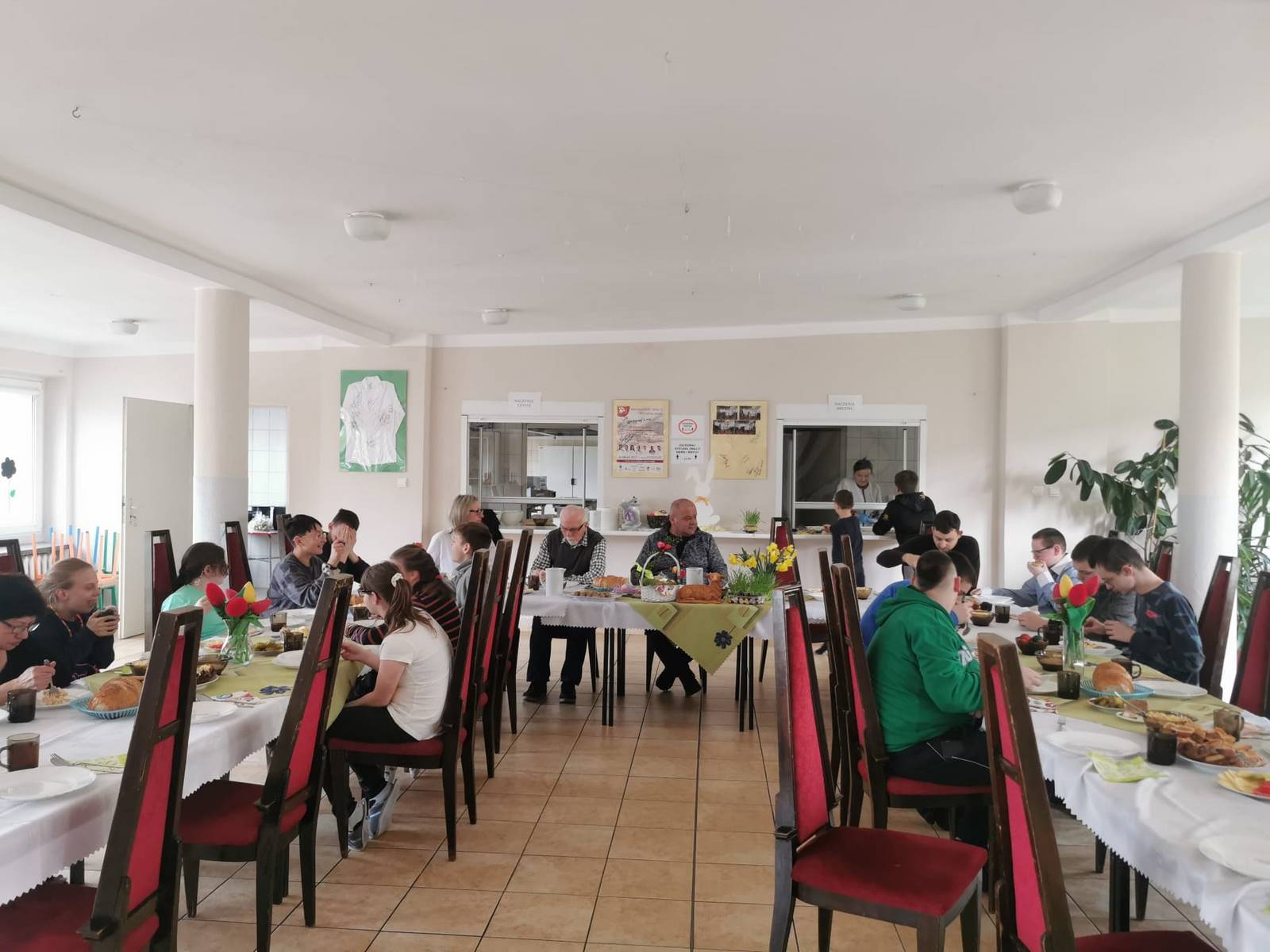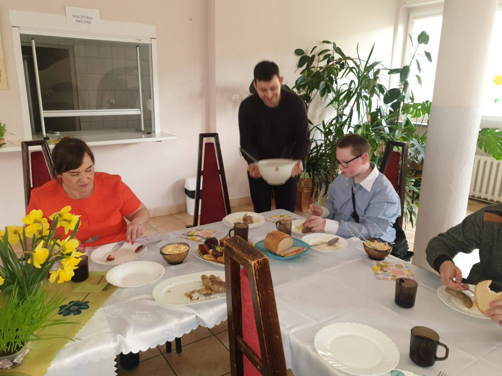 Do przygotowanego stołu przysiedli wspólnie wychowawcy i wychowankowie. Spotkanie było wspólną chwilą integracji, przypomnieniem dla wszystkich jak ważnymi są nadchodzące Święta Wielkanocne.