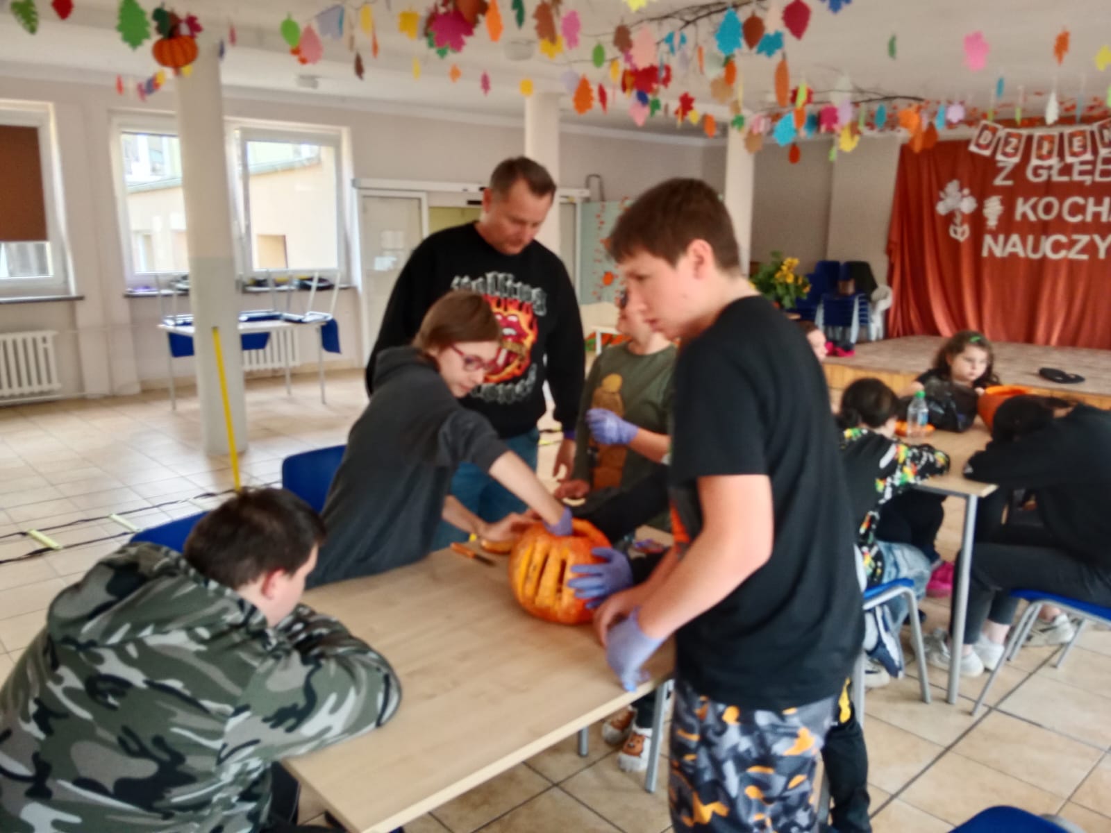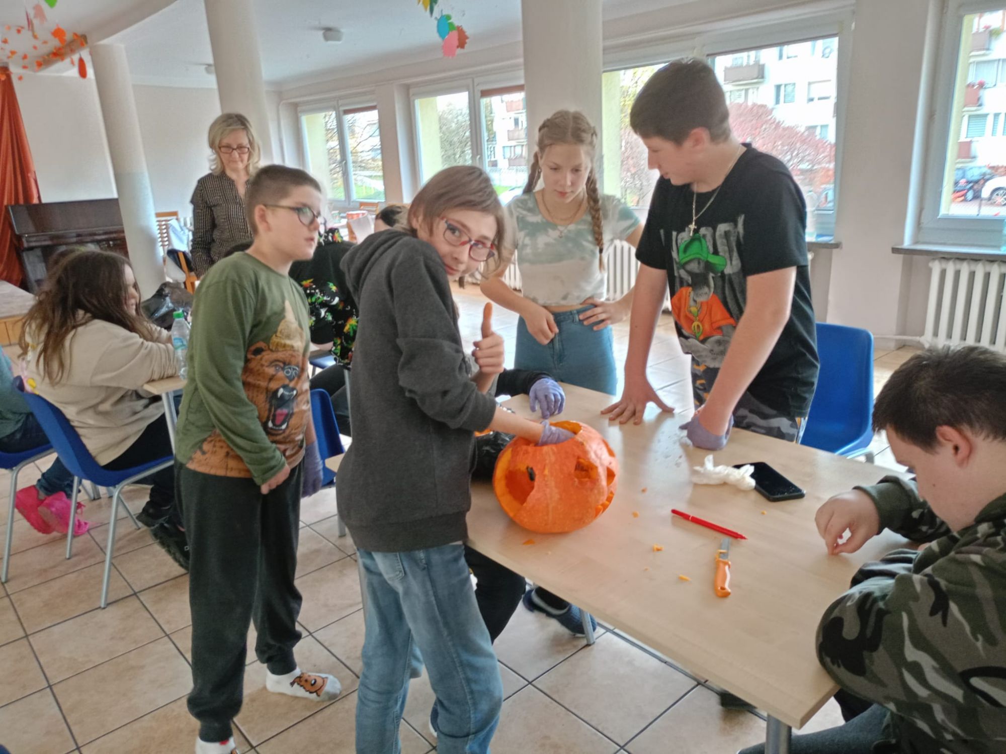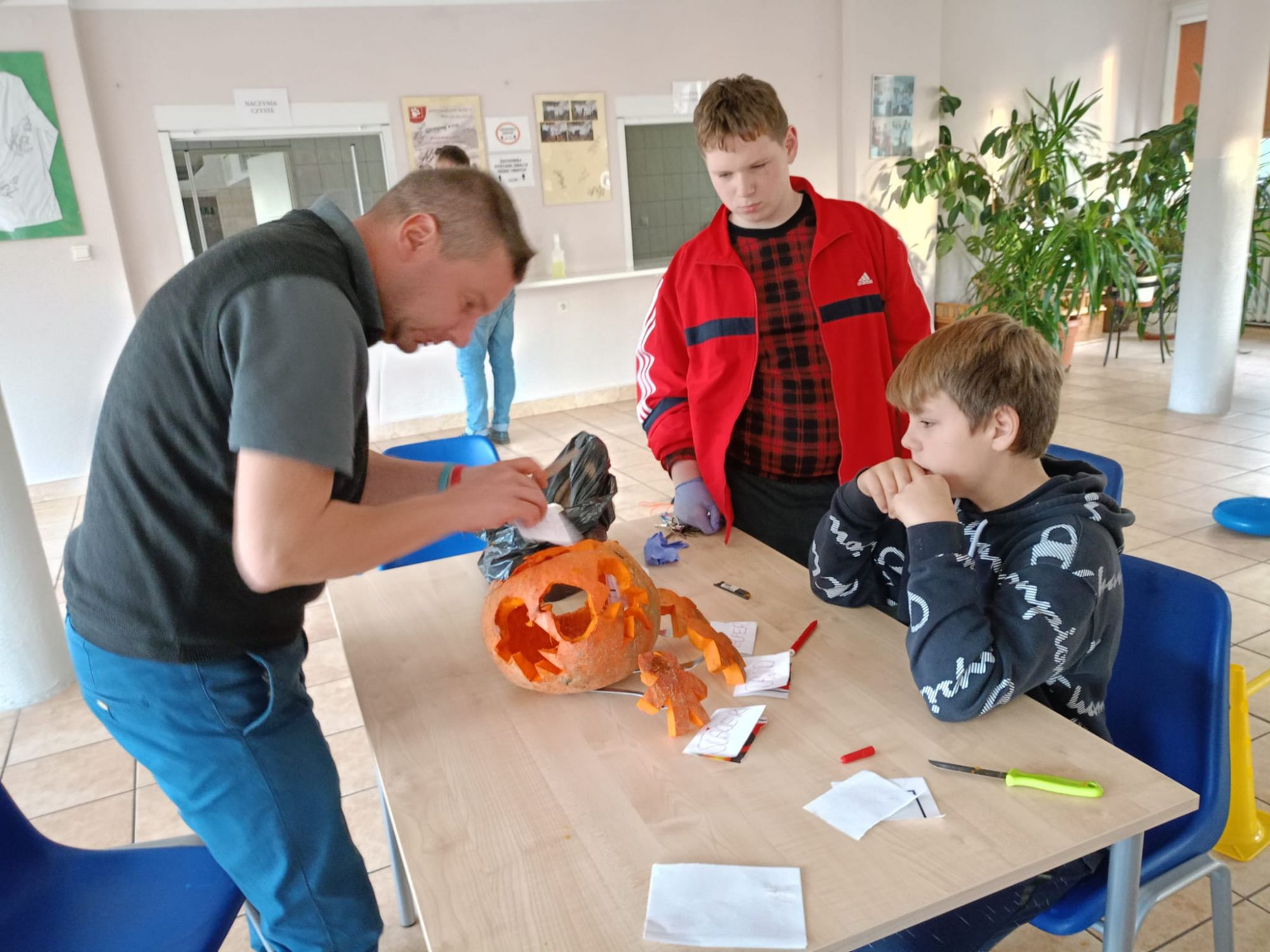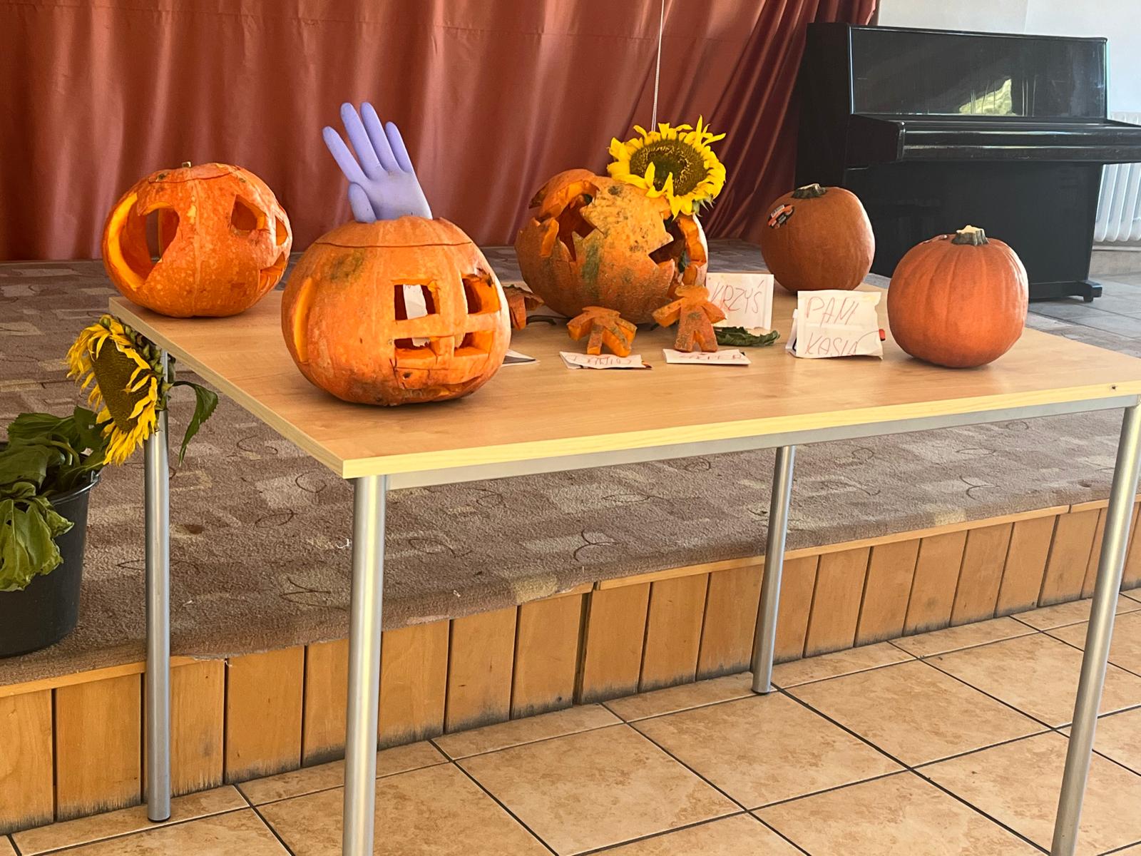 Następnie wszystkie trzy grupy otrzymały zadanie wycięcia najpiękniejszej dyni. Każda z grup przystąpiła do pracy tworząc wyjątkowe i pomysłowe dekoracje. Kreatywność wychowanków była imponująca, a wszystkie dynie zachwycały swoimi oryginalnymi wzorami.