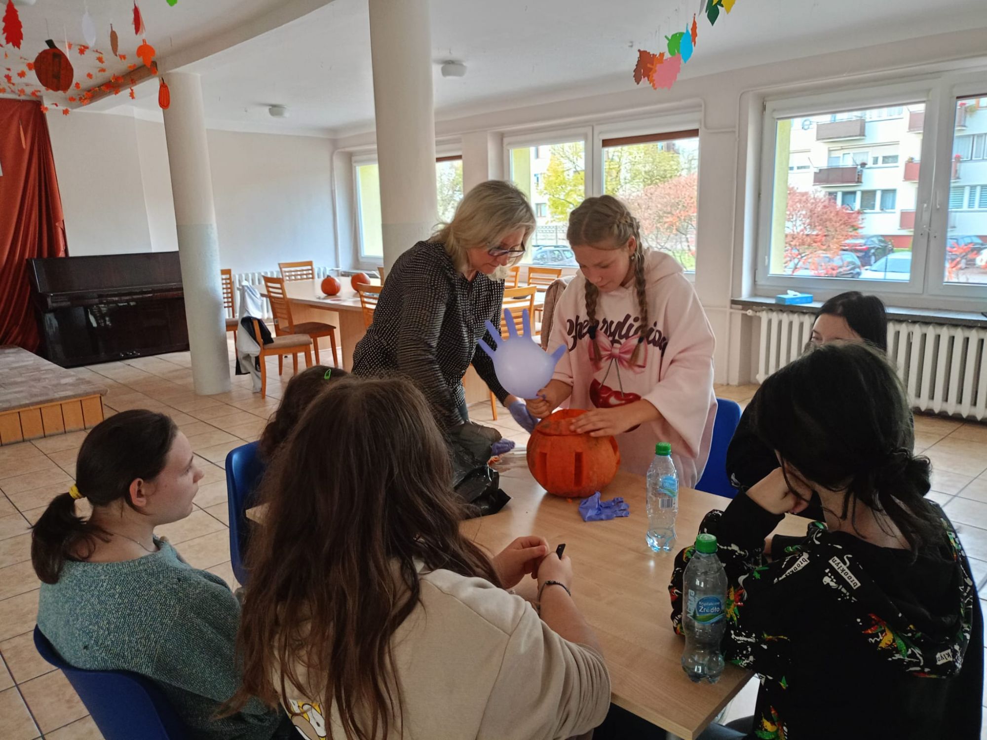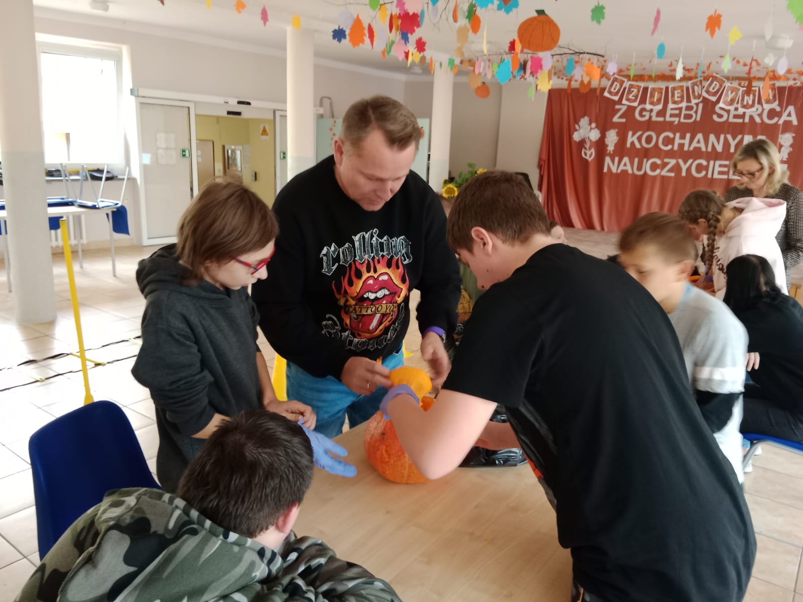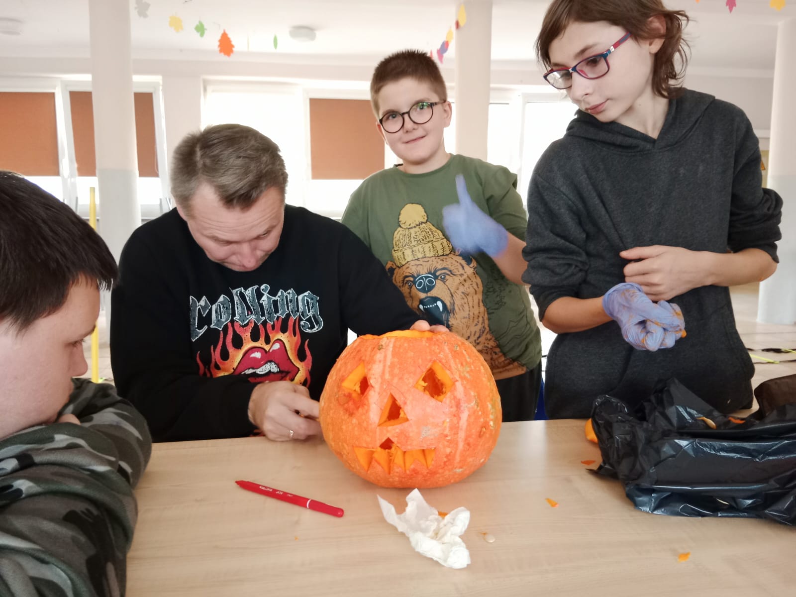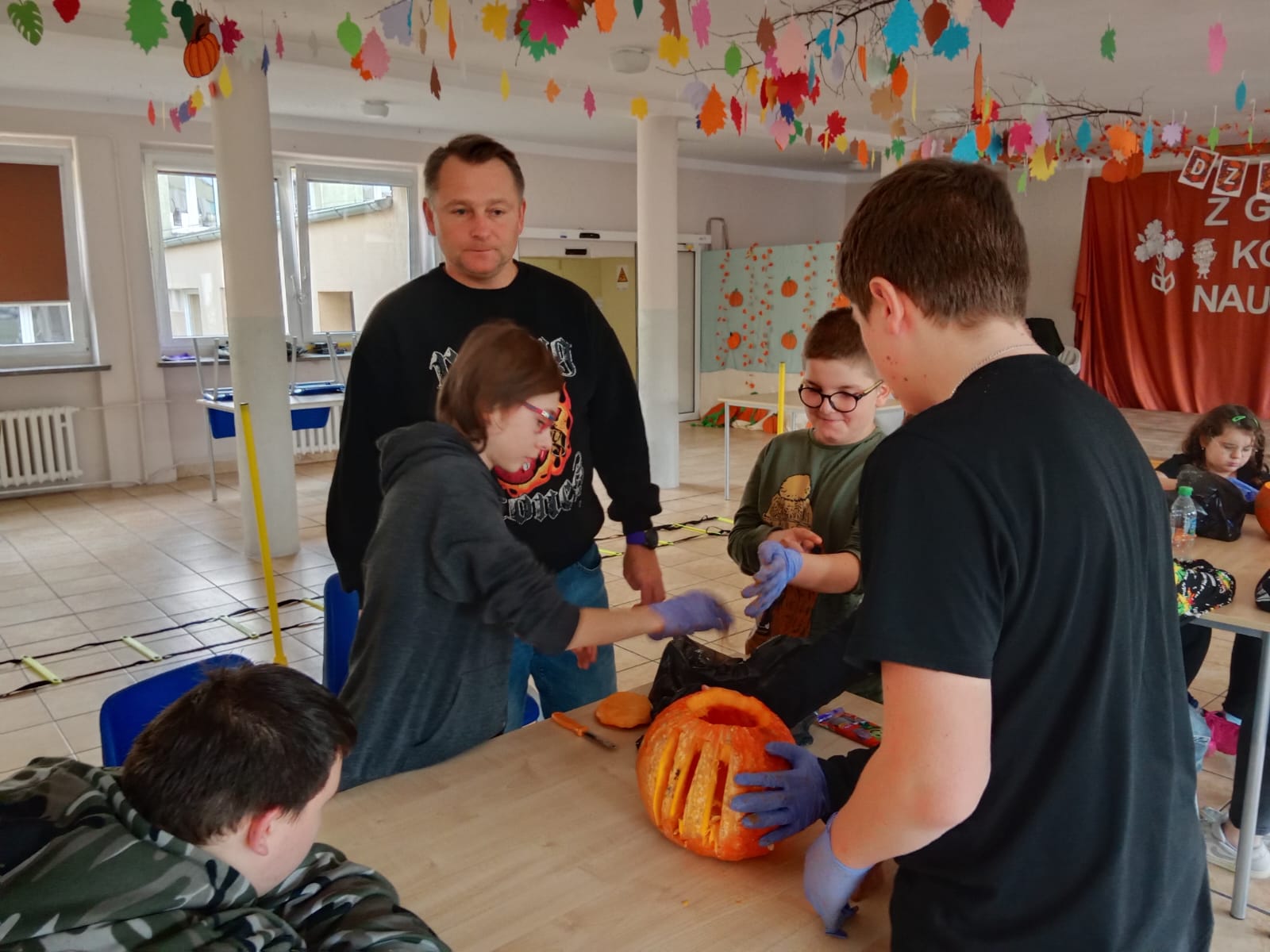 Następnie wszystkie trzy grupy otrzymały zadanie wycięcia najpiękniejszej dyni. Każda z grup przystąpiła do pracy tworząc wyjątkowe i pomysłowe dekoracje. Kreatywność wychowanków była imponująca, a wszystkie dynie zachwycały swoimi oryginalnymi wzorami.