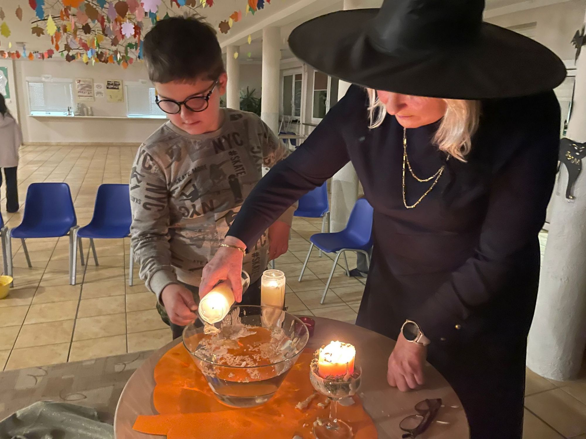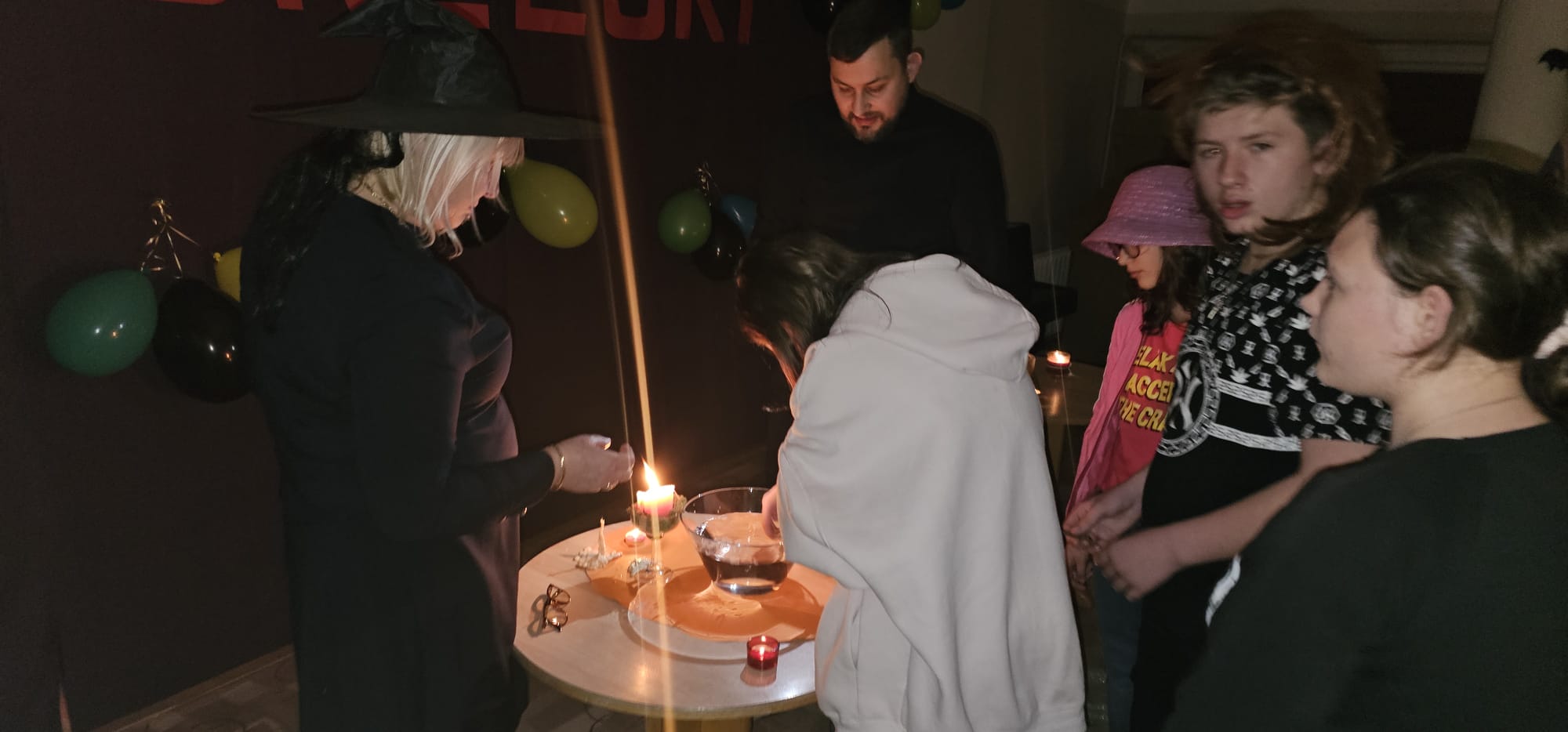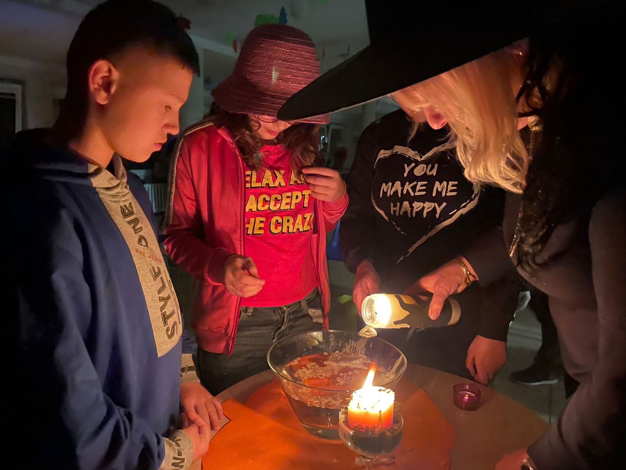 Atmosfera była niezwykła – półmrok, świece oraz dekoracje z motywami sów, księżyca i czarnych kotów przeniosły nas w tajemniczy świat magii. Wychowankowie mogli spróbować swoich sił w laniu wosku, wróżeniu z ciasteczek, wróżbach karteczkowych czy wróżbie z butami. Kreatywne interpretacje woskowych figur i mnóstwo śmiechu towarzyszyły każdej wróżbie.