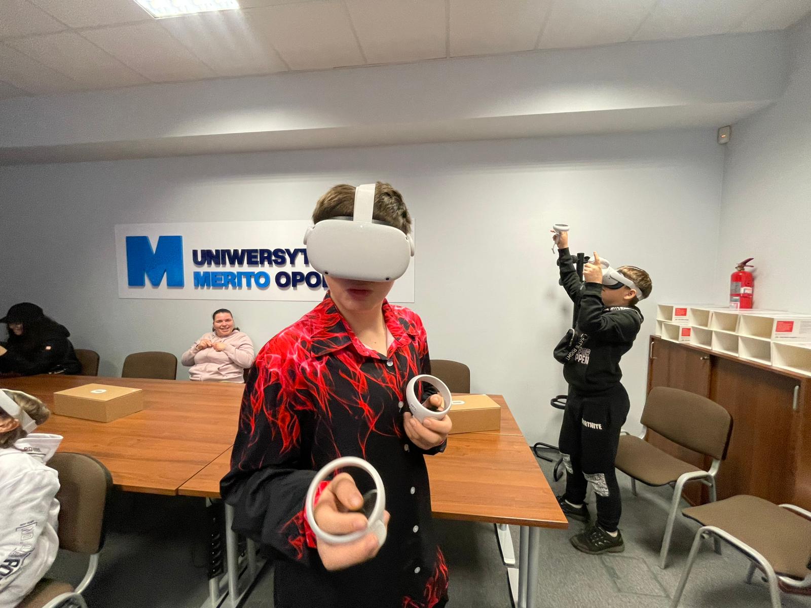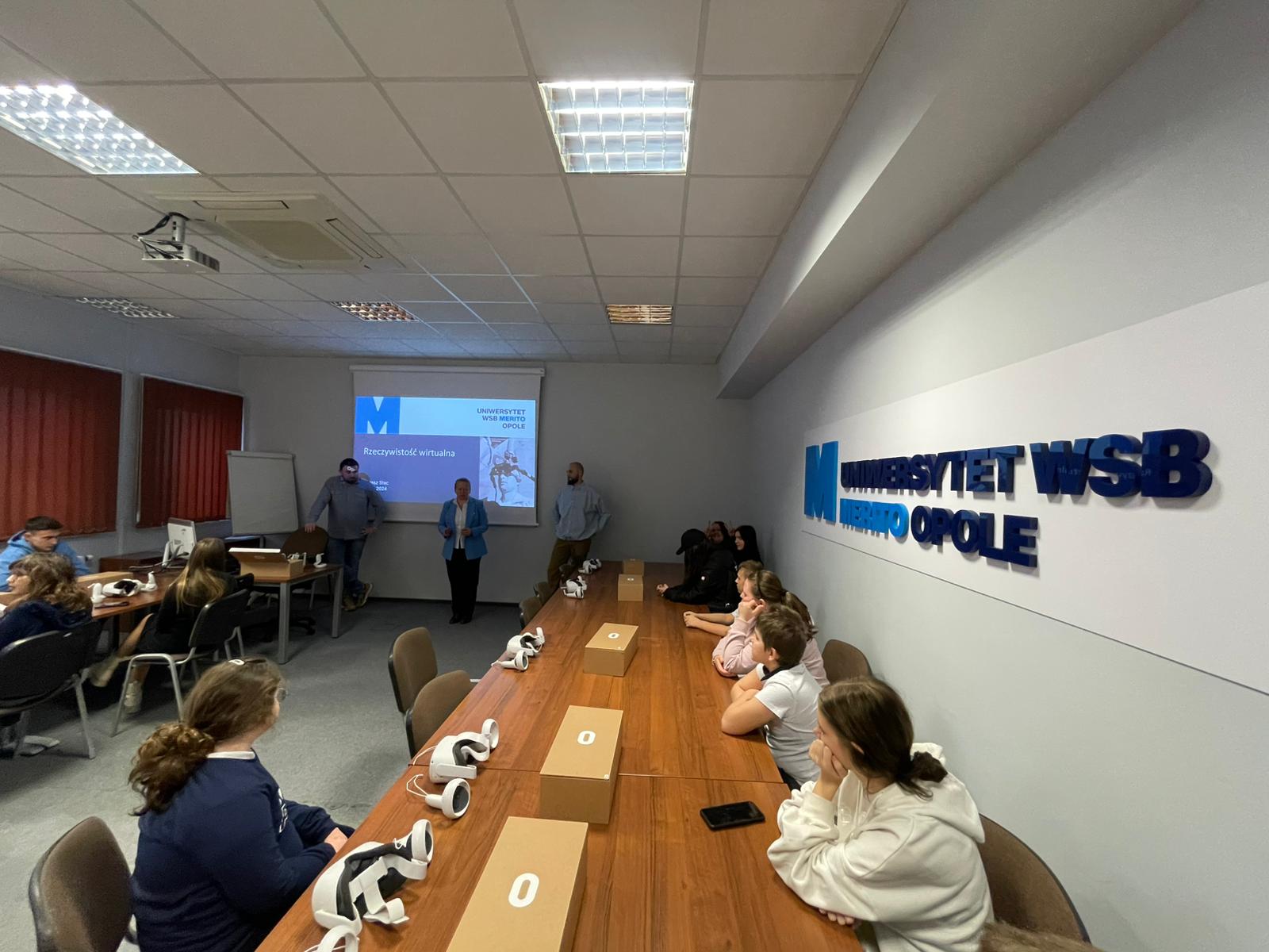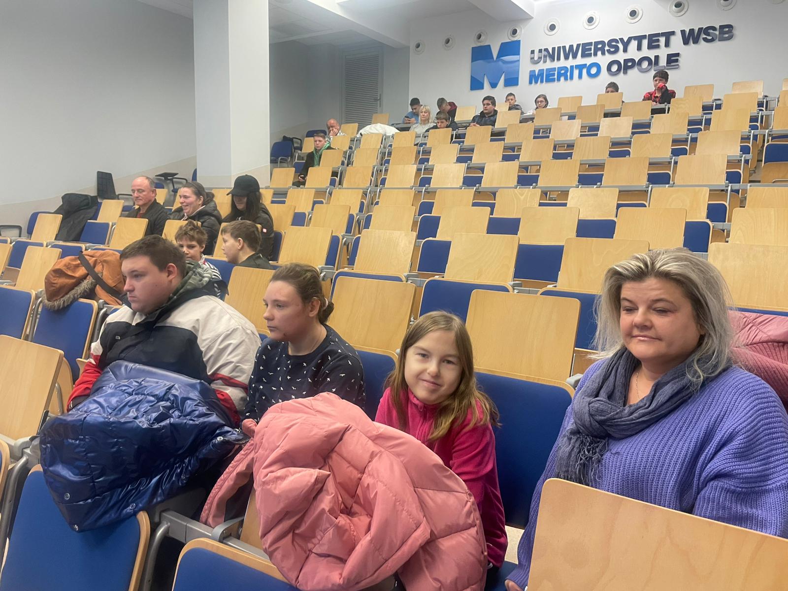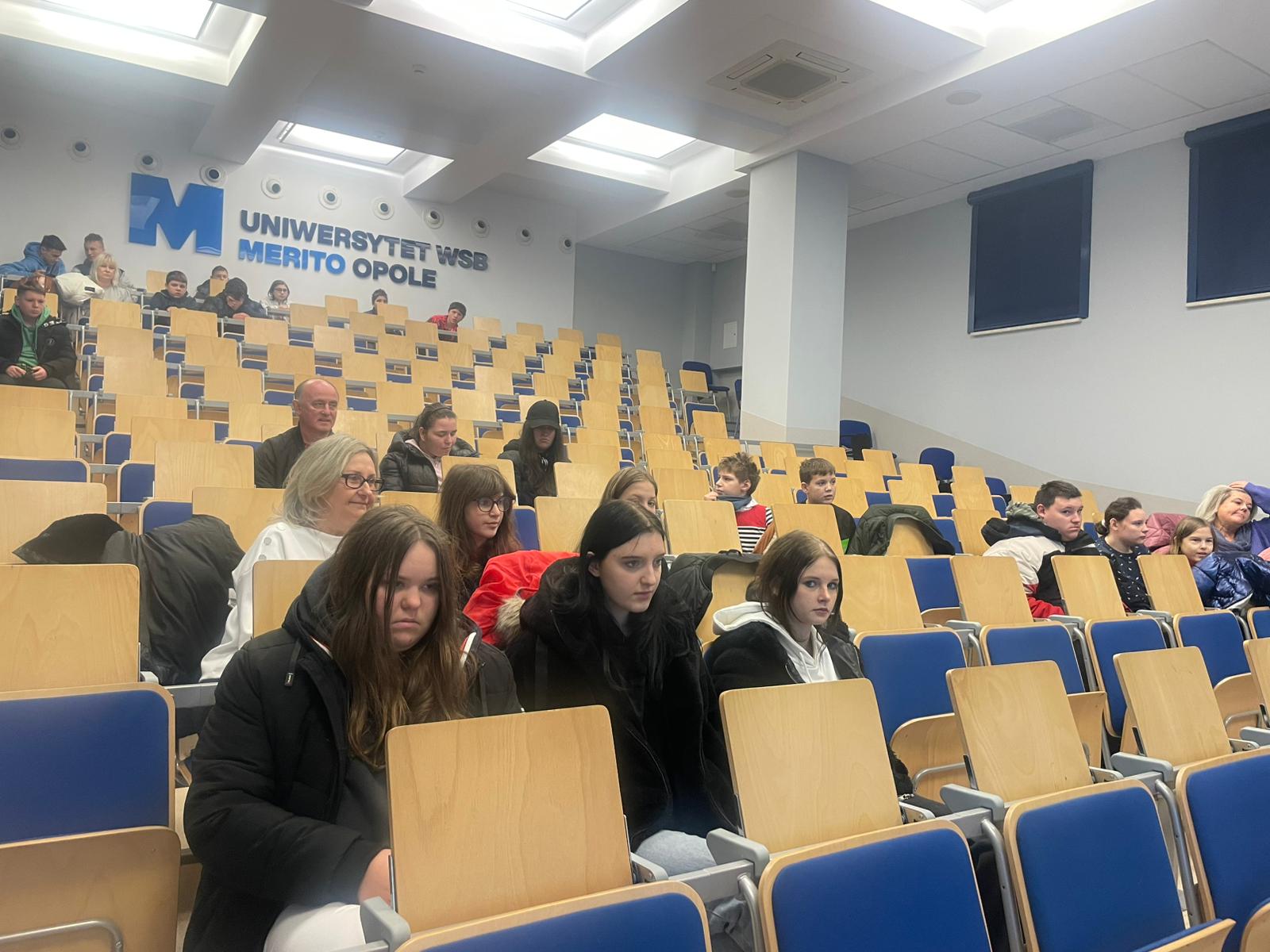 Pod opieką wychowawców uczestnicy brali udział w wydarzeniach przygotowanych przez Pracowników uczelni. Spotkanie rozpoczęło się od powitania tak znakomitych Gości przez Panią Elżbietę Modrzejewską – Pełnomocnika Dziekana ds. Osób z niepełnosprawnościami następnie młodzi adepci nauki po raz pierwszy uczestniczyli w wykładzie akademickim dotyczącym cyberbezpieczeństwa w przestrzeni szkolnej wygłoszonym przez Pana Sebastiana Wilczek. Po wykładzie rozpoczęliśmy zwiedzanie uczelni zmierzając na kolejne przygotowane warsztaty. Pokazana została nam biblioteka, Dział Obsługi Dydaktycznej, Dziekanaty oraz inne przestrzenie związane z nauką i czasem wolnym spędzonym przez studentów na uczelni. Dotarliśmy do sali dedykowanej treningom umiejętności społecznych - tam zaczęło się dopiero aktywne działanie początkowo grupowe, a następnie zespołowe. Dużo radości jak również skupienia okazało się zaliczeniem treningu. Trzecie wirtualne zajęcia przestrzenne było znane naszym wychowankom, ale nie na możliwość ich realizacji na taką skalę osób biorących udział w działaniu – nie chciało się wychodzić z tej pracowni gdzie warsztaty prowadzili Panowie Tomasz Stec i Sebastian Wilczek. Jednak pędzący czas sprawił, że powróciliśmy do miejsca początkowego czyli auli uniwersyteckiej, gdzie przygotowano dla nas test sprawdzający wiedzę ogólną, ku zdziwieniu Pani Elżbiety Modrzejewskiej i nas wychowawców nie było żadnej błędnej odpowiedzi ze strony naszej młodzieży. Etapem końcowym wizyty w Uniwersytecie WSB Merito w Opolu było złożenie sobie życzeń świątecznych oraz obdarowanie się wzajemnie upominkami. Przekazaliśmy na ręce Pani Pełnomocnik naszą magiczną choinkę spełniającą marzenia oraz kartkę z życzeniami. Wychowankowie naszego ośrodka otrzymali zestawy dla przyszłych naukowców, którymi na pewno się pochwalą w przestrzeni nie tylko szkolnej.