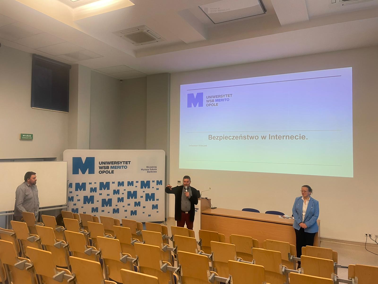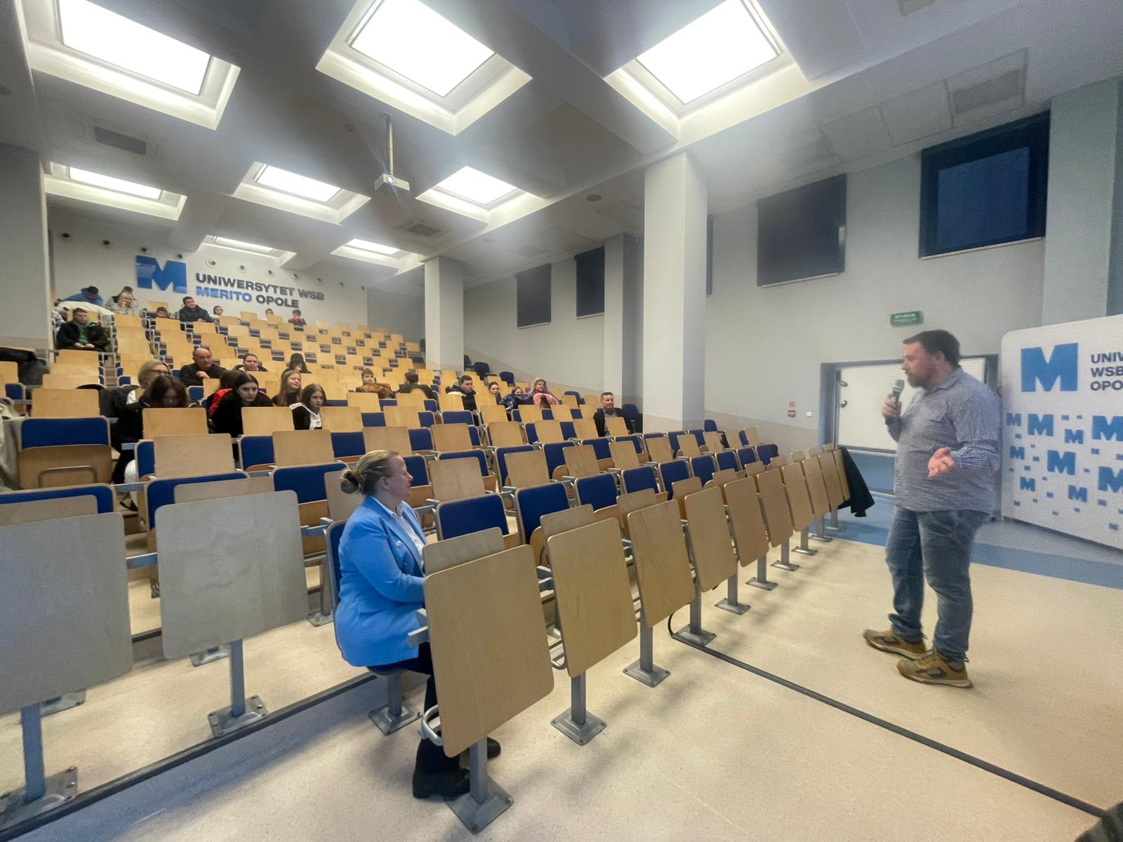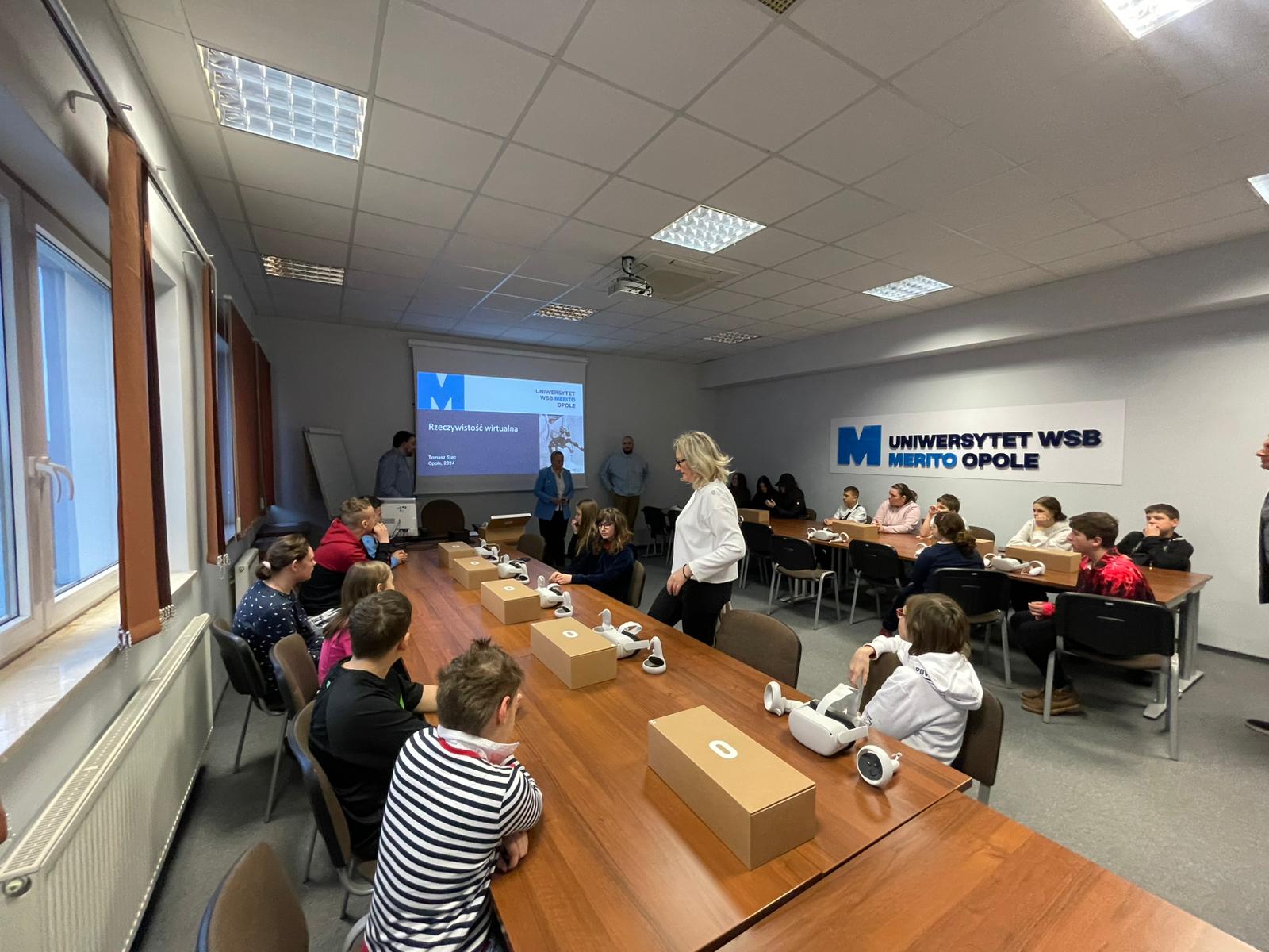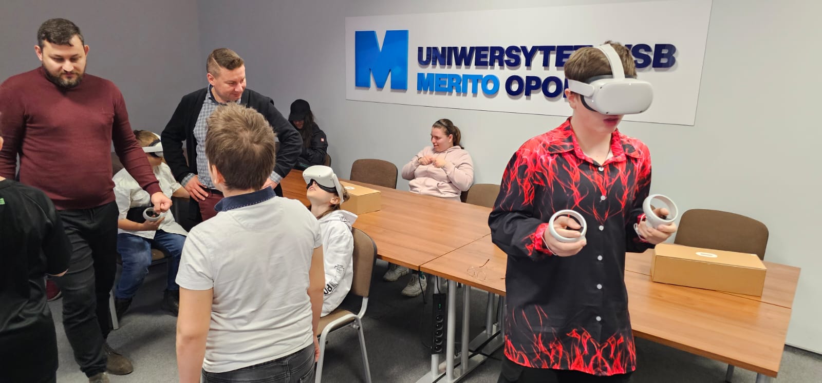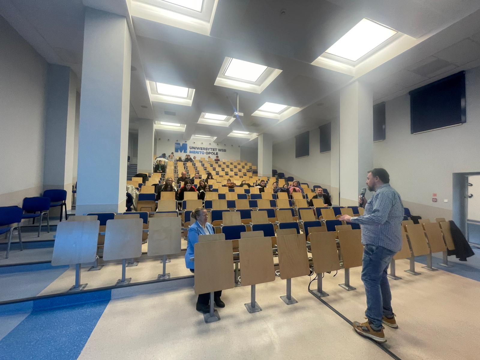 Pod opieką wychowawców uczestnicy brali udział w wydarzeniach przygotowanych przez Pracowników uczelni. Spotkanie rozpoczęło się od powitania tak znakomitych Gości przez Panią Elżbietę Modrzejewską – Pełnomocnika Dziekana ds. Osób z niepełnosprawnościami następnie młodzi adepci nauki po raz pierwszy uczestniczyli w wykładzie akademickim dotyczącym cyberbezpieczeństwa w przestrzeni szkolnej wygłoszonym przez Pana Sebastiana Wilczek. Po wykładzie rozpoczęliśmy zwiedzanie uczelni zmierzając na kolejne przygotowane warsztaty. Pokazana została nam biblioteka, Dział Obsługi Dydaktycznej, Dziekanaty oraz inne przestrzenie związane z nauką i czasem wolnym spędzonym przez studentów na uczelni. Dotarliśmy do sali dedykowanej treningom umiejętności społecznych - tam zaczęło się dopiero aktywne działanie początkowo grupowe, a następnie zespołowe. Dużo radości jak również skupienia okazało się zaliczeniem treningu. Trzecie wirtualne zajęcia przestrzenne było znane naszym wychowankom, ale nie na możliwość ich realizacji na taką skalę osób biorących udział w działaniu – nie chciało się wychodzić z tej pracowni gdzie warsztaty prowadzili Panowie Tomasz Stec i Sebastian Wilczek. Jednak pędzący czas sprawił, że powróciliśmy do miejsca początkowego czyli auli uniwersyteckiej, gdzie przygotowano dla nas test sprawdzający wiedzę ogólną, ku zdziwieniu Pani Elżbiety Modrzejewskiej i nas wychowawców nie było żadnej błędnej odpowiedzi ze strony naszej młodzieży. Etapem końcowym wizyty w Uniwersytecie WSB Merito w Opolu było złożenie sobie życzeń świątecznych oraz obdarowanie się wzajemnie upominkami. Przekazaliśmy na ręce Pani Pełnomocnik naszą magiczną choinkę spełniającą marzenia oraz kartkę z życzeniami. Wychowankowie naszego ośrodka otrzymali zestawy dla przyszłych naukowców, którymi na pewno się pochwalą w przestrzeni nie tylko szkolnej.