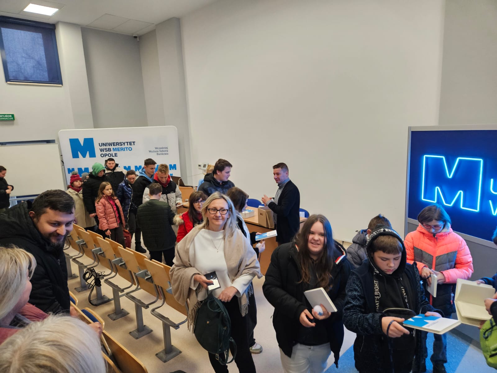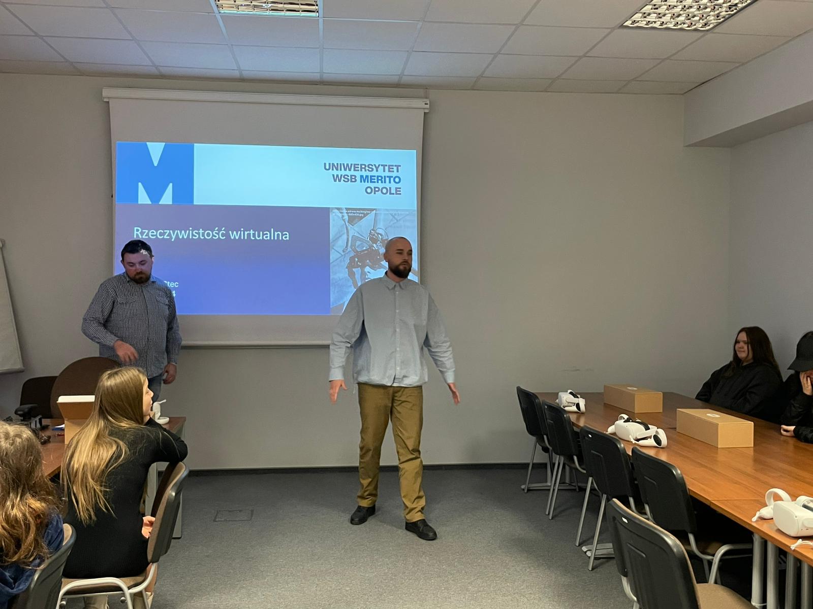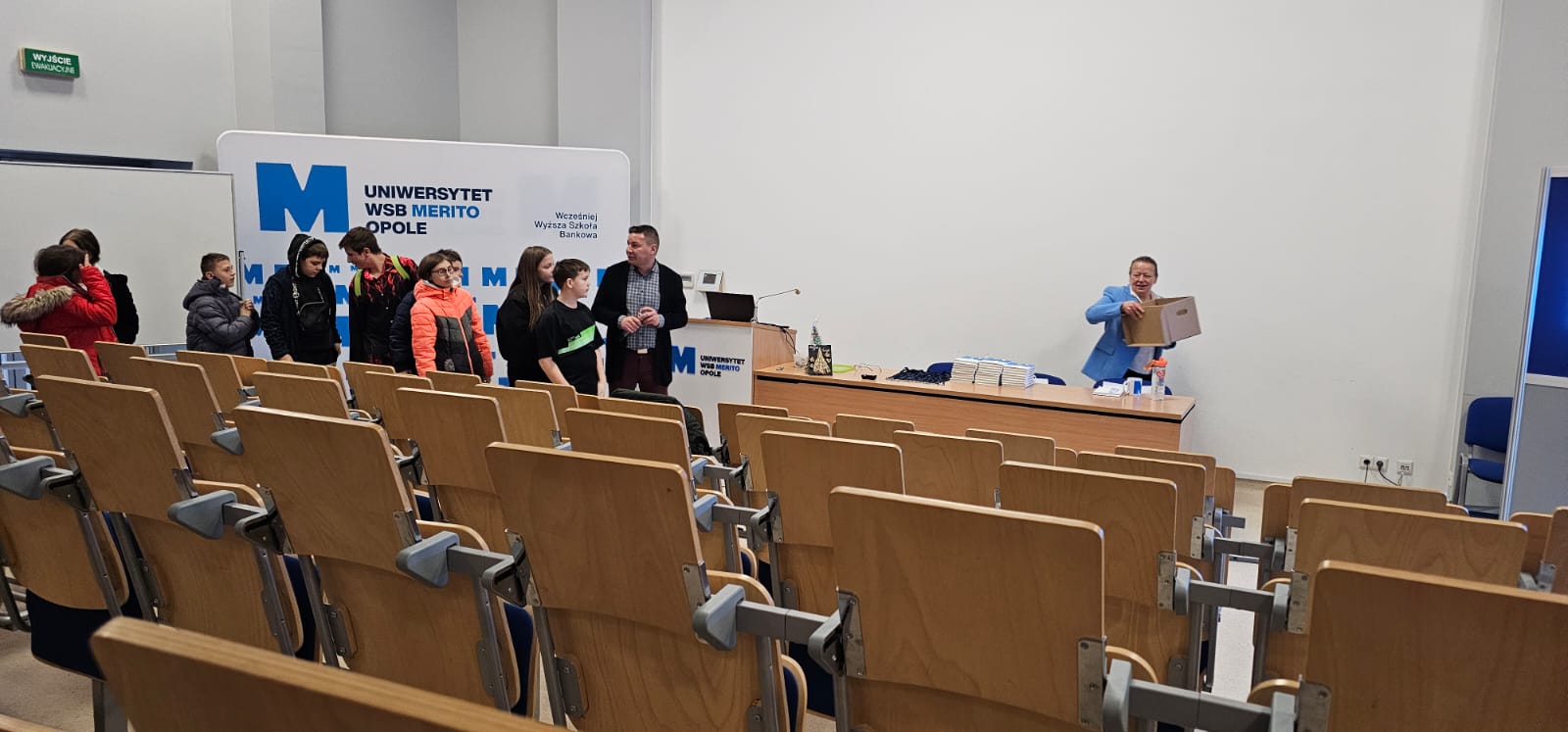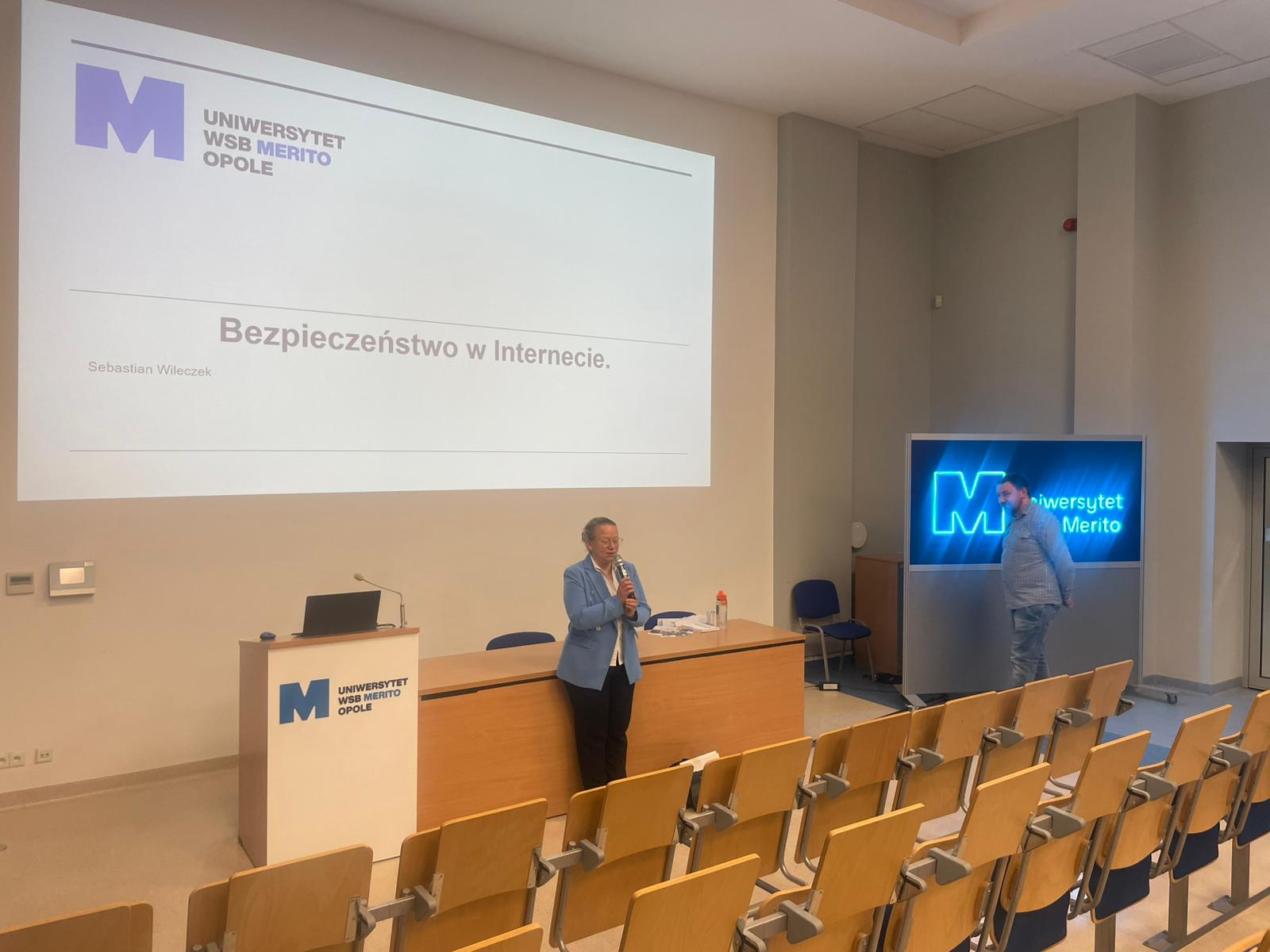 Pod opieką wychowawców uczestnicy brali udział w wydarzeniach przygotowanych przez Pracowników uczelni. Spotkanie rozpoczęło się od powitania tak znakomitych Gości przez Panią Elżbietę Modrzejewską – Pełnomocnika Dziekana ds. Osób z niepełnosprawnościami następnie młodzi adepci nauki po raz pierwszy uczestniczyli w wykładzie akademickim dotyczącym cyberbezpieczeństwa w przestrzeni szkolnej wygłoszonym przez Pana Sebastiana Wilczek. Po wykładzie rozpoczęliśmy zwiedzanie uczelni zmierzając na kolejne przygotowane warsztaty. Pokazana została nam biblioteka, Dział Obsługi Dydaktycznej, Dziekanaty oraz inne przestrzenie związane z nauką i czasem wolnym spędzonym przez studentów na uczelni. Dotarliśmy do sali dedykowanej treningom umiejętności społecznych - tam zaczęło się dopiero aktywne działanie początkowo grupowe, a następnie zespołowe. Dużo radości jak również skupienia okazało się zaliczeniem treningu. Trzecie wirtualne zajęcia przestrzenne było znane naszym wychowankom, ale nie na możliwość ich realizacji na taką skalę osób biorących udział w działaniu – nie chciało się wychodzić z tej pracowni gdzie warsztaty prowadzili Panowie Tomasz Stec i Sebastian Wilczek. Jednak pędzący czas sprawił, że powróciliśmy do miejsca początkowego czyli auli uniwersyteckiej, gdzie przygotowano dla nas test sprawdzający wiedzę ogólną, ku zdziwieniu Pani Elżbiety Modrzejewskiej i nas wychowawców nie było żadnej błędnej odpowiedzi ze strony naszej młodzieży. Etapem końcowym wizyty w Uniwersytecie WSB Merito w Opolu było złożenie sobie życzeń świątecznych oraz obdarowanie się wzajemnie upominkami. Przekazaliśmy na ręce Pani Pełnomocnik naszą magiczną choinkę spełniającą marzenia oraz kartkę z życzeniami. Wychowankowie naszego ośrodka otrzymali zestawy dla przyszłych naukowców, którymi na pewno się pochwalą w przestrzeni nie tylko szkolnej.