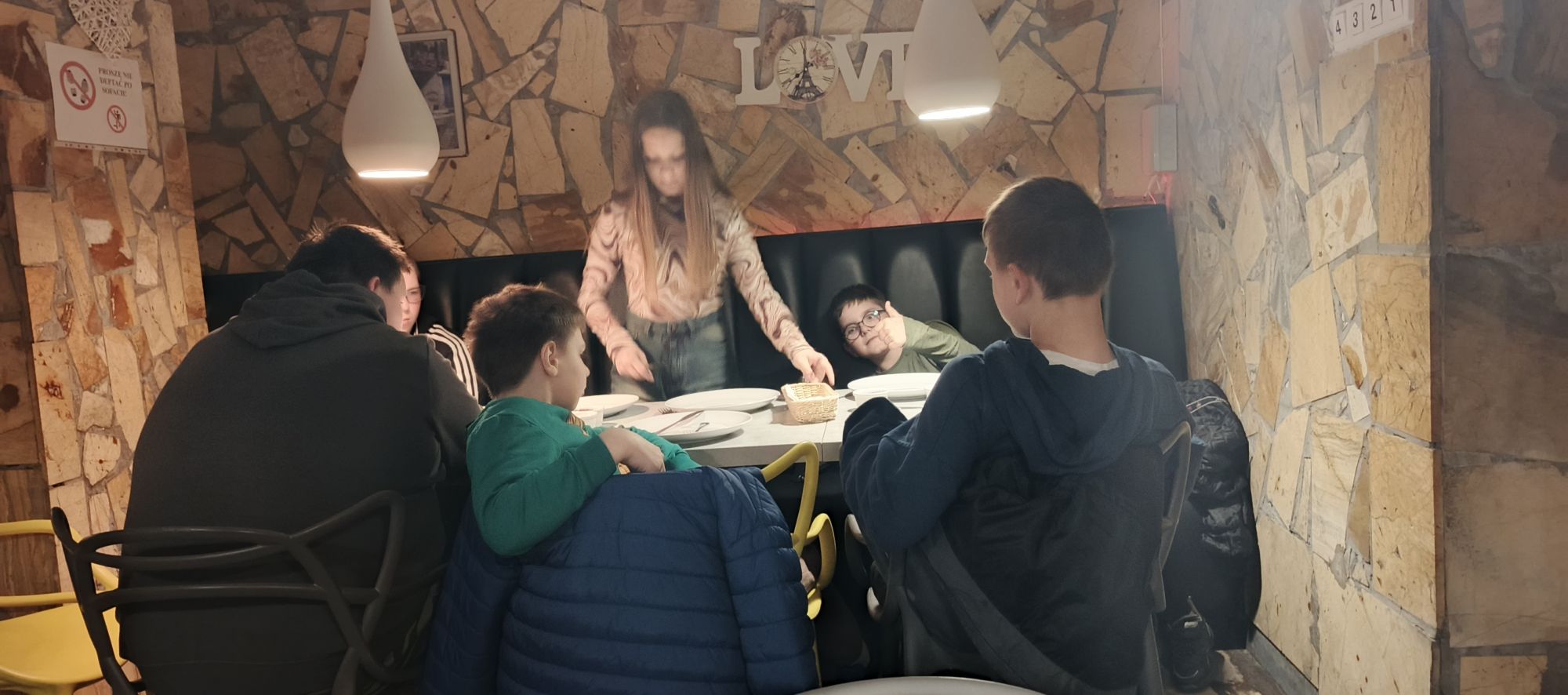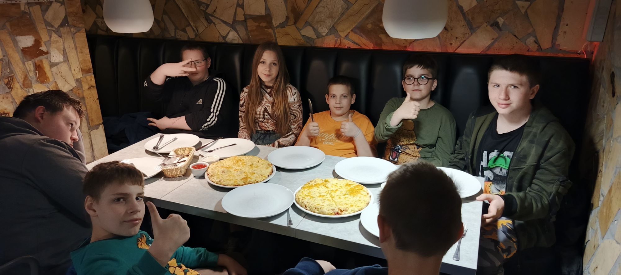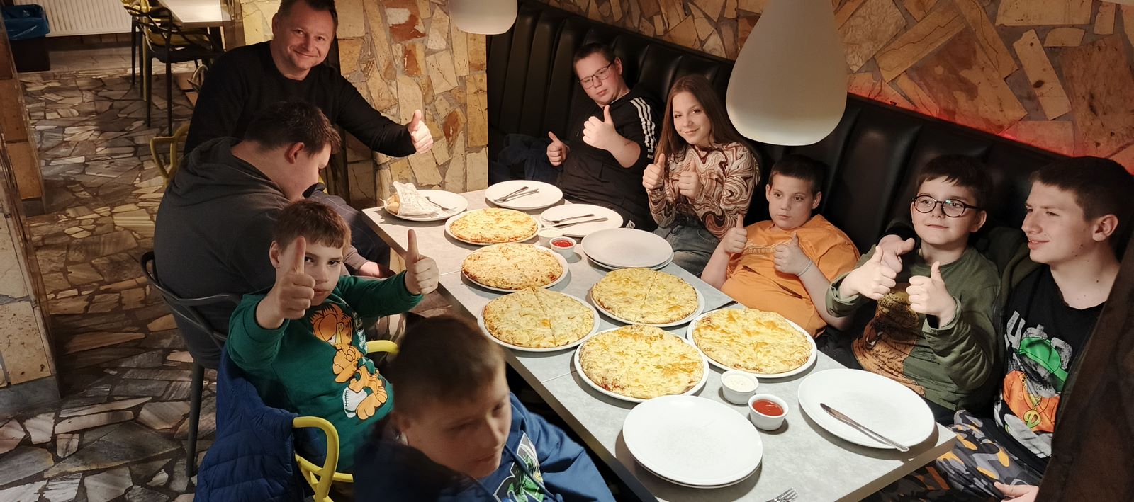 W ramach zajęć z doradztwa zawodowego Pan Jan Jędrychowski oraz Pan Sławomir Kudliński wspólnie z wychowankami grup wychowawczych udali się do pizzerii.