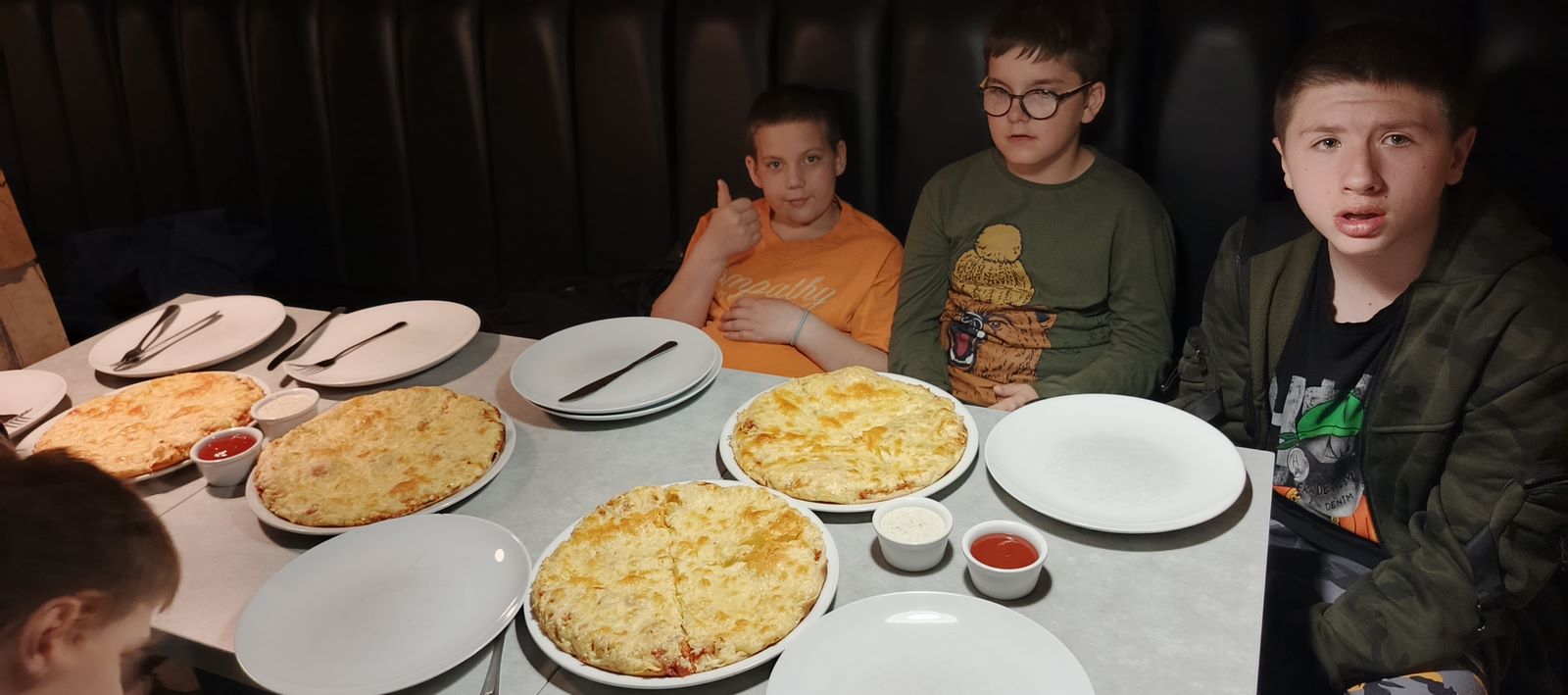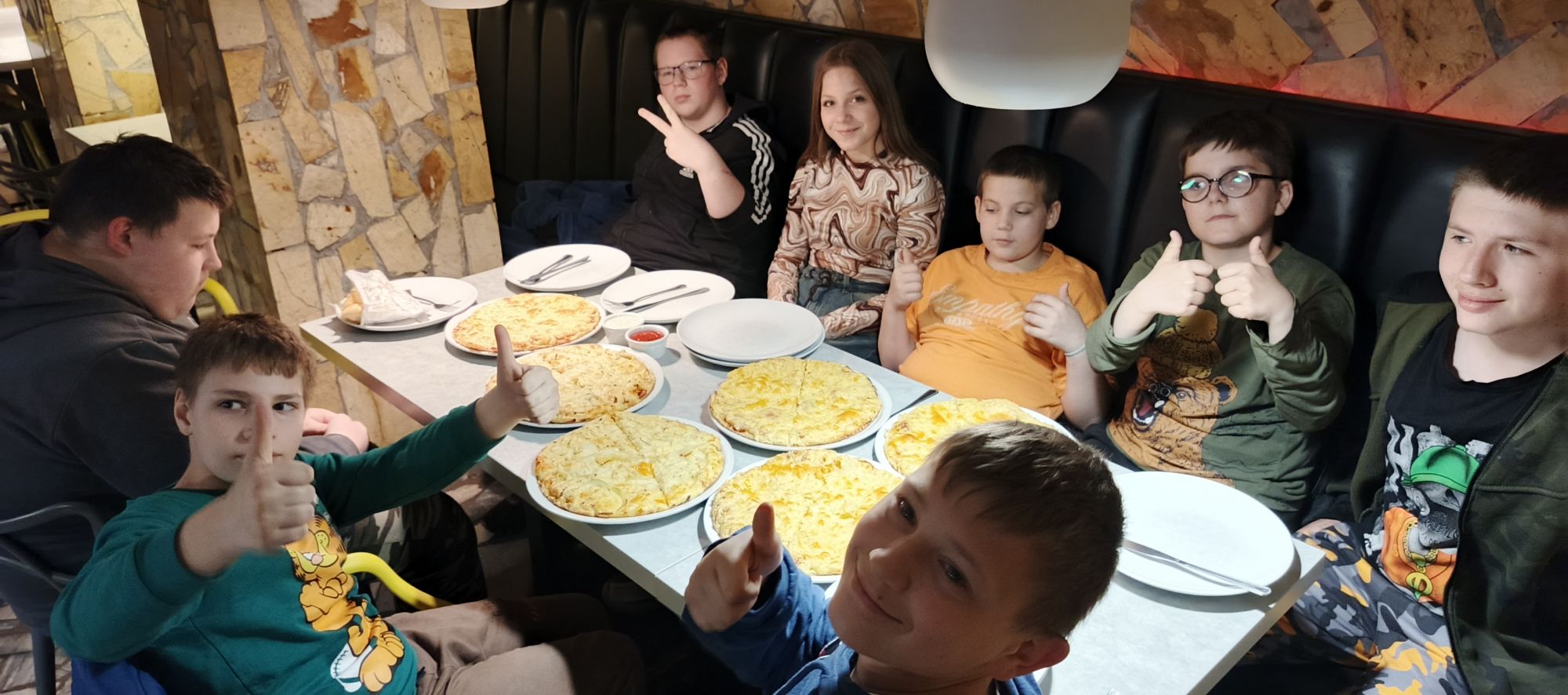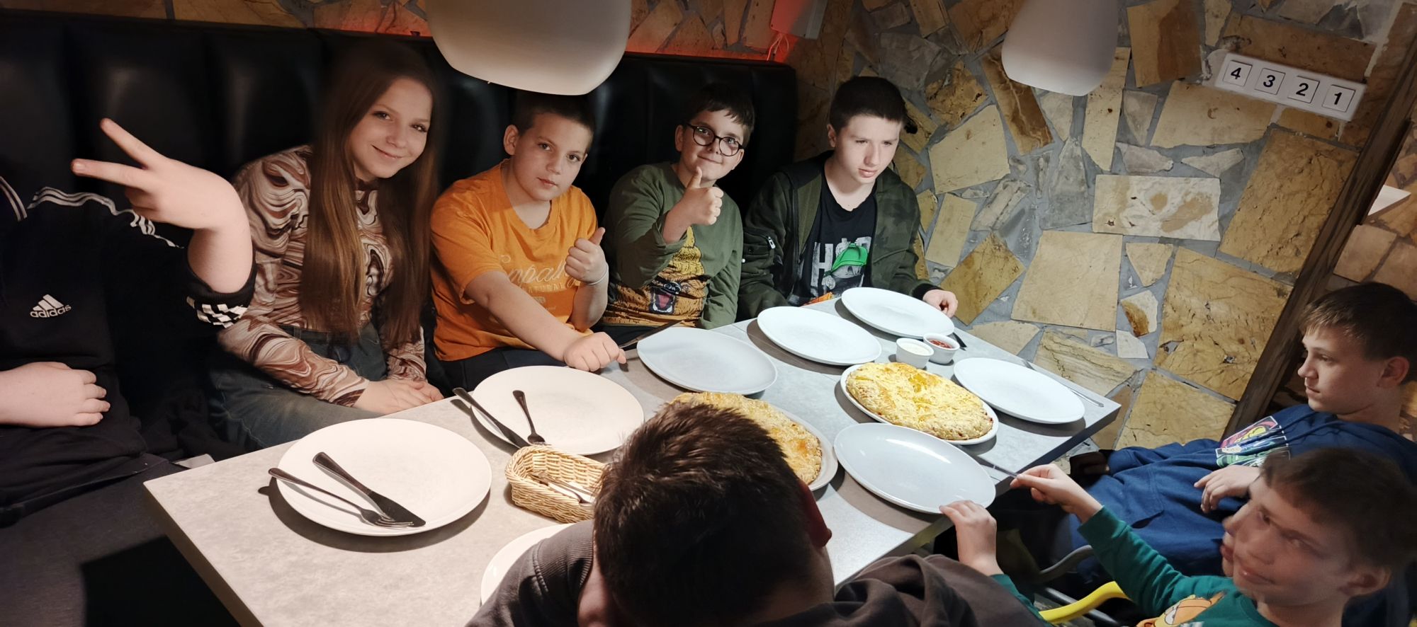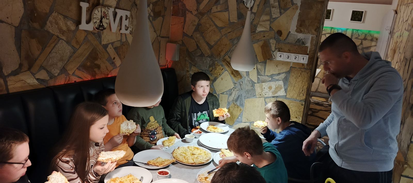 W ramach zajęć z doradztwa zawodowego Pan Jan Jędrychowski oraz Pan Sławomir Kudliński wspólnie z wychowankami grup wychowawczych udali się do pizzerii.