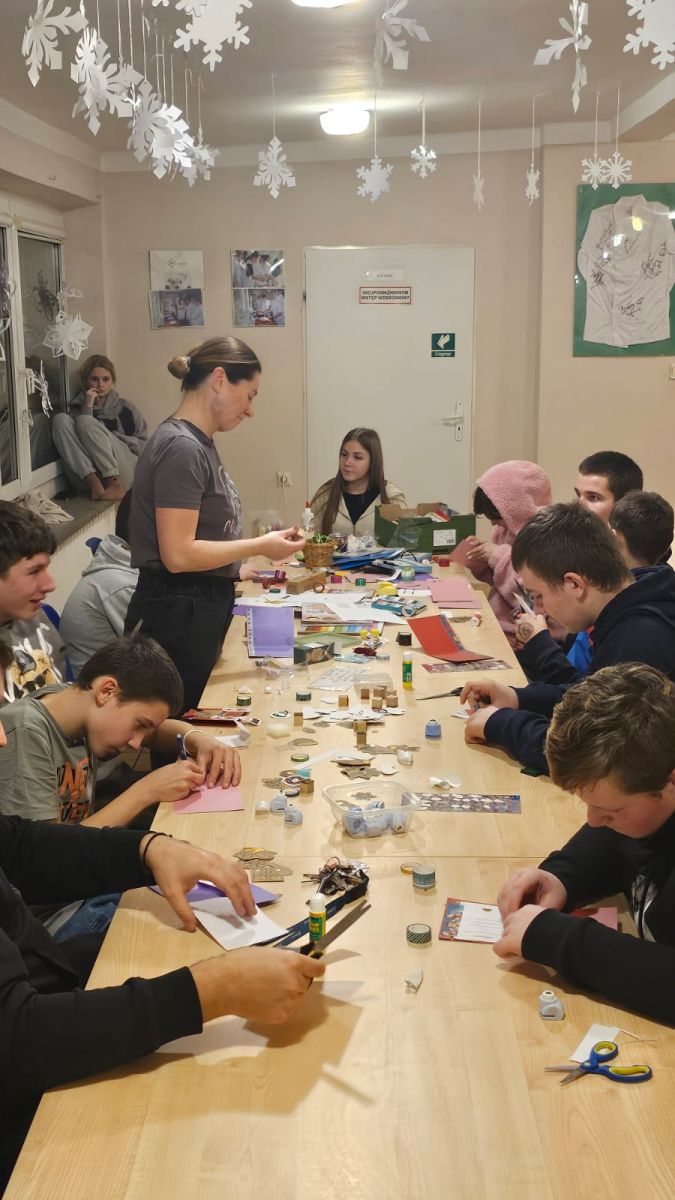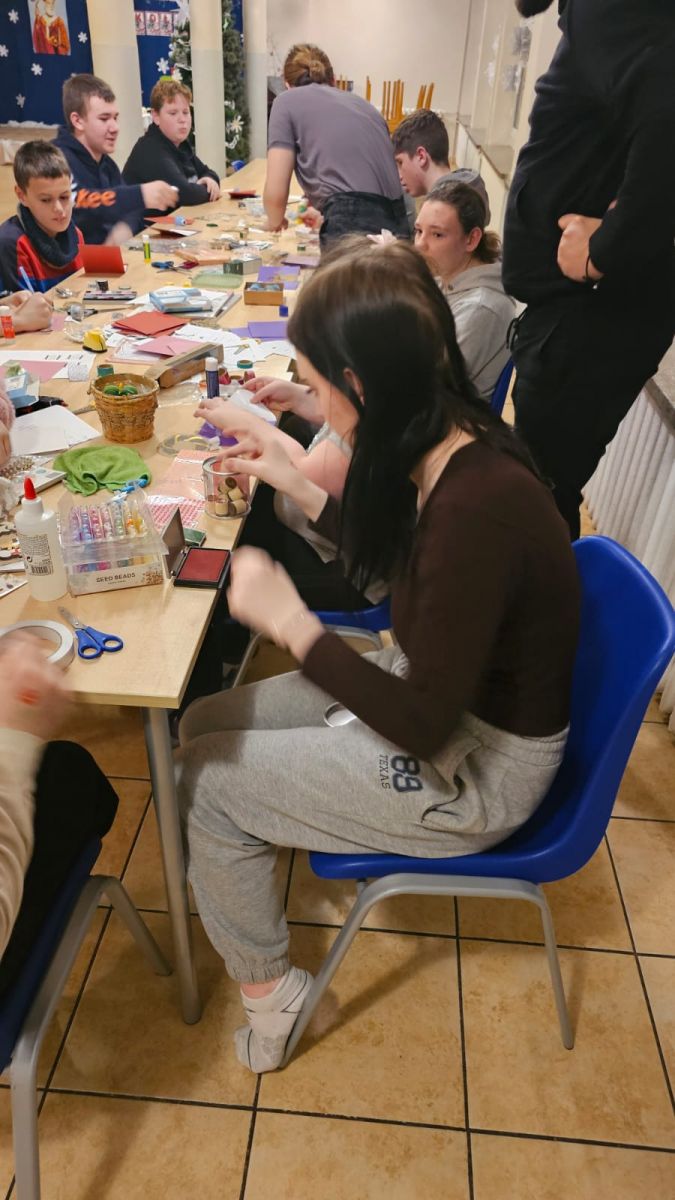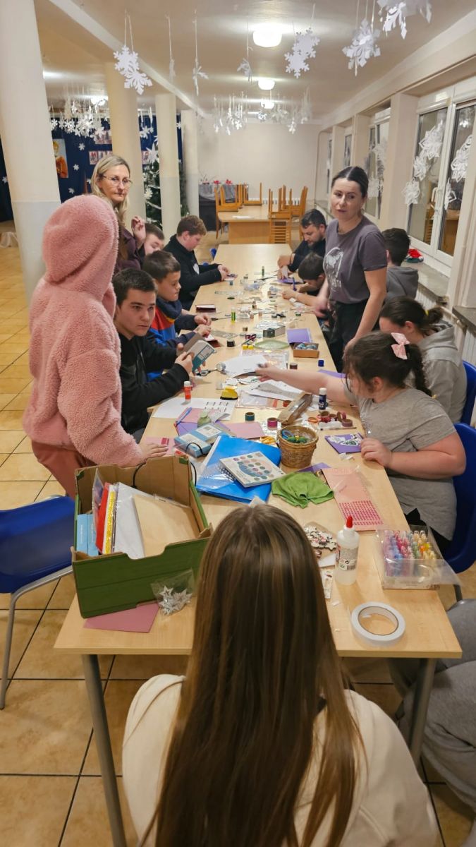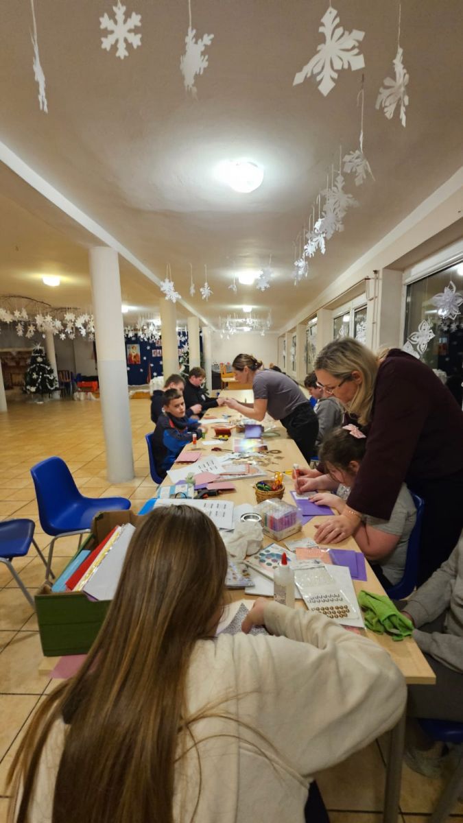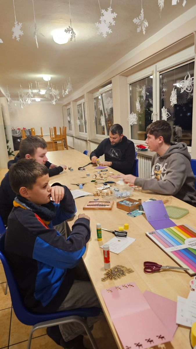 Pod okiem wychowawców wychowankowie własnoręcznie tworzyli niepowtarzalne kartki świąteczne. Każda z nich była małym dziełem sztuki, w które młodzi artyści włożyli całe swoje serce. Na kartkach znalazły się ciepłe życzenia oraz zaproszenia dla rodziców na uroczystą kolację wigilijną, połączoną z przygotowywanym przez dzieci występem artystycznym.