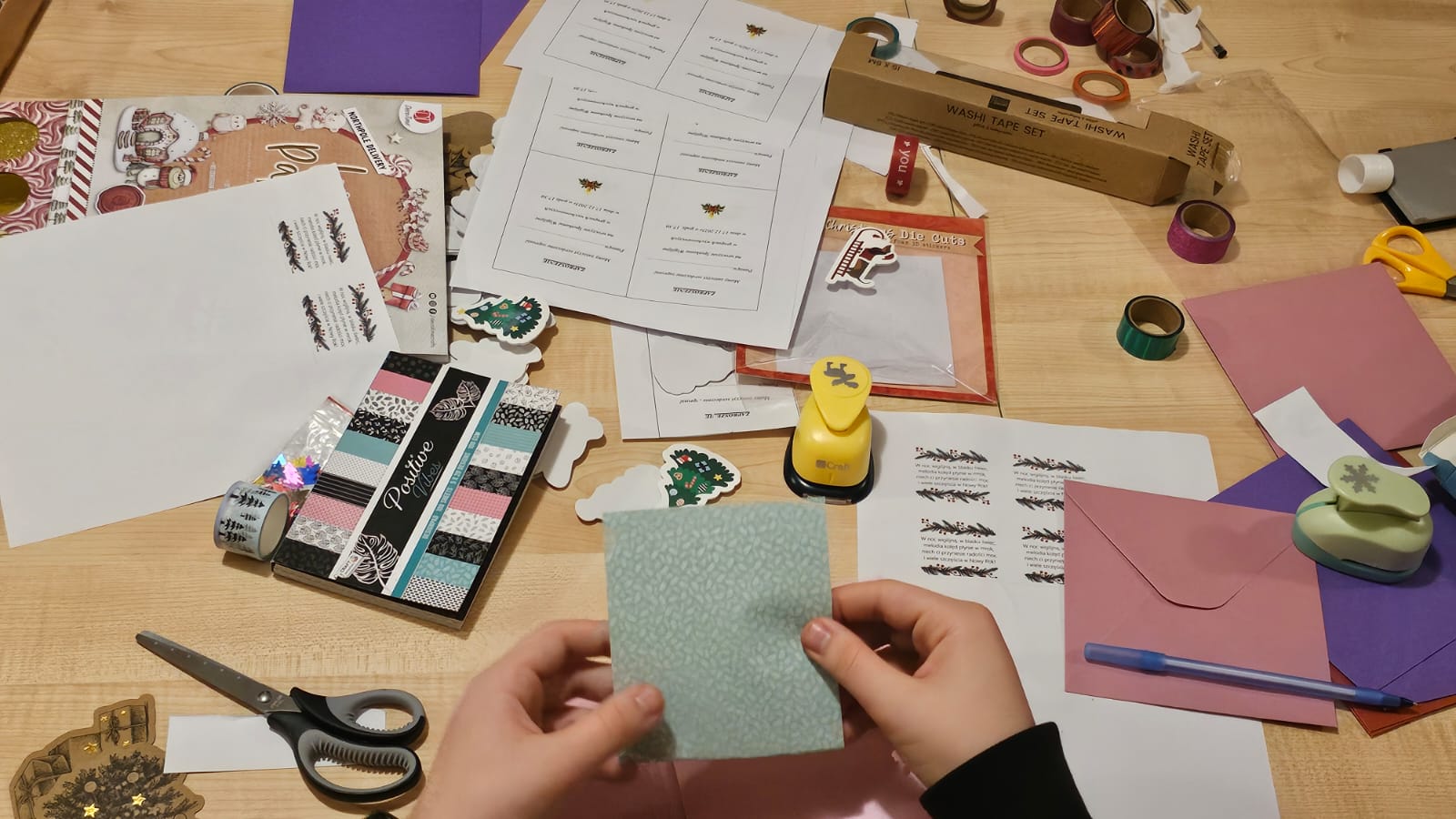 W sali wyczuwalna była prawdziwa magia zbliżających się świąt — w tle rozbrzmiewały świąteczne utwory, które wprowadzały wszystkich w radosny, zimowy nastrój. Uczestnicy z zaangażowaniem i kreatywnością pracowali nad swoimi projektami, tworząc piękne i pełne serca kartki.