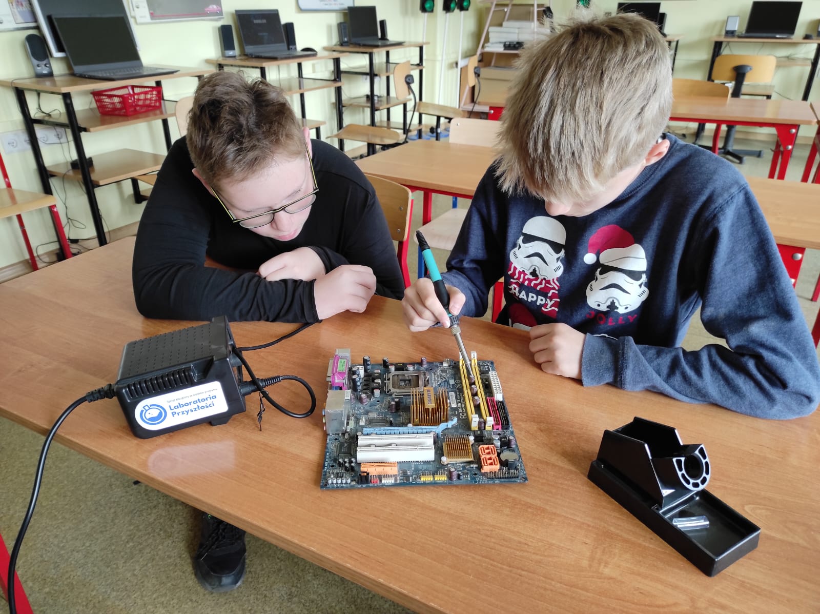 Na zajęciach techniki uczniowie omawiali szczegółowo budowę, oraz zastosowanie lutownicy, która została pozyskana w ramach projektu – „Laboratoria Przyszłości”.